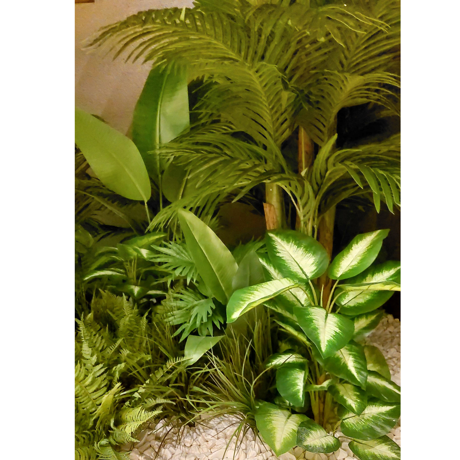 - Malzeme: Çok katmanlı, ultra gerçekçi tropik yapay bitki kompozisyonu (Areka palmiyesi, Strelitzia, Difenbahya, eğrelti otları), doğal beyaz dolomit taşları.