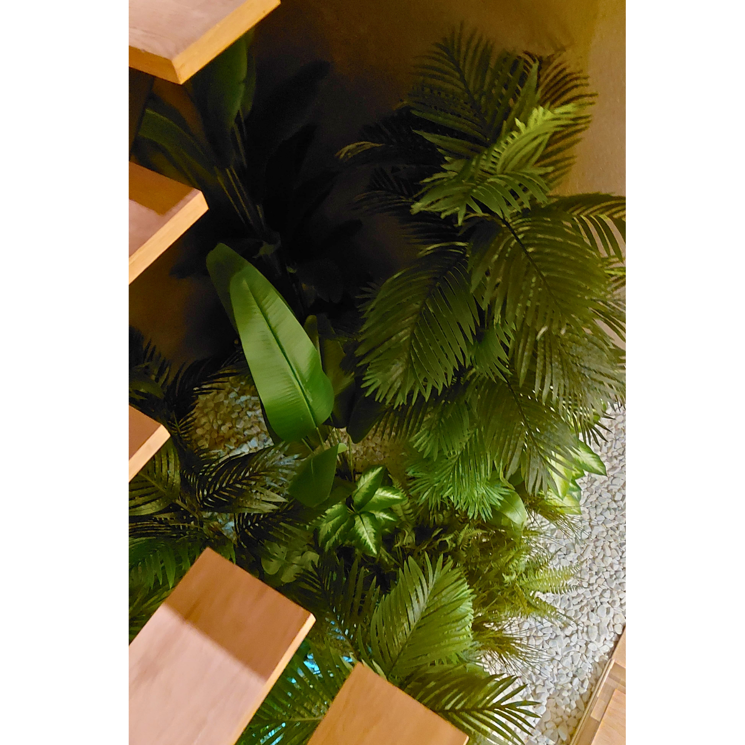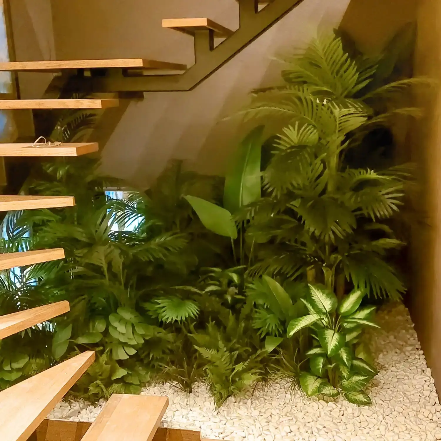 Merdiven Altı Botanik Bahçe Tasarımı, ev veya ofislerdeki merdiven altı gibi atıl ve karanlık alanları, özel olarak tasarlanmış yapay bitki ve doğal taş kompozisyonlarıyla estetik ve işlevsel bir hale getiren bir iç mekan projesidir. Bu tasarım, sadece boşluğu doldurmakla kalmaz, aynı zamanda evin mimarisine organik bir unsur ekleyerek mekana ruh ve karakter katar. Herdekora olarak bu uygulamada kullandığımız ultra gerçekçi Areka palmiyeleri, dev Strelitzia yaprakları ve zarif eğrelti otları, evinize doğanın dinginliğini ve enerjisini taşıyan, göz alıcı bir sanat eseri yaratır.