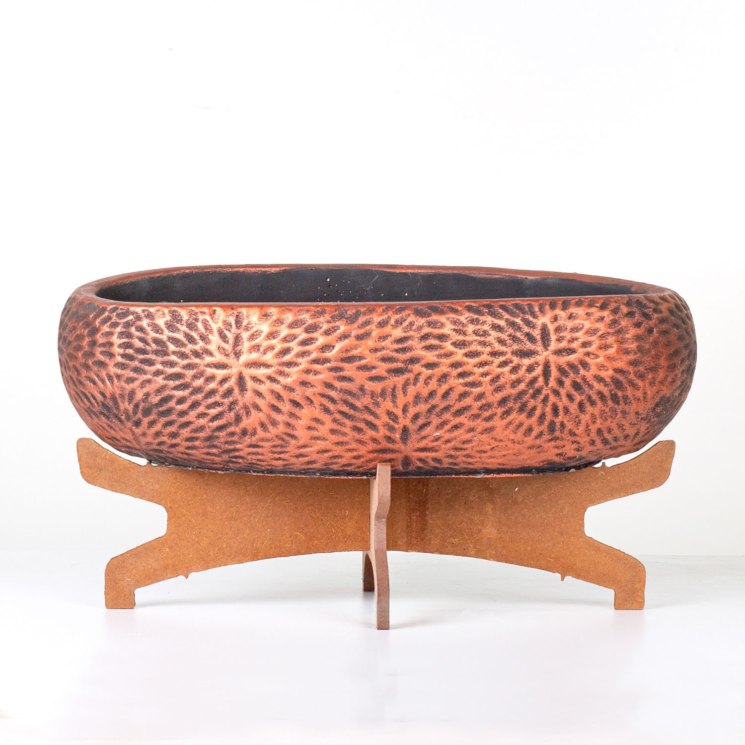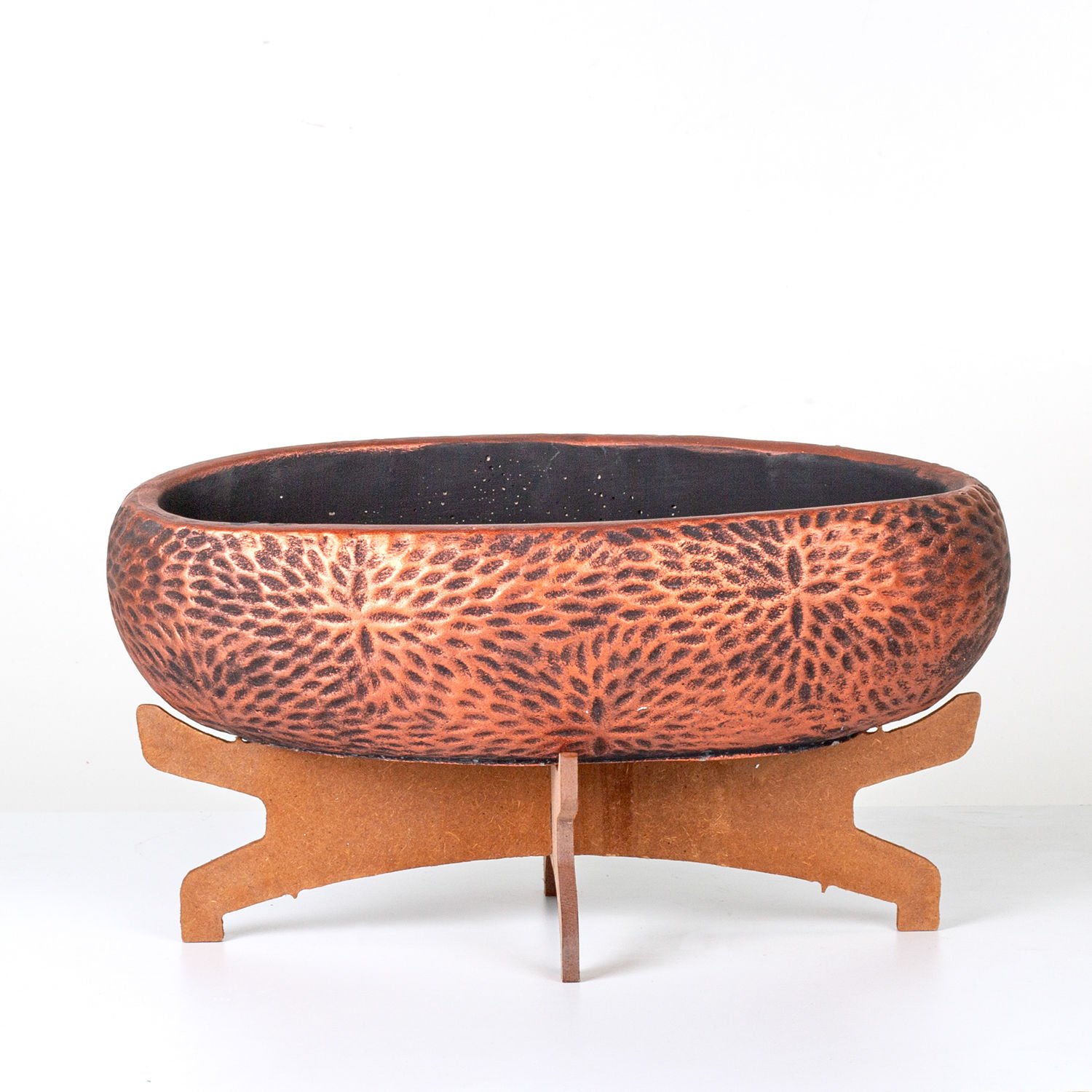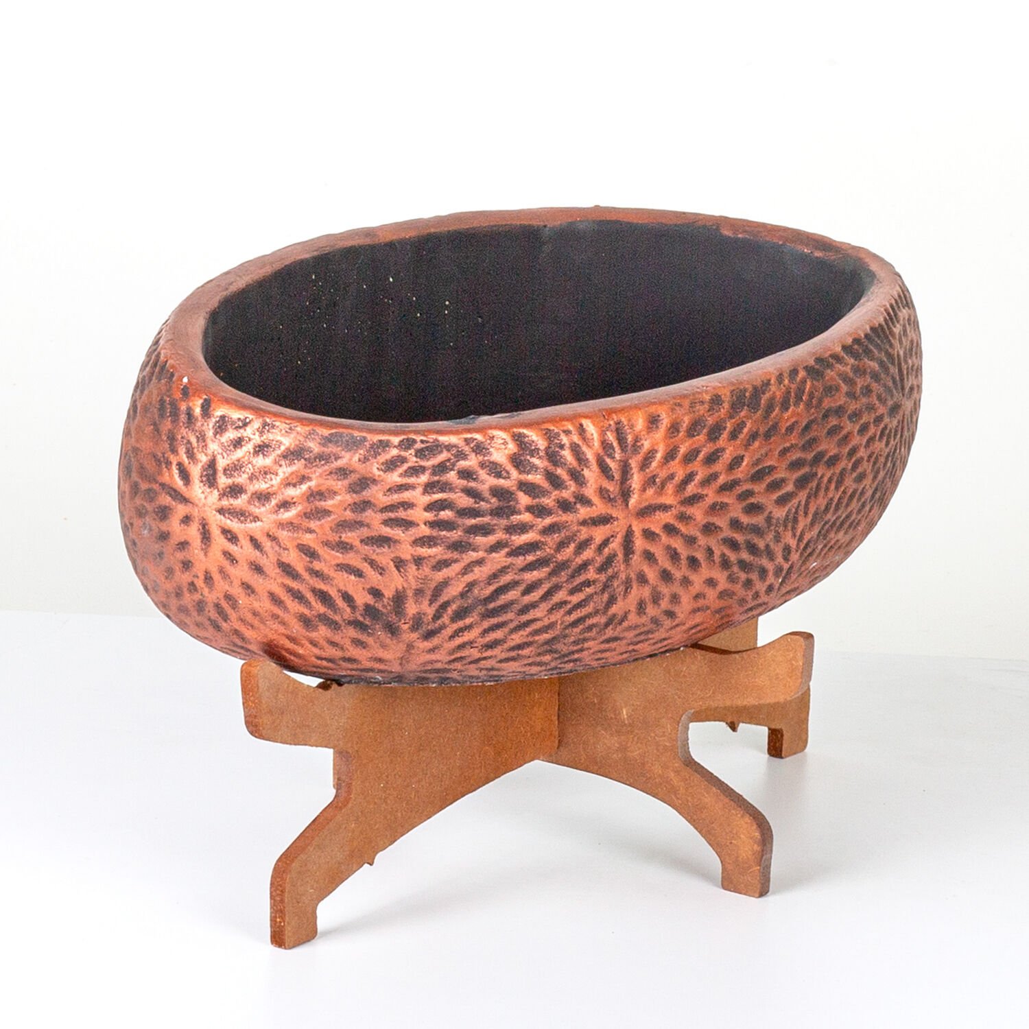 Beton Saksı, Çiçek Motifli Oval, Bakır Eskitme - Ahşap Standlı, 33x17x17 cm