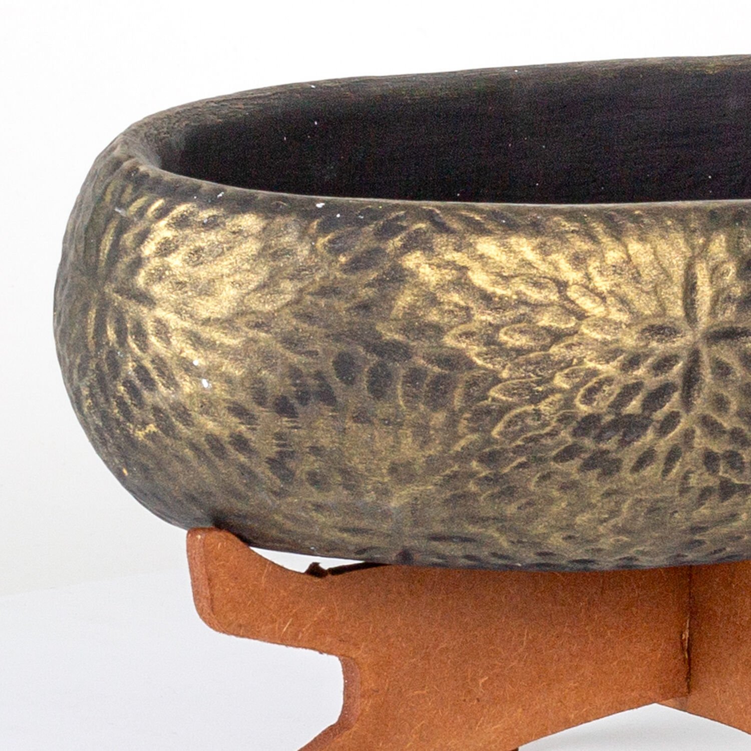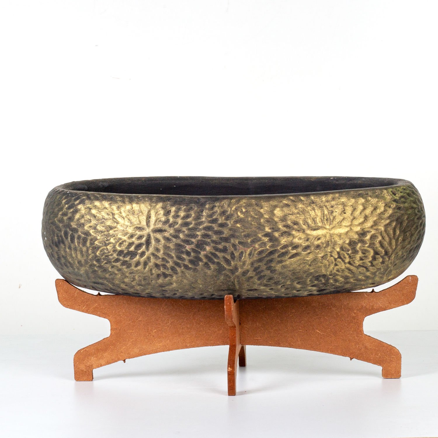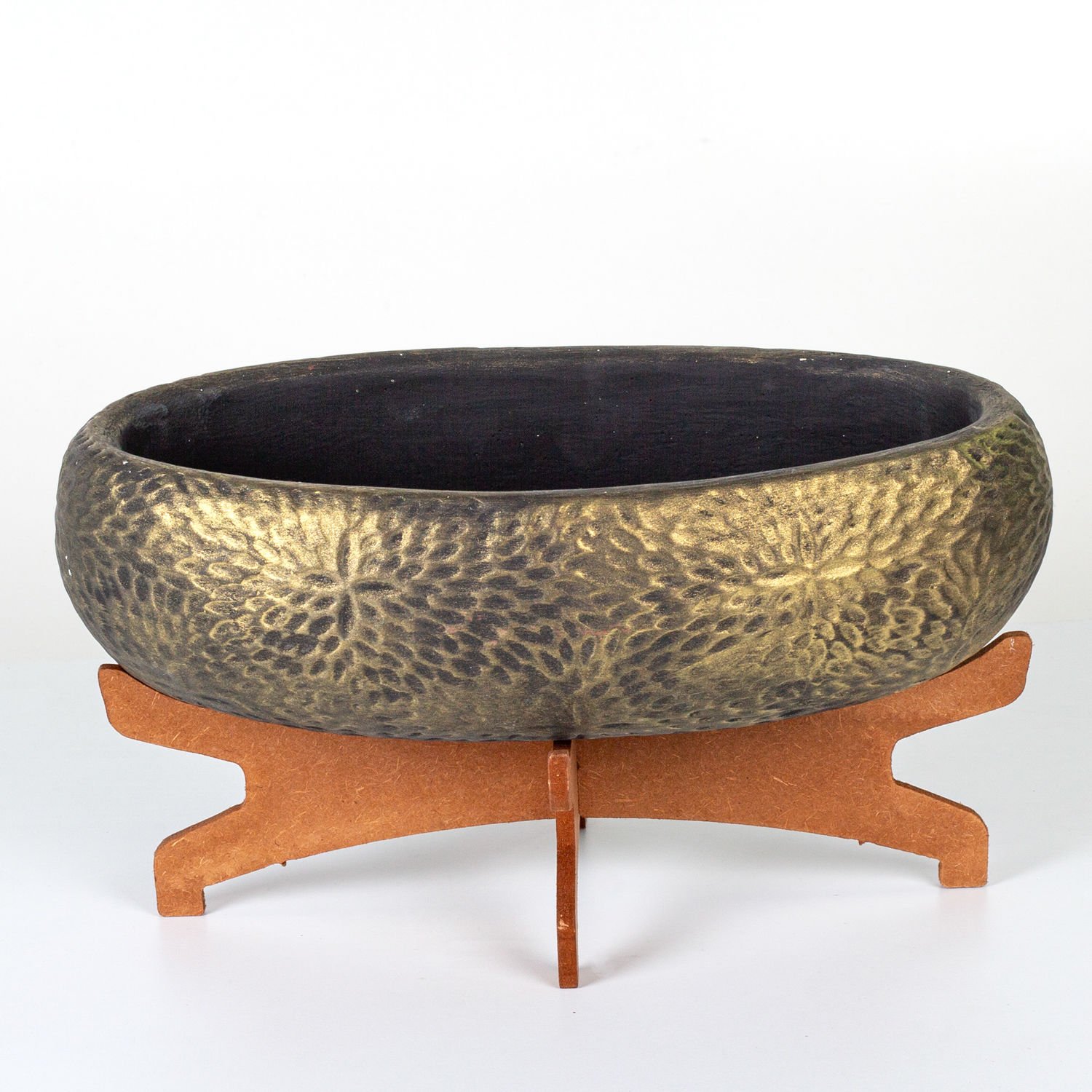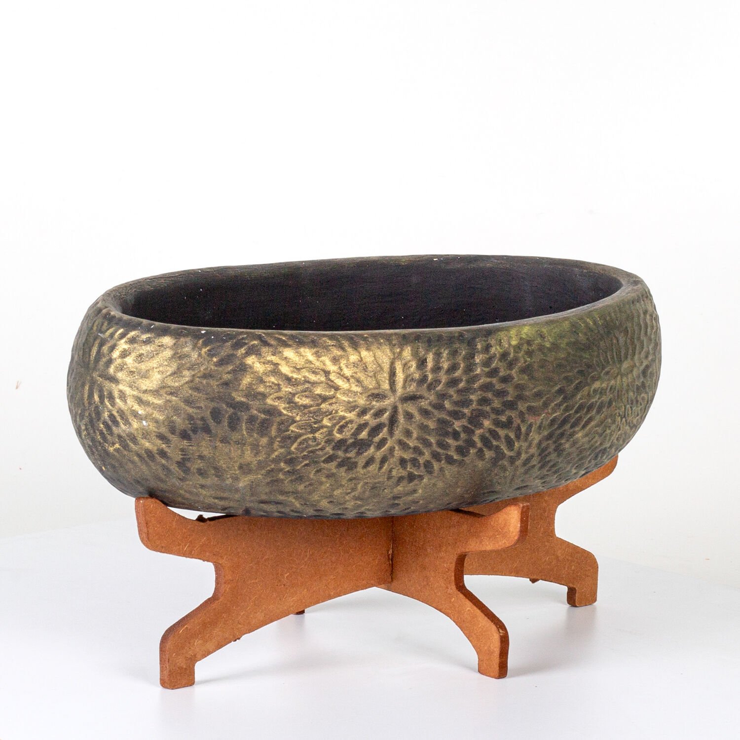 Beton Saksı Ahşap Standlı Çiçek Motifli Oval Gold Eskitme 33x17x17 Cm.