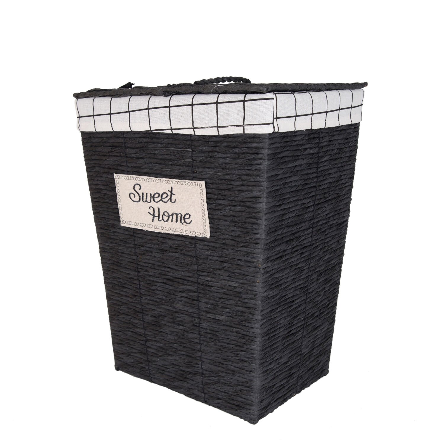 Dekoratif Dikdörtgen Sweethome Kapaklı Hasır Çamaşır Sepeti (Beyaz Kare Kumaş İçli) Siyah 45 X 53 X 35 Cm.