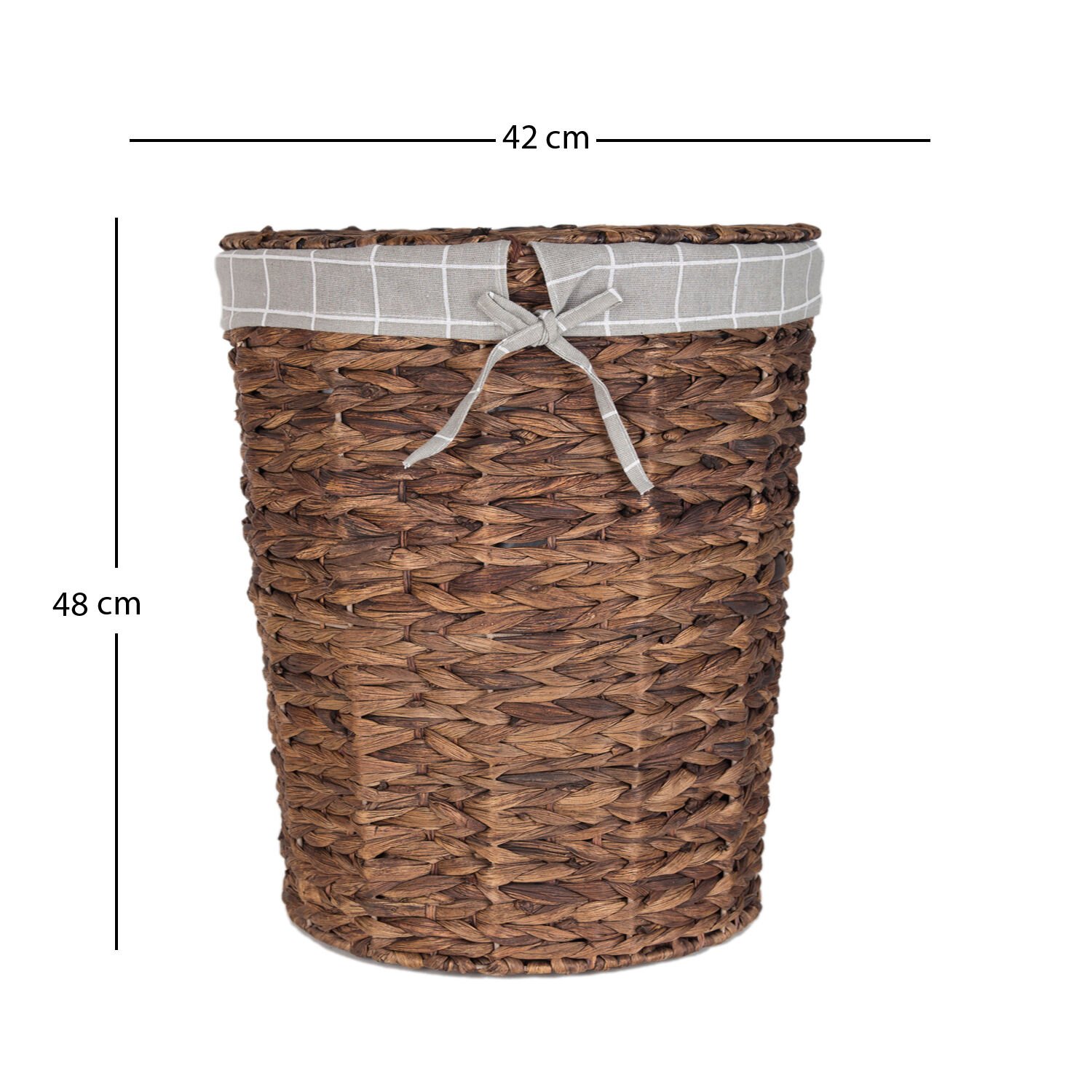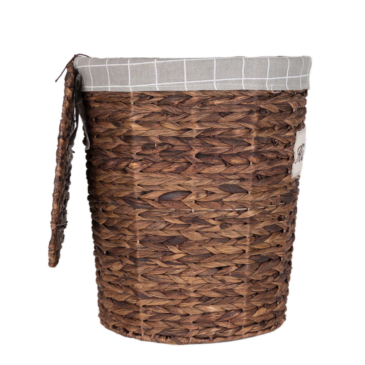 Çamaşır Sepeti, Oval, Home, Kapaklı, Hasır, Kahverengi - Gri Kare Kumaş İçli, 42 x 48 x 30 cm