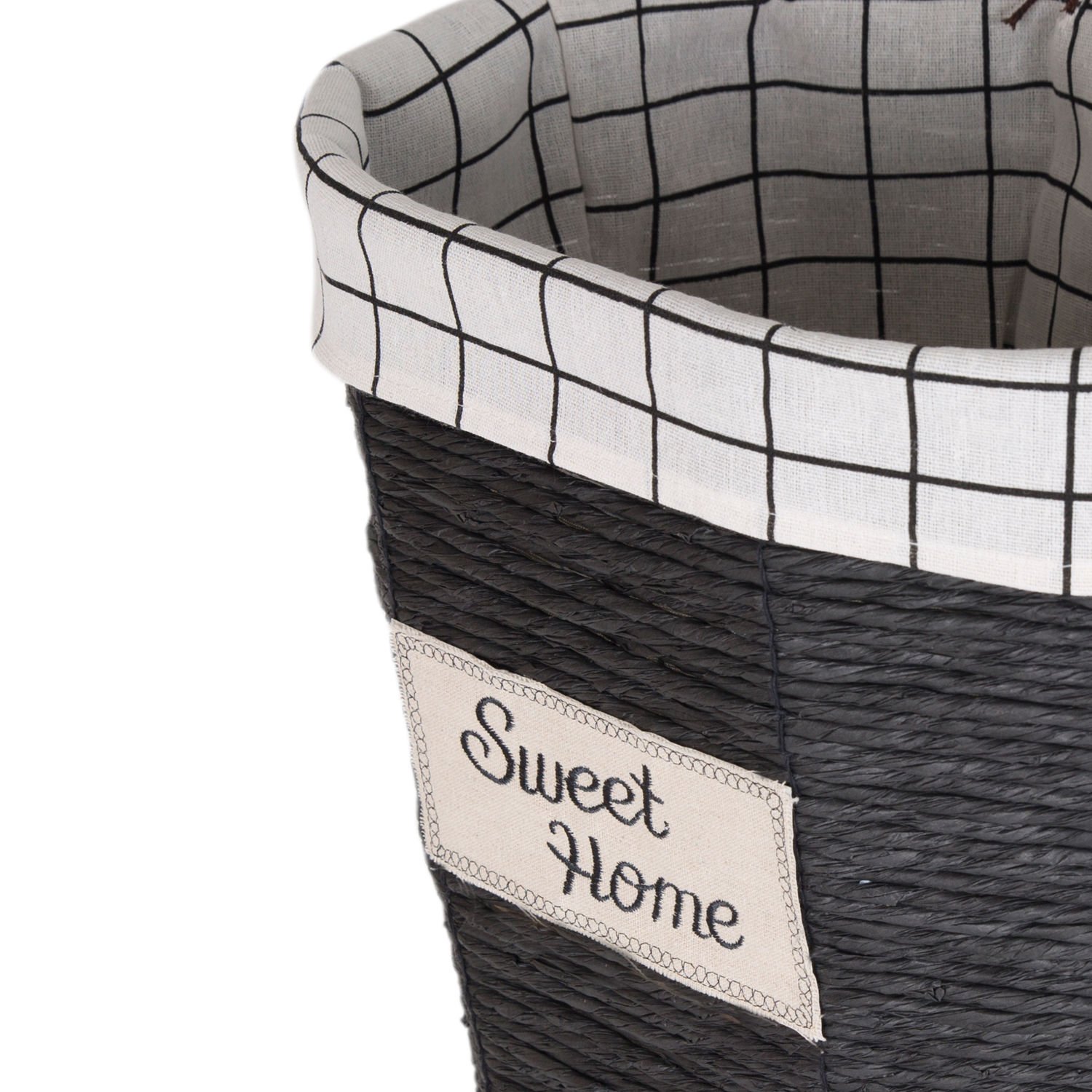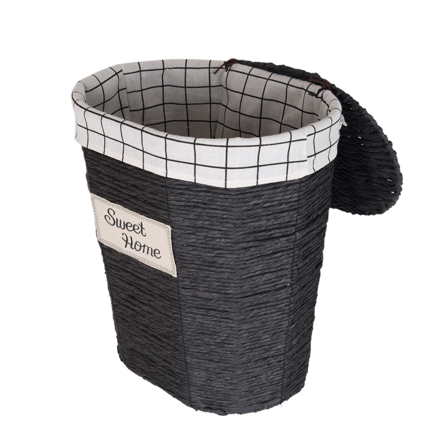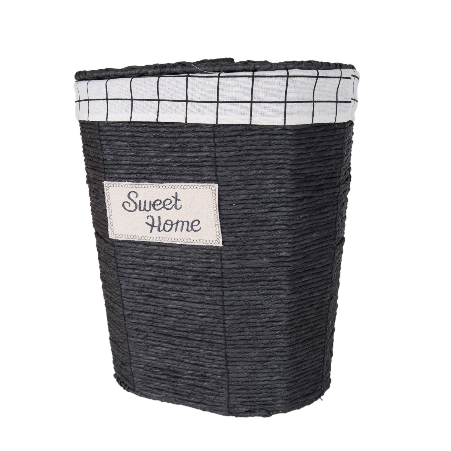 Dekoratif Oval Sweethome Kapaklı Hasır Çamaşır Sepeti (Beyaz Kare Kumaş İçli) Siyah 42 X 48 X 30 Cm.