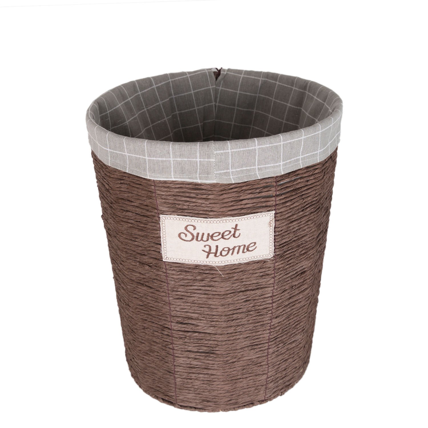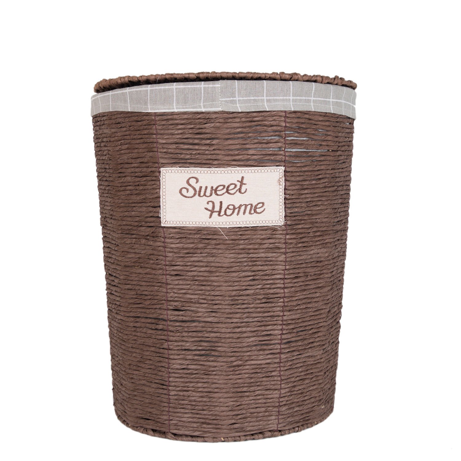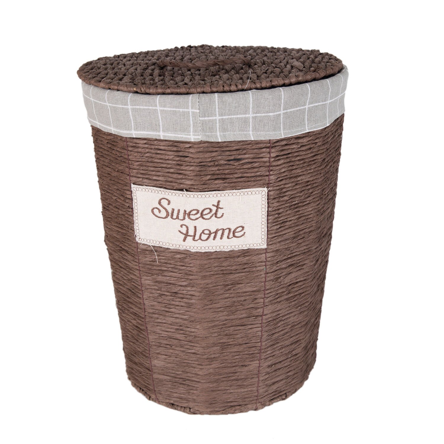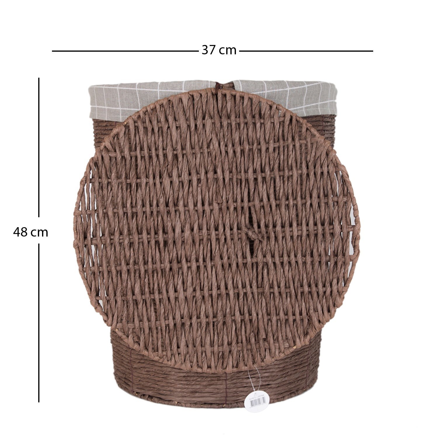 Çamaşır Sepeti, Yuvarlak, Sweethome, Kapaklı, Hasır, Kahverengi - Gri Kare Kumaş İçli, 37 x 48 x 37 cm