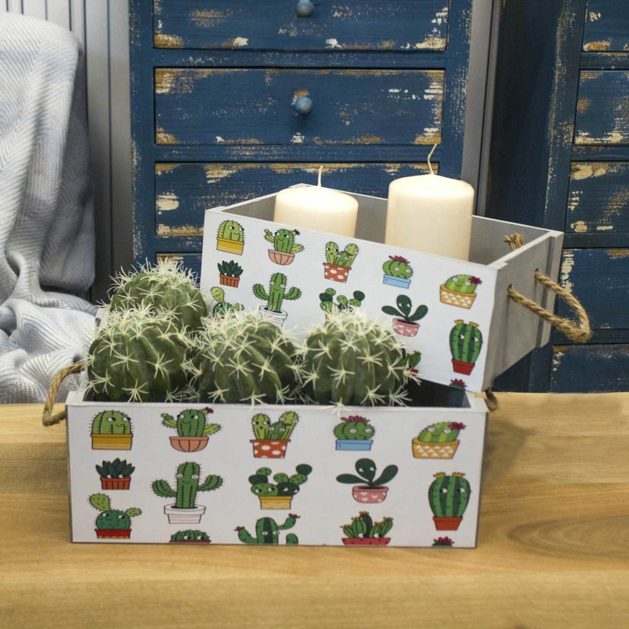 Dekoratif ahşap kasa kaktüs desenli 35x23x13 cm - Yaşam alanlarına renkli bir dokunuş; hem eğlenceli, hem de kullanışlı. Kaktüslü ahşap kasa çeşitleri, evinize neşe katmaya geliyor. Siz de oyuncak, kitap ya da mumları ahşap kasalarda saklayın, sempatik şıklığınız göz doldursun.