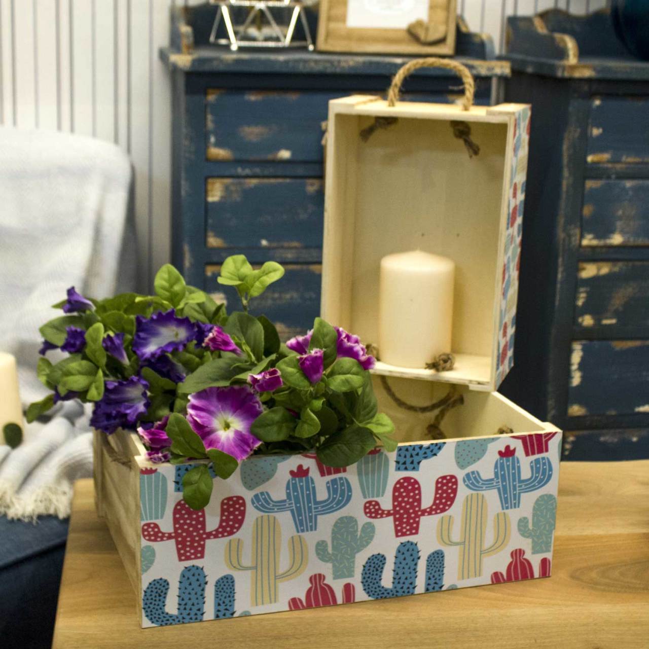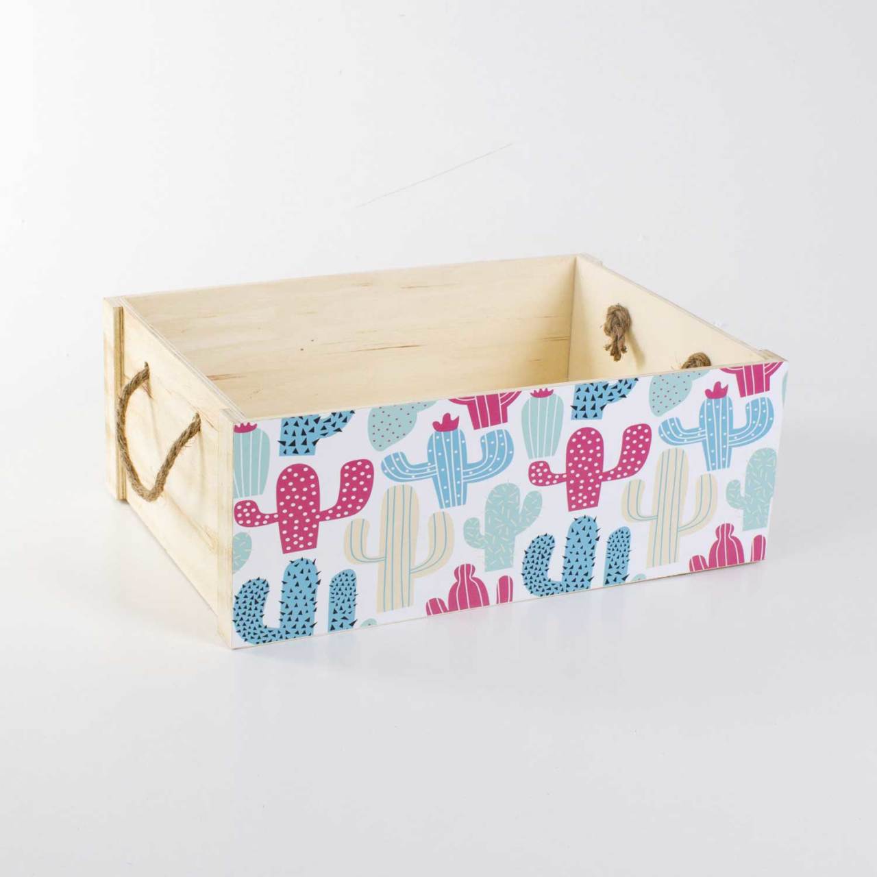 Dekoratif ahşap kasa renkli kaktüslü 35x23x13 cm - Kaktüs modası yaşam alanlarına yaz havası getiriyor. Hele bir de renklilerse! Siz de havlu, oyuncak ya da dergilerinizi rengarenk kaktüslerle süslü ahşap kasalarda saklayın; evde düzeni sağlarken yazın enerjisini içinizde hissedin. Merak etmeyin, biz en uygun ahşap kasa ile sizi bekliyoruz.