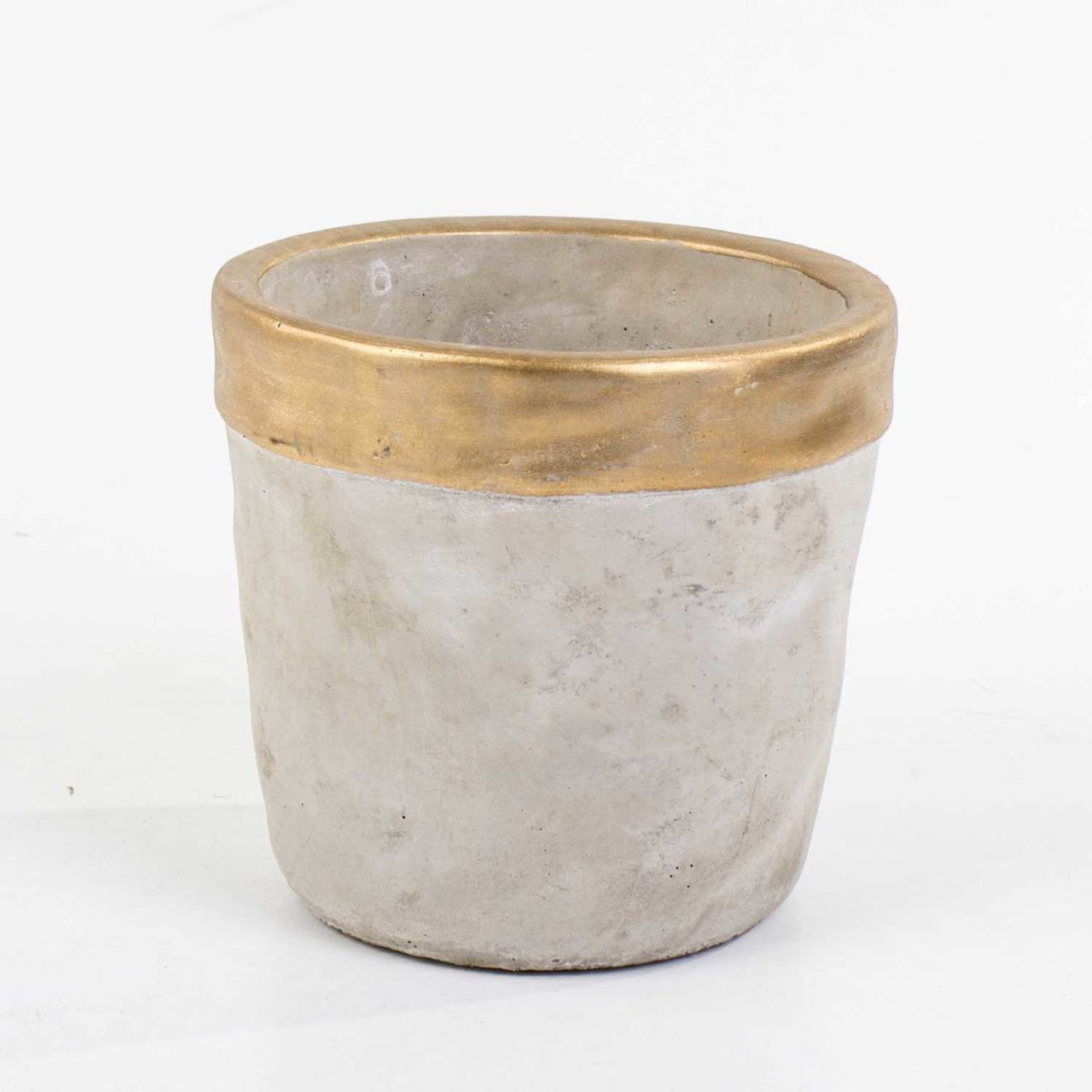 Dore bantlı beton saksı 13,5x13 cm - Dekoratif saksı çeşitlerimiz arasından üst kısmı altın dore rengi şerit ile renklendirilmiş bitki veya çiçeklerinizi şık bir şekilde sergilemek için tercih edebileceğiniz dekoratif dore bantlı beton saksı.