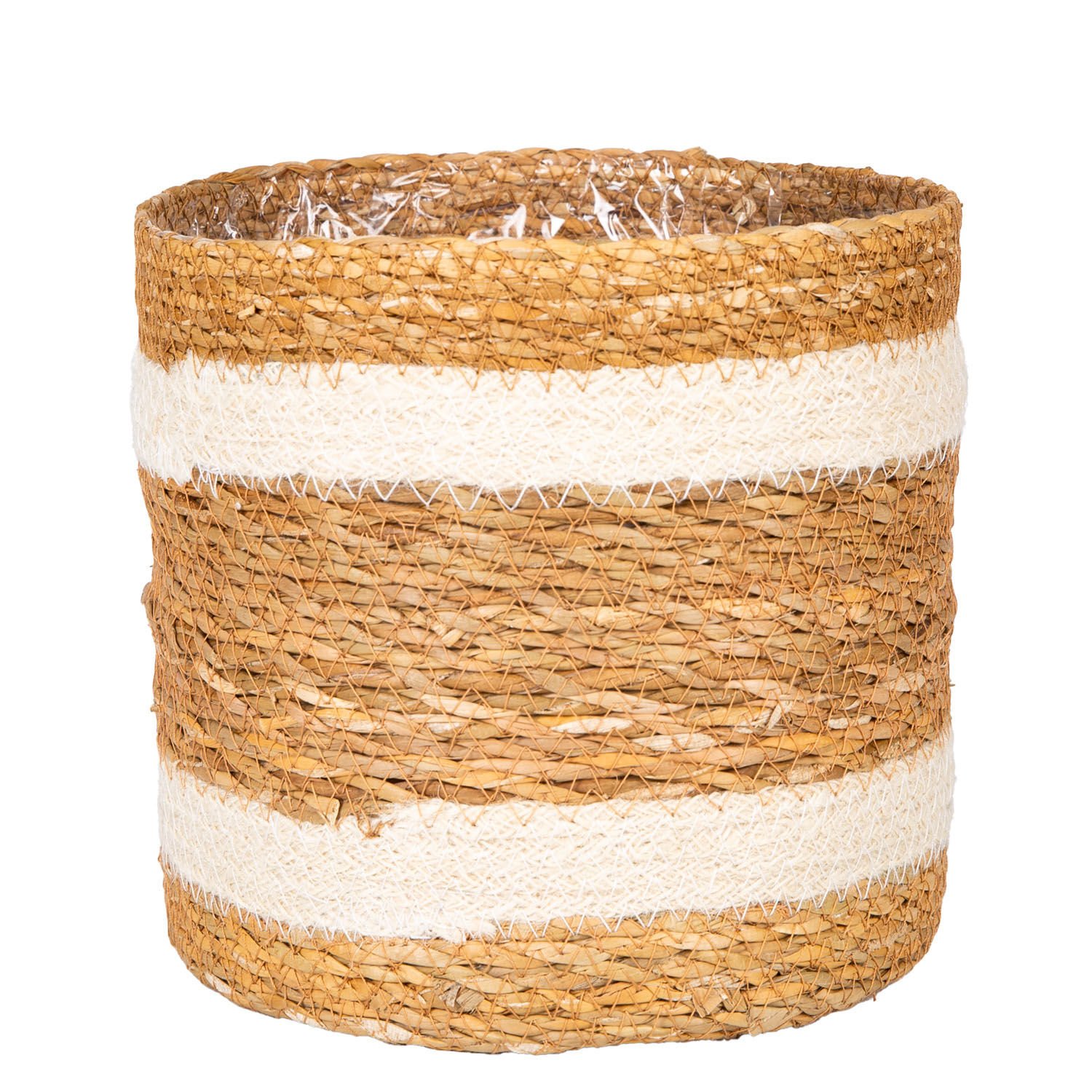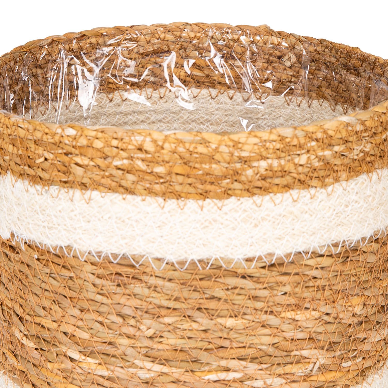 Doğal görünümüyle ortama sıcaklık katan Beyaz Şeritli Naylon İçli hasır dekoratif sepet, fonksiyonel depolama seçeneği sunan mükemmel bir tasarıma sahiptir. Bu sepetler mutfağınızın , odalarınızın , balkonlarınızın daha derli toplu ve güzel görünmesini sağlayacak ve ayrıca yapay çiçek , bitki ve ağaçlarınızı içine koyabileceğiniz çok fonksiyonlu kullanım alanı olan bir üründür. .