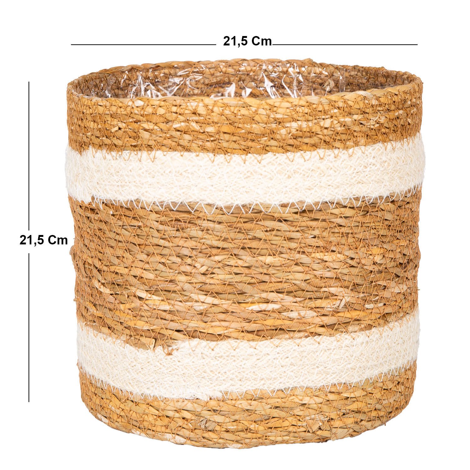 Hasır Sepet, Beyaz Şeritli, Naturel - Naylon İçli, 21,5x21,5 cm