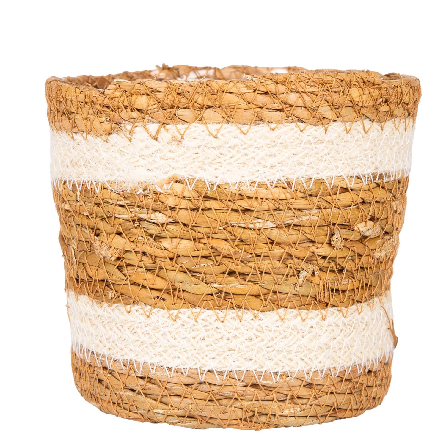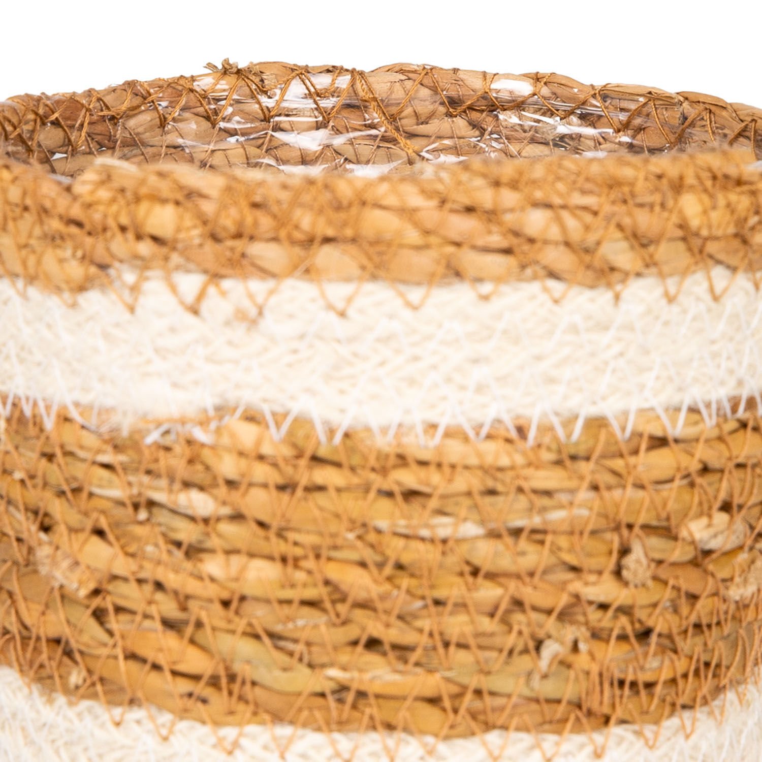 Hasır Sepet, Beyaz Şeritli, Naylon İçli, Naturel - 12,5x13 cm