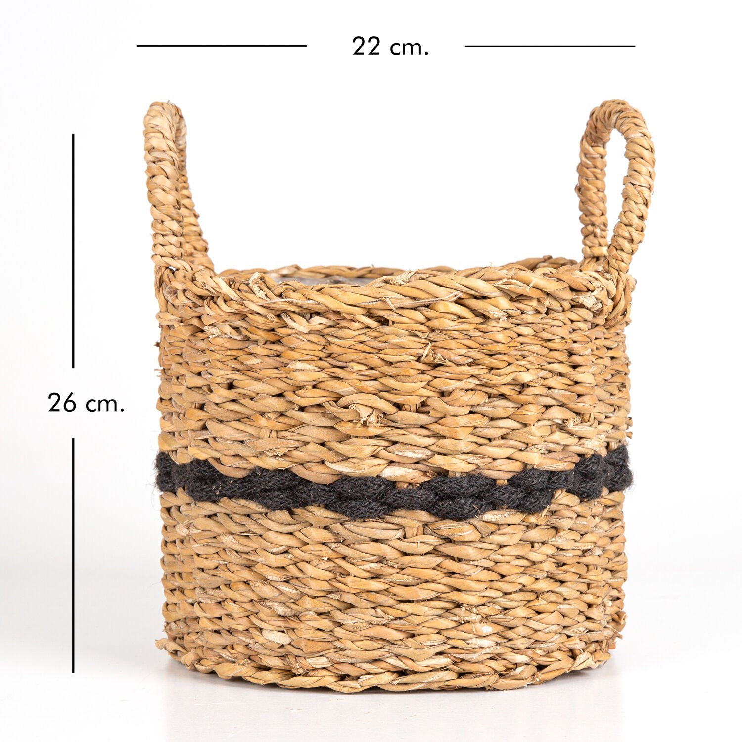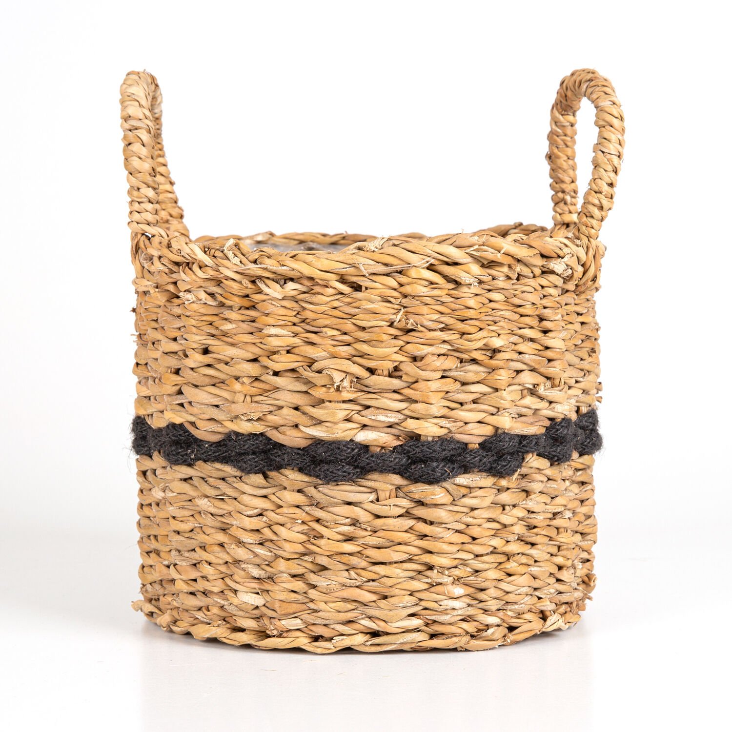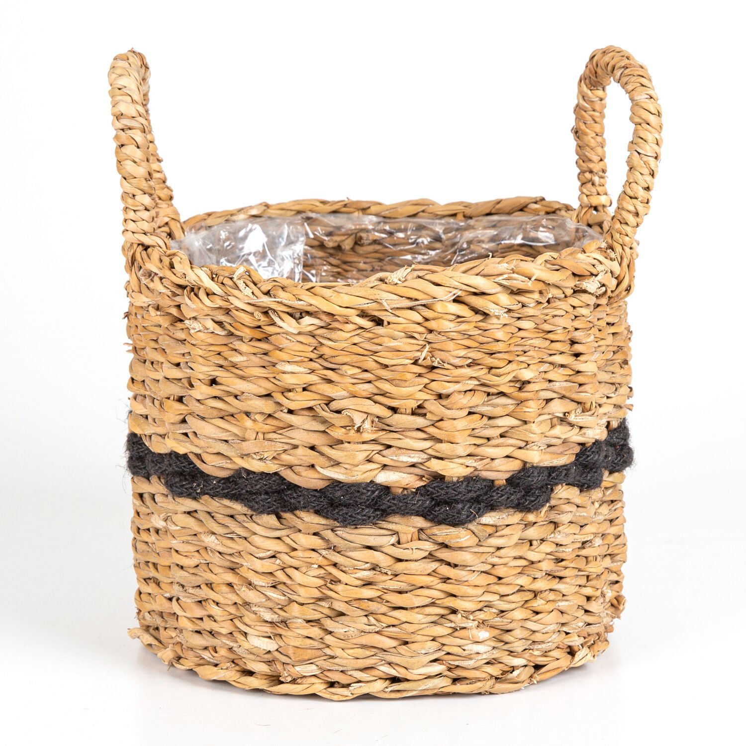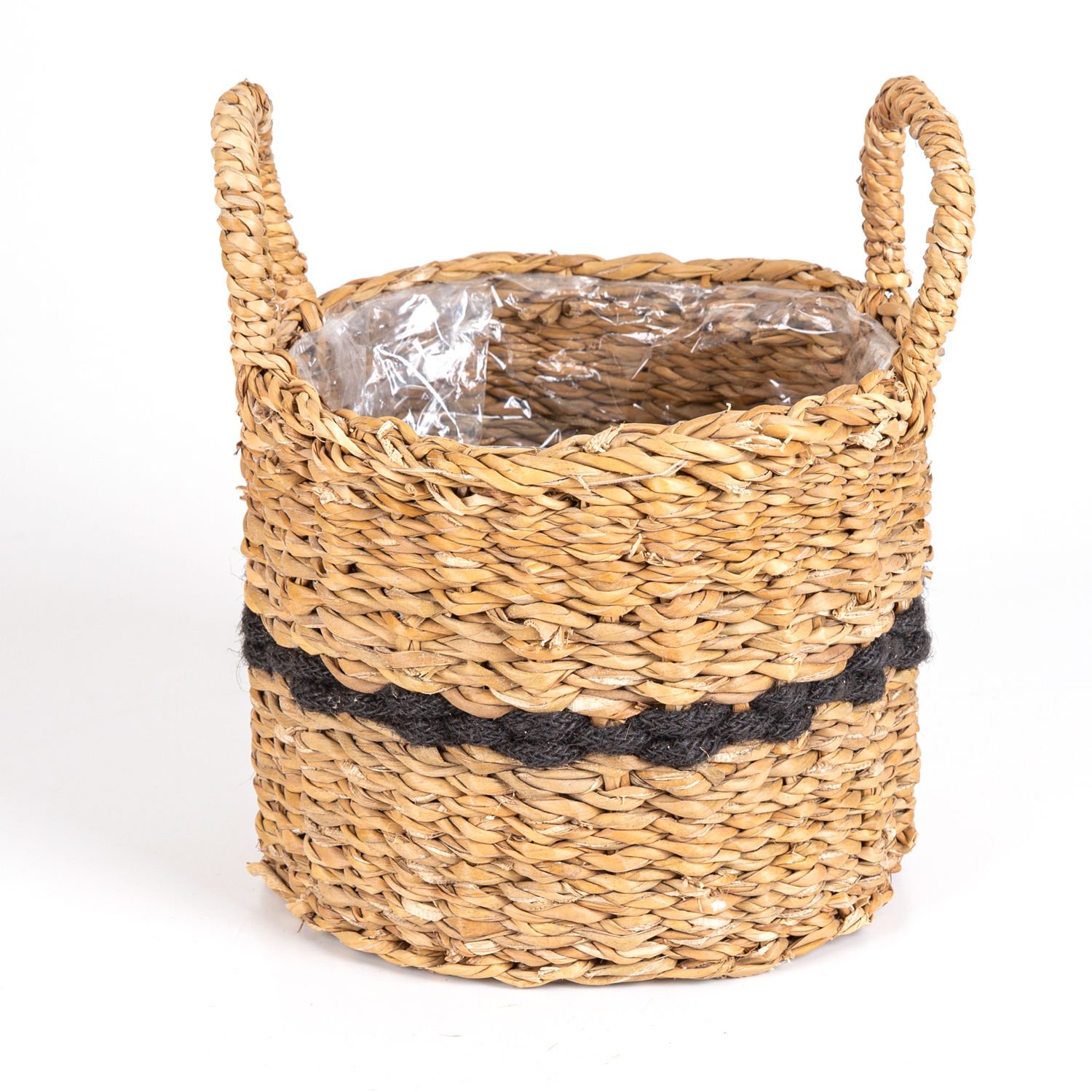 Siyah Kuşaklı Kulplu İçi Naylonlu Hasır Sepet Natural - Siyah 22 x 26 Cm.