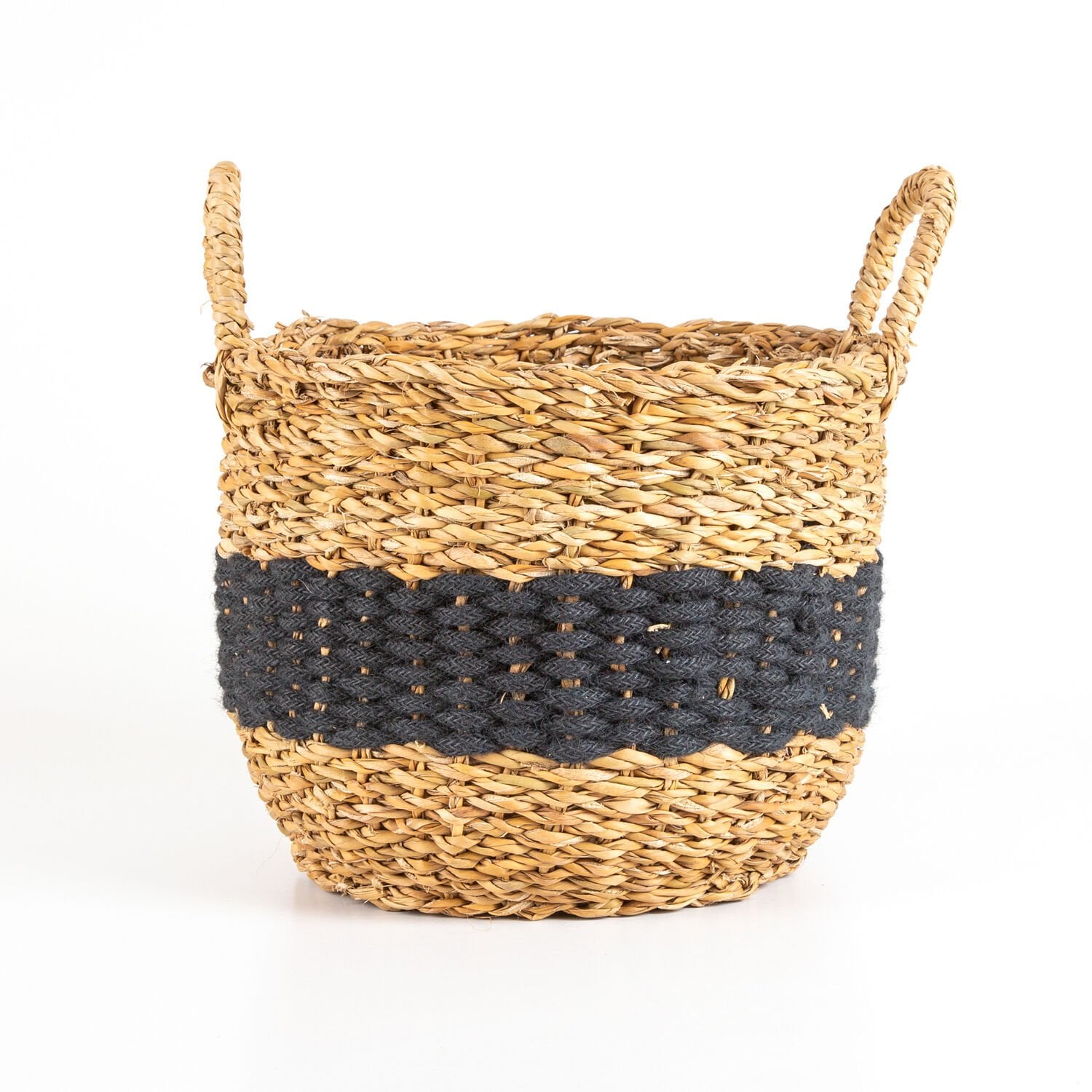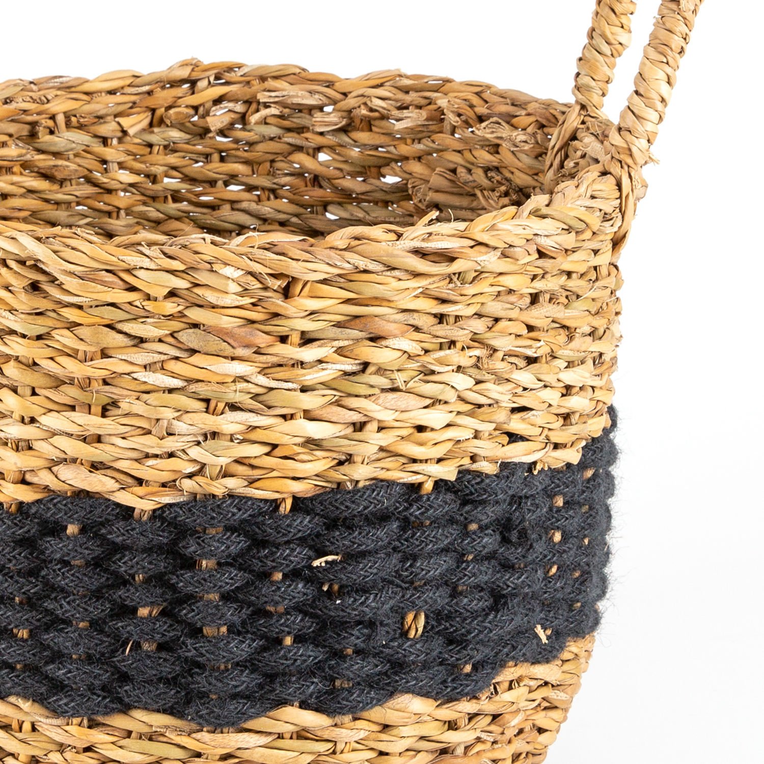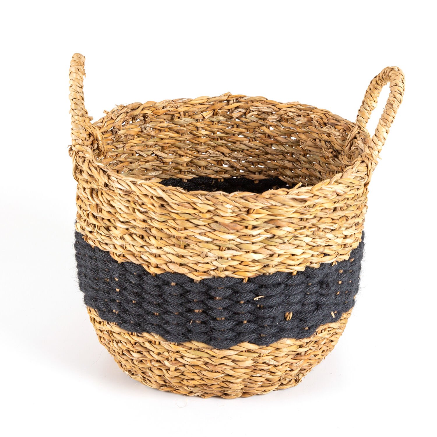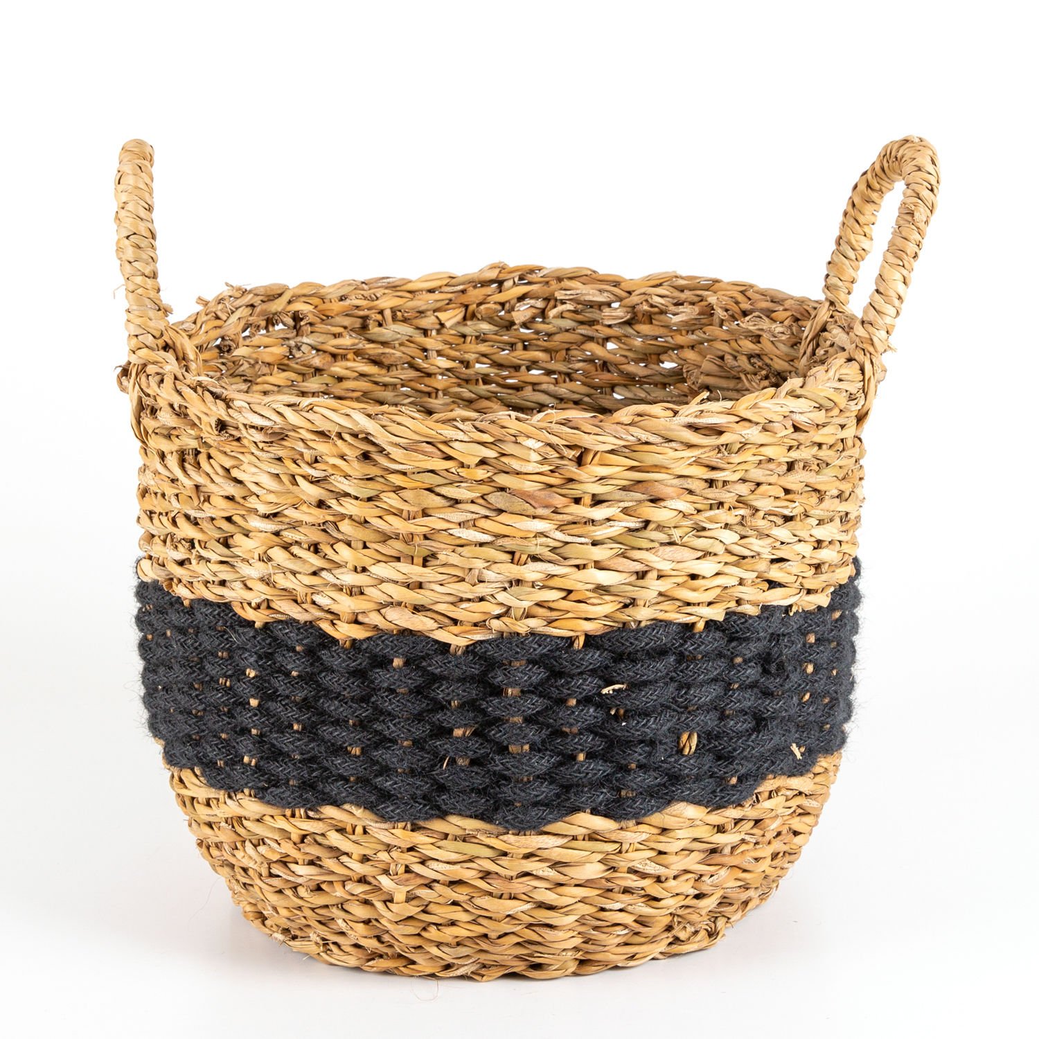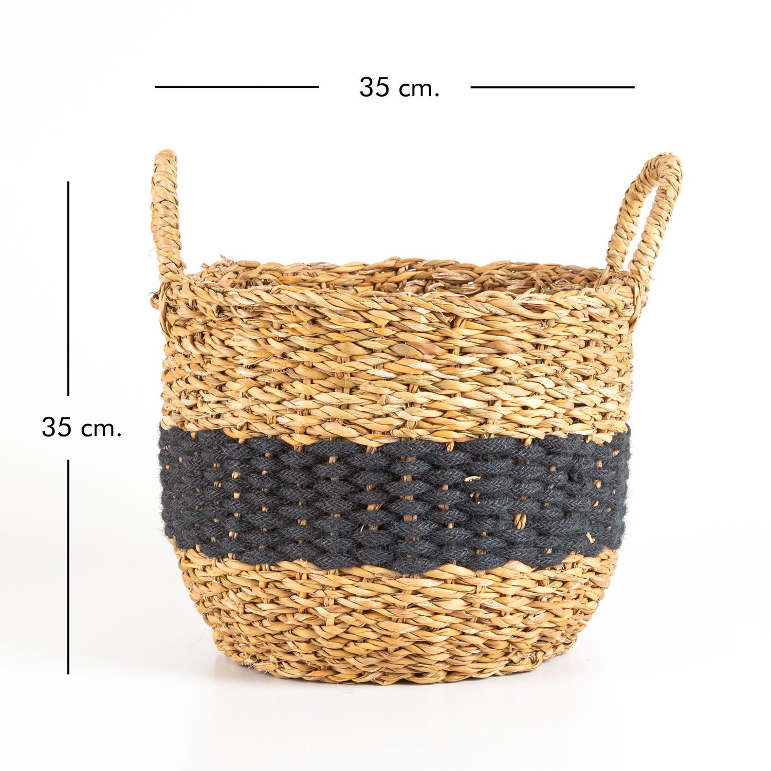 Hasır Sepet, Kulplu, Natural - Siyah Kuşaklı, Siyah, 35 x 35 cm