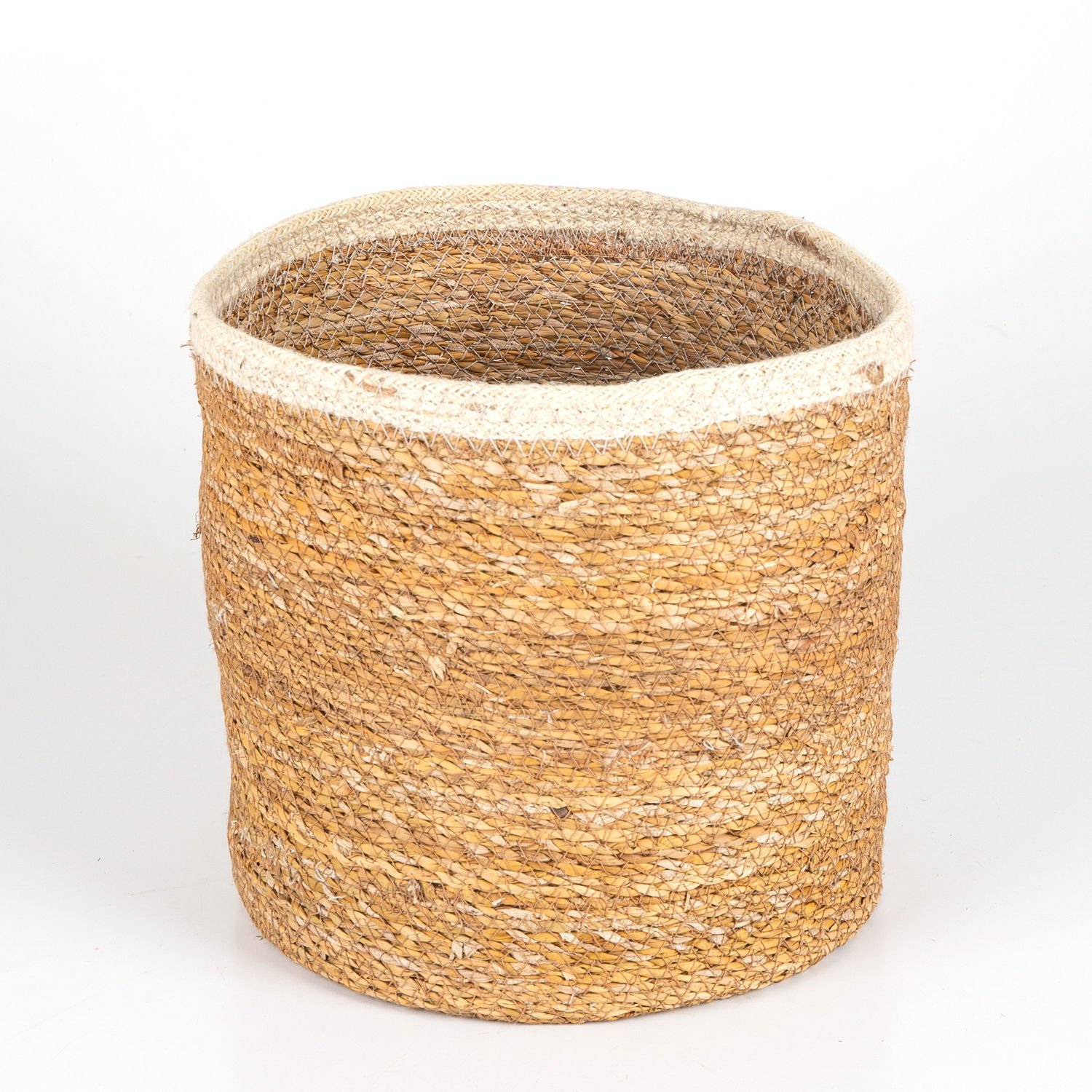 Hasır Sepet, Yuvarlak - Beyaz Kuşaklı, Orta, 28 x 26 cm