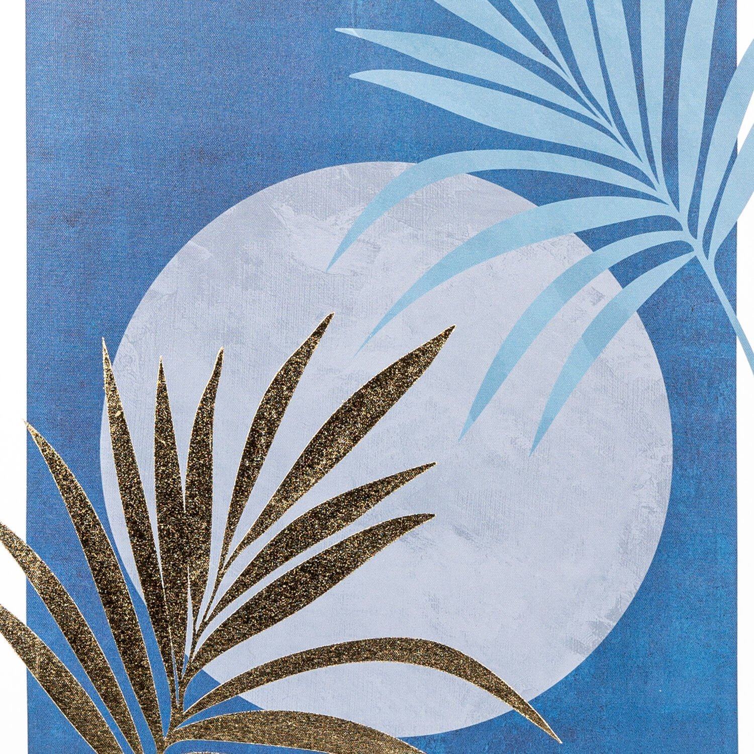 Kanvas Tablo, Gecede Areka Palmiyesi Yaprağı, Siyah Ahşap Çerçeveli, Gold Kabartmalı, Gold-Mavi - 50x3x70 cm