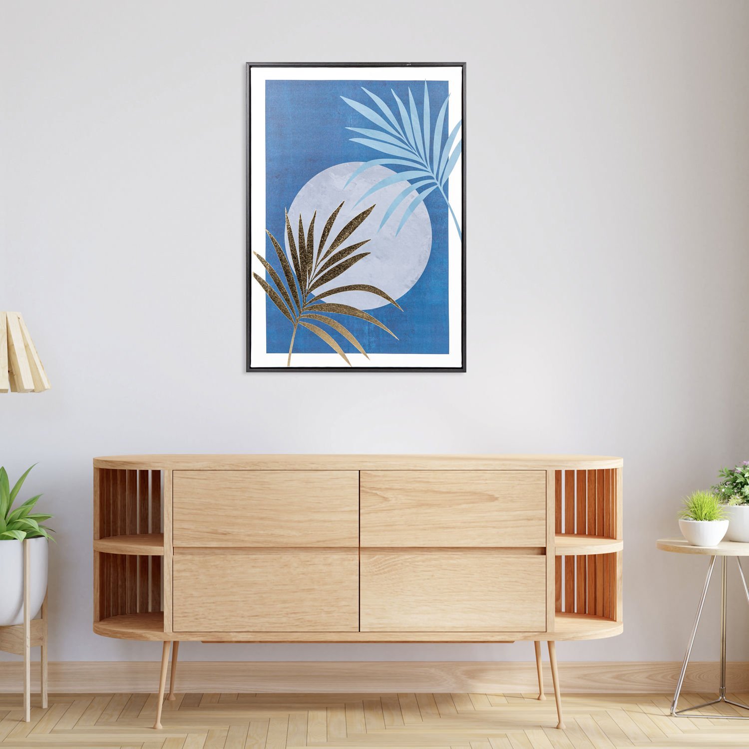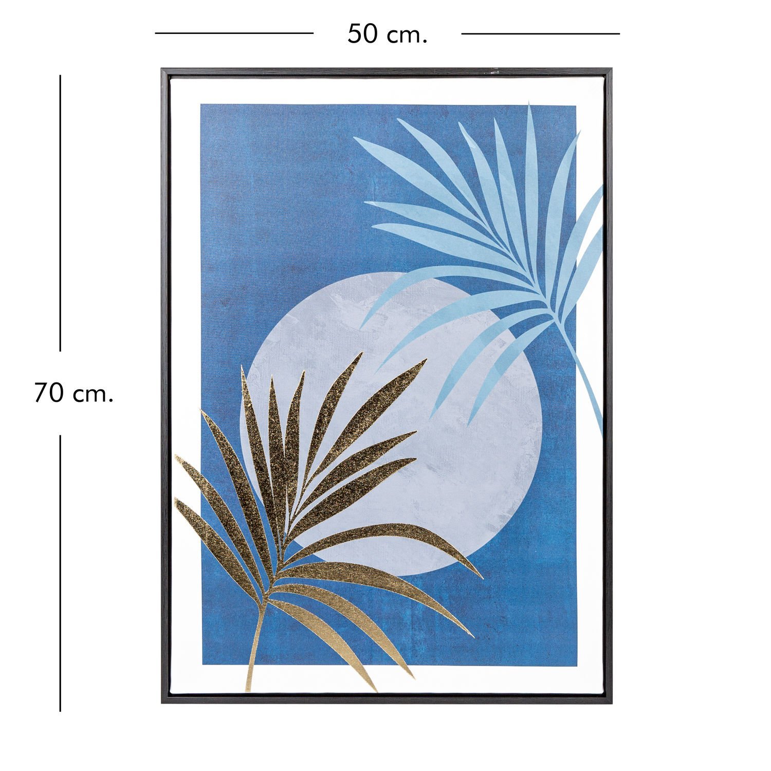 Siyah Ahşap Çerçeveli Gecede Areka Palmiyesi Yaprağı Kanvas Tablo Gold-Mavi 50x70x3 Cm.