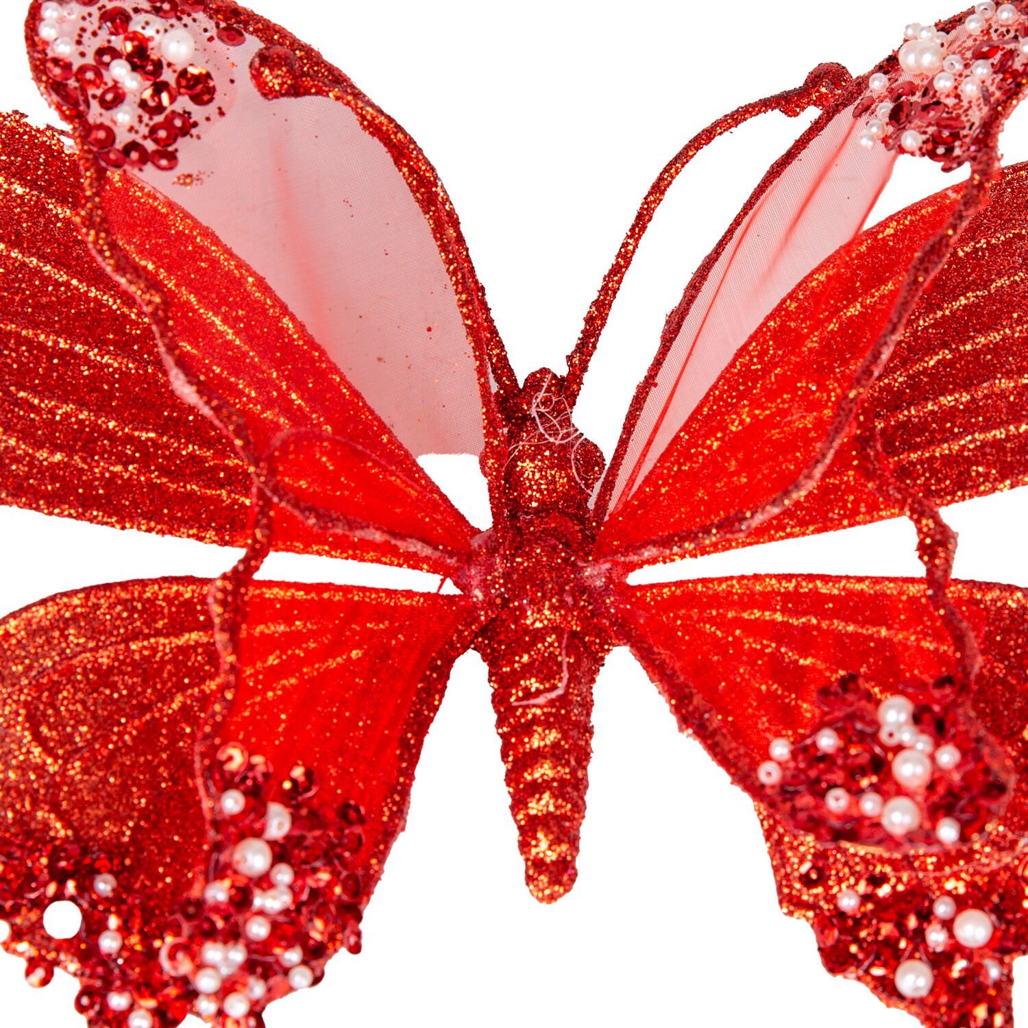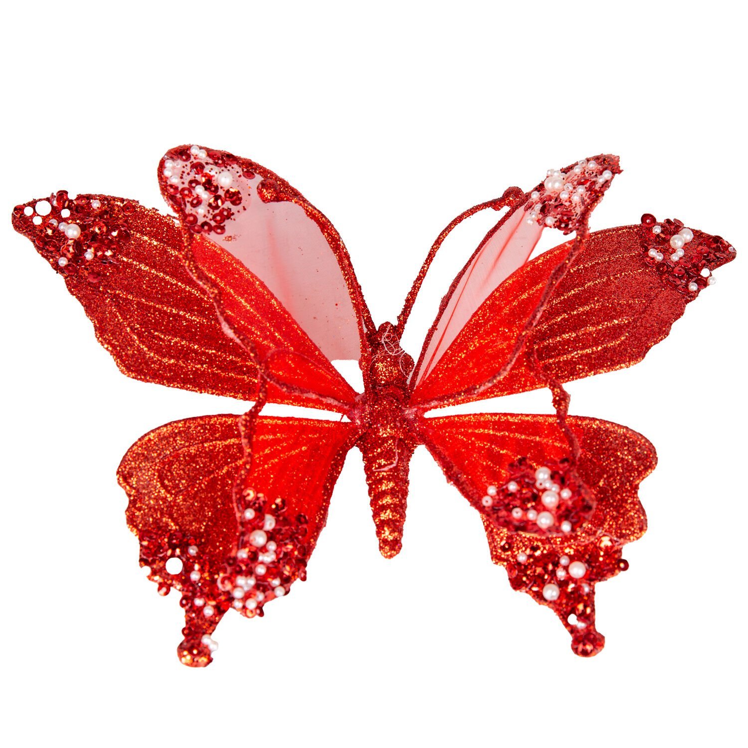 Kelebek Figürü, Simli Kırmızı ve Beyaz İnci Detaylı: 24x9 cm Boyutuyla Dekorunuza Hareket ve Canlılık