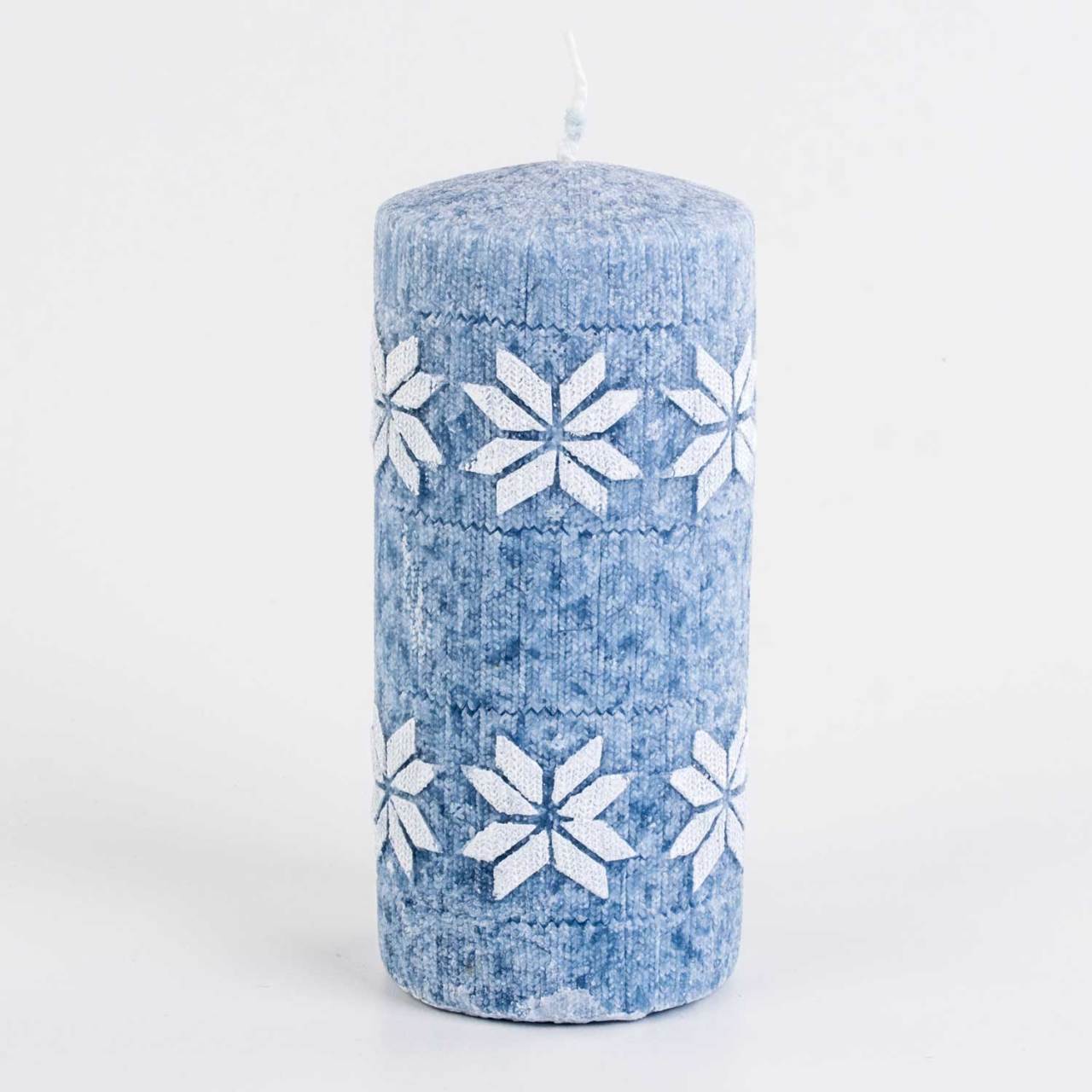 Mavi kütük mum kar motifi, 7x15,5 cm - Ev ve ofis dekorasyonlarında en çok kullanılan renklerden mavi rengine sahip, üstünde kar motifi sayesinde dekoratif özelliği bulunan, bulunduğu ortamları aydınlatırken rengi ve dekoratif özelliğiyle dekorlarınıza mistik ve farklı bir hava katacak kar motifli mavi kütük mum.
