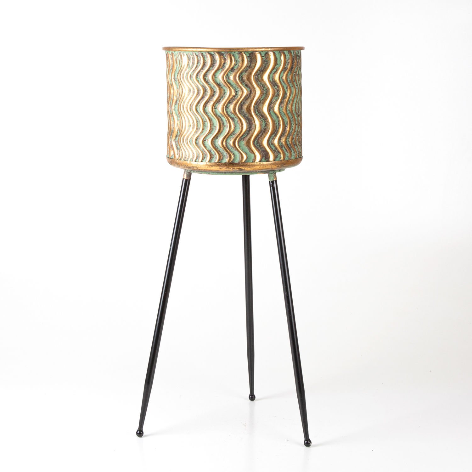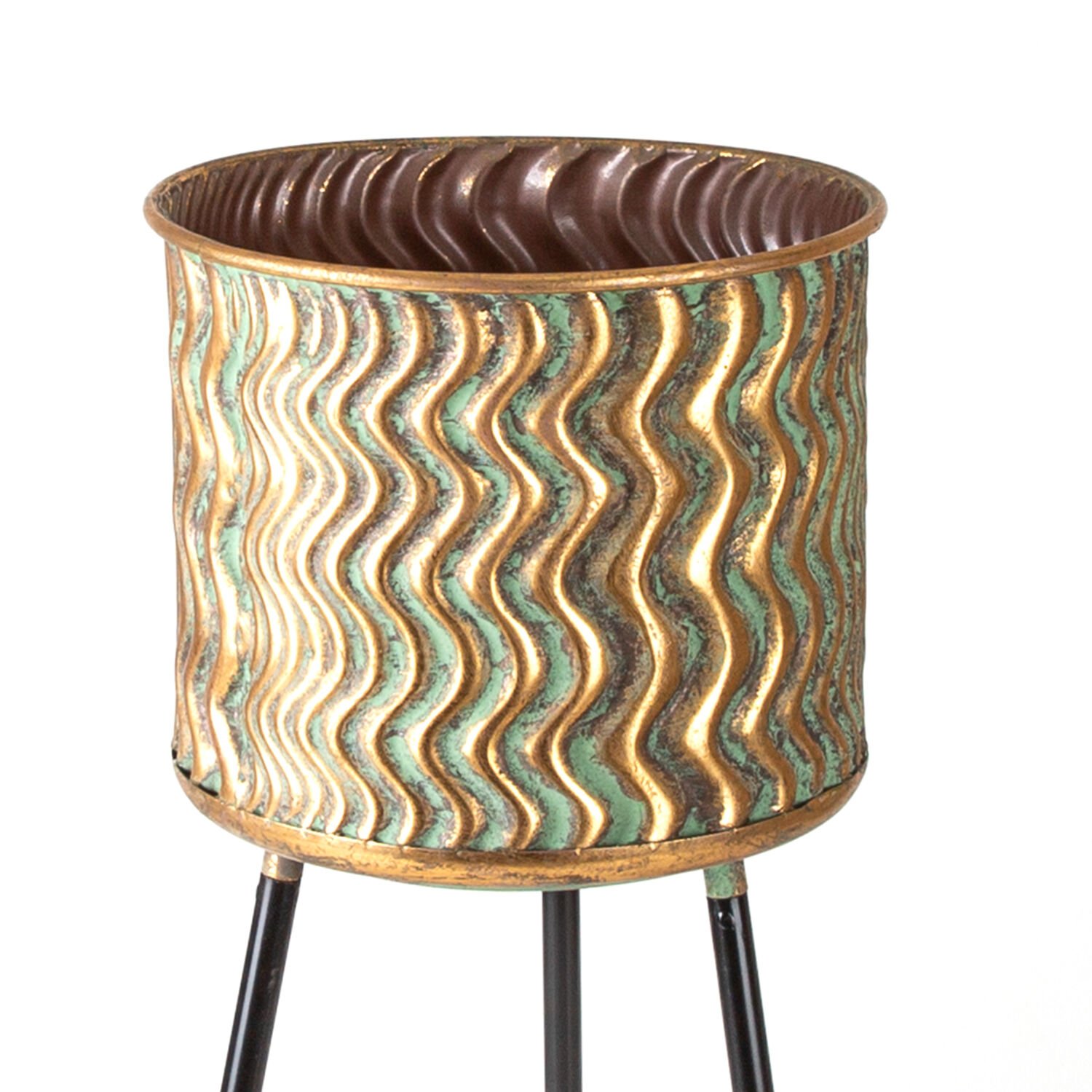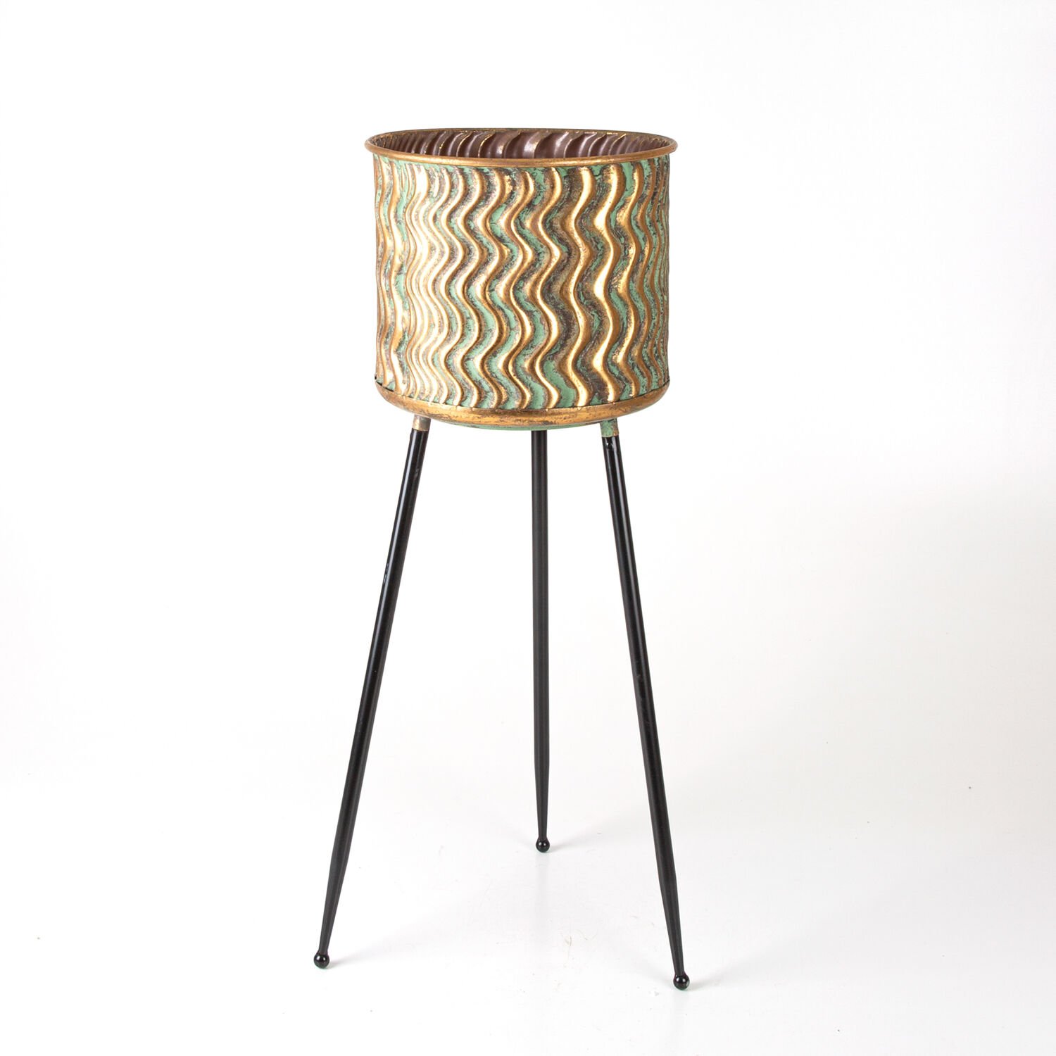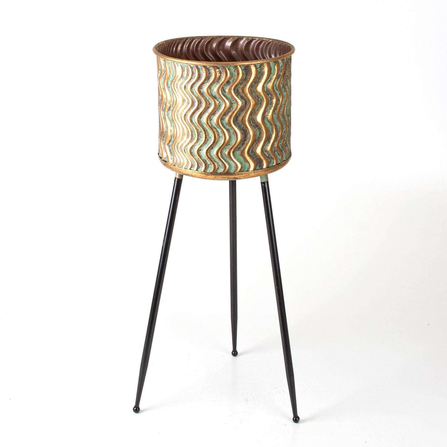 Metal Çiçeklik Saksı, Ayaklı, Kabartma Dalga Desenli, Altın Eskitme-Siyah - 34x88,5x34 cm