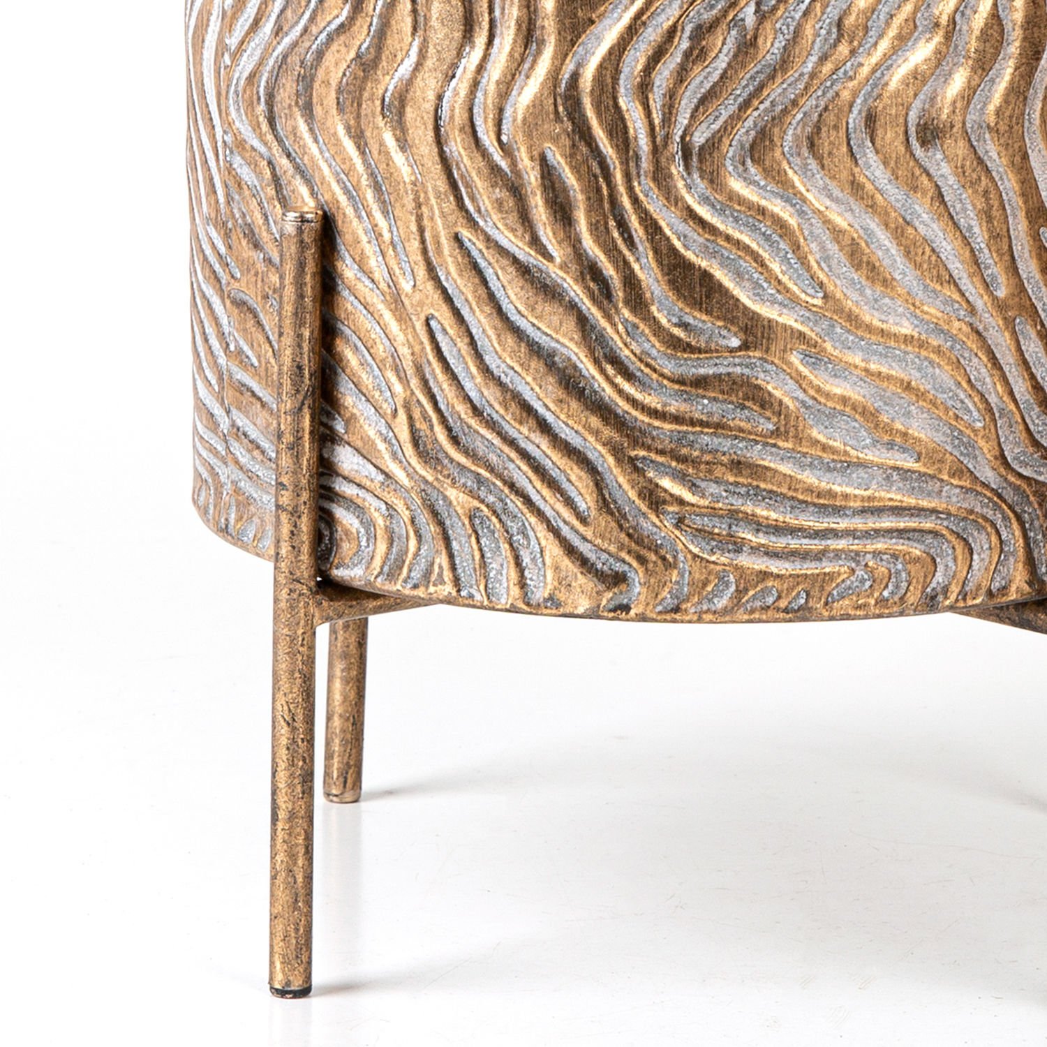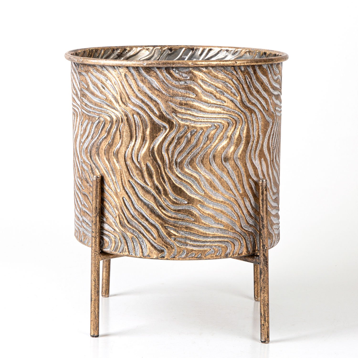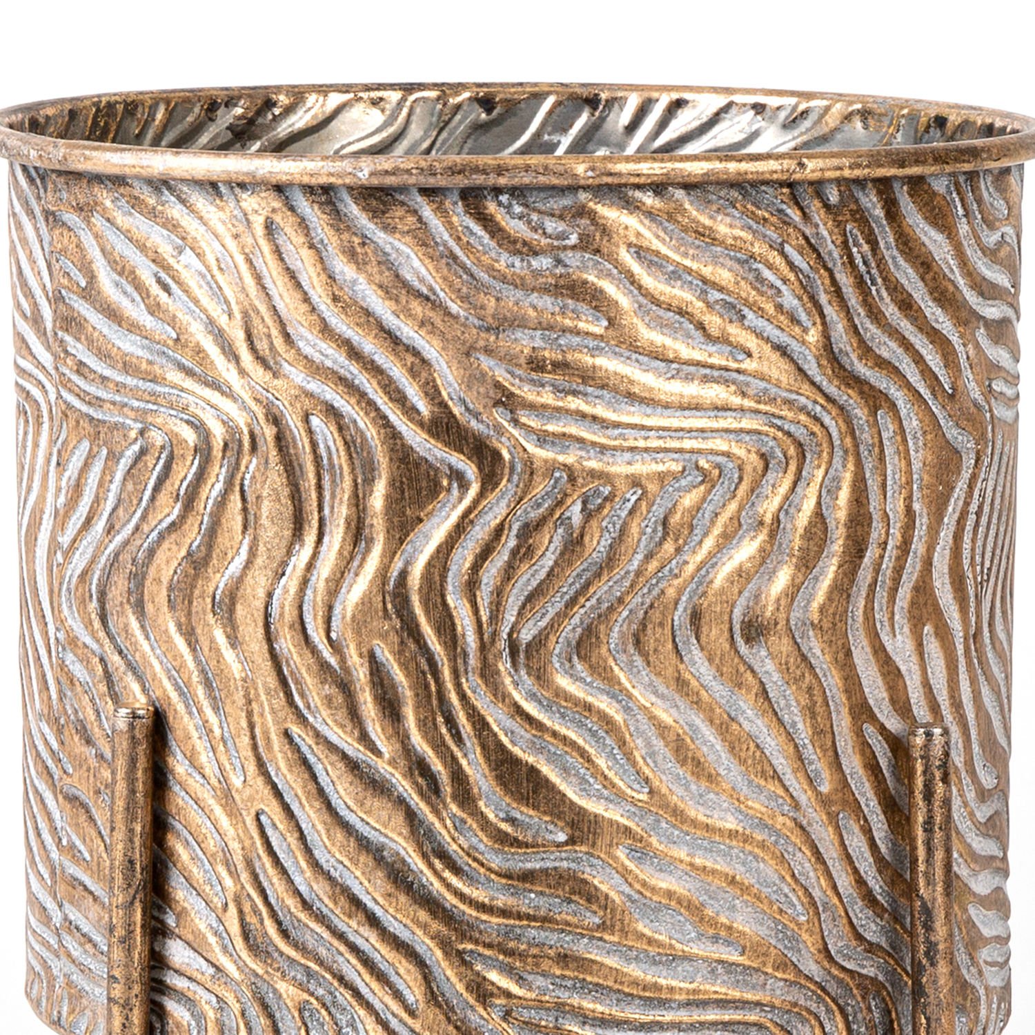 Metal Çiçeklik Saksı, Ayaklı, Silindir, Dalga Desenli, Altın Eskitme - 26x32,5 cm