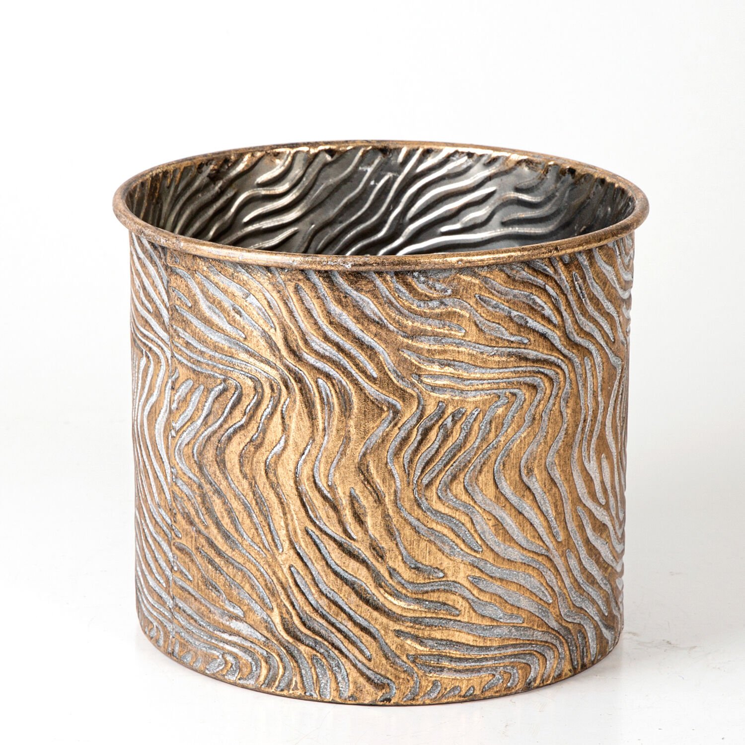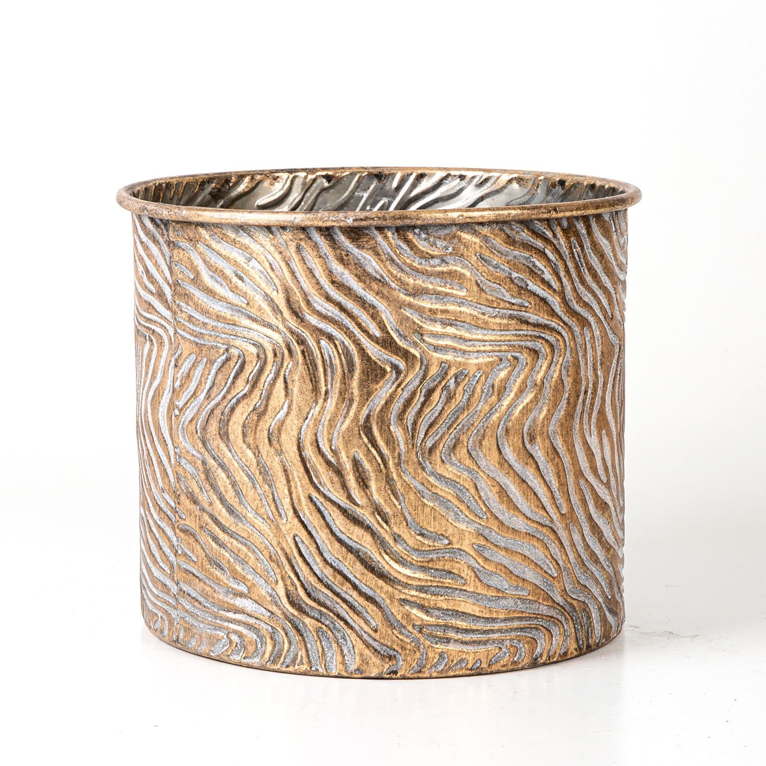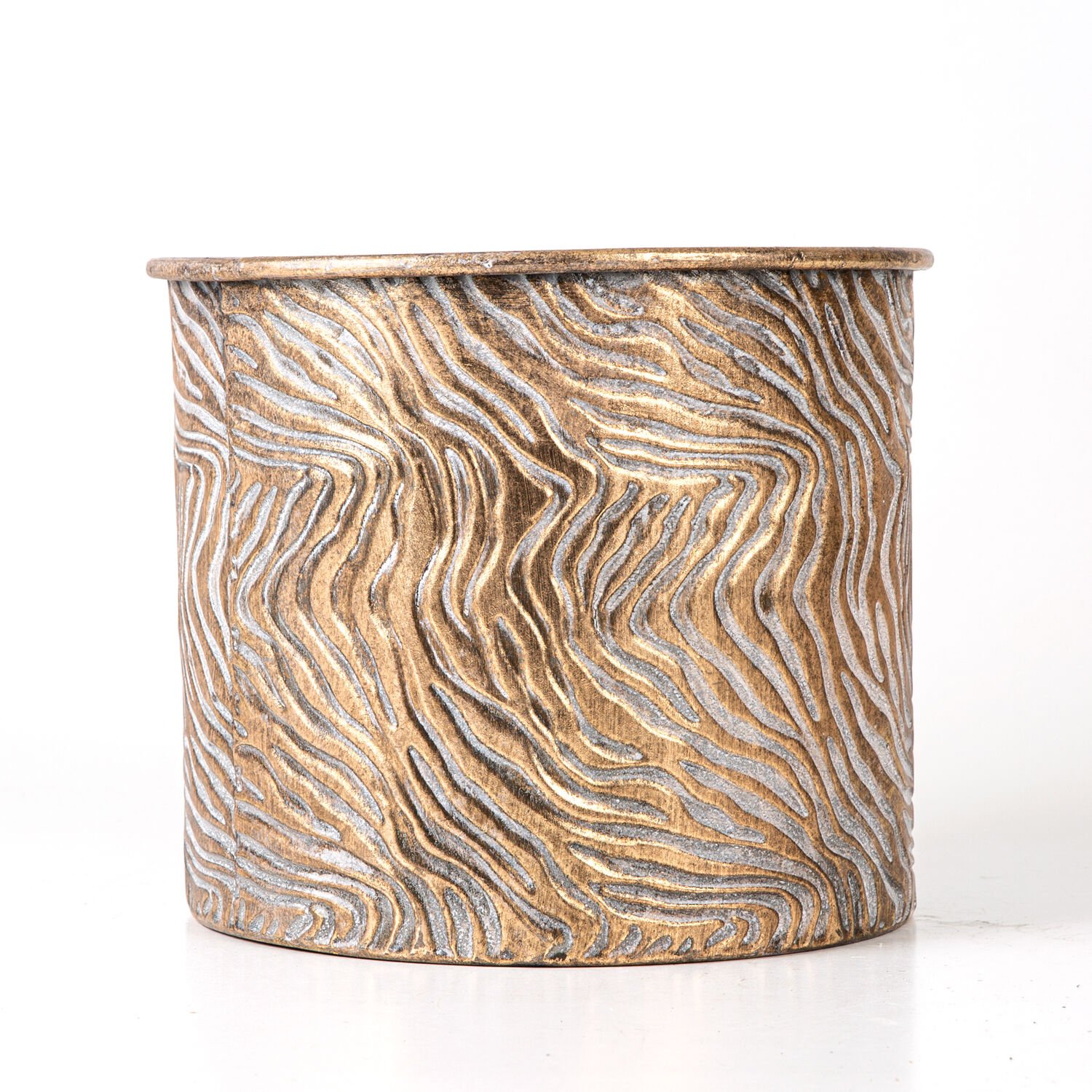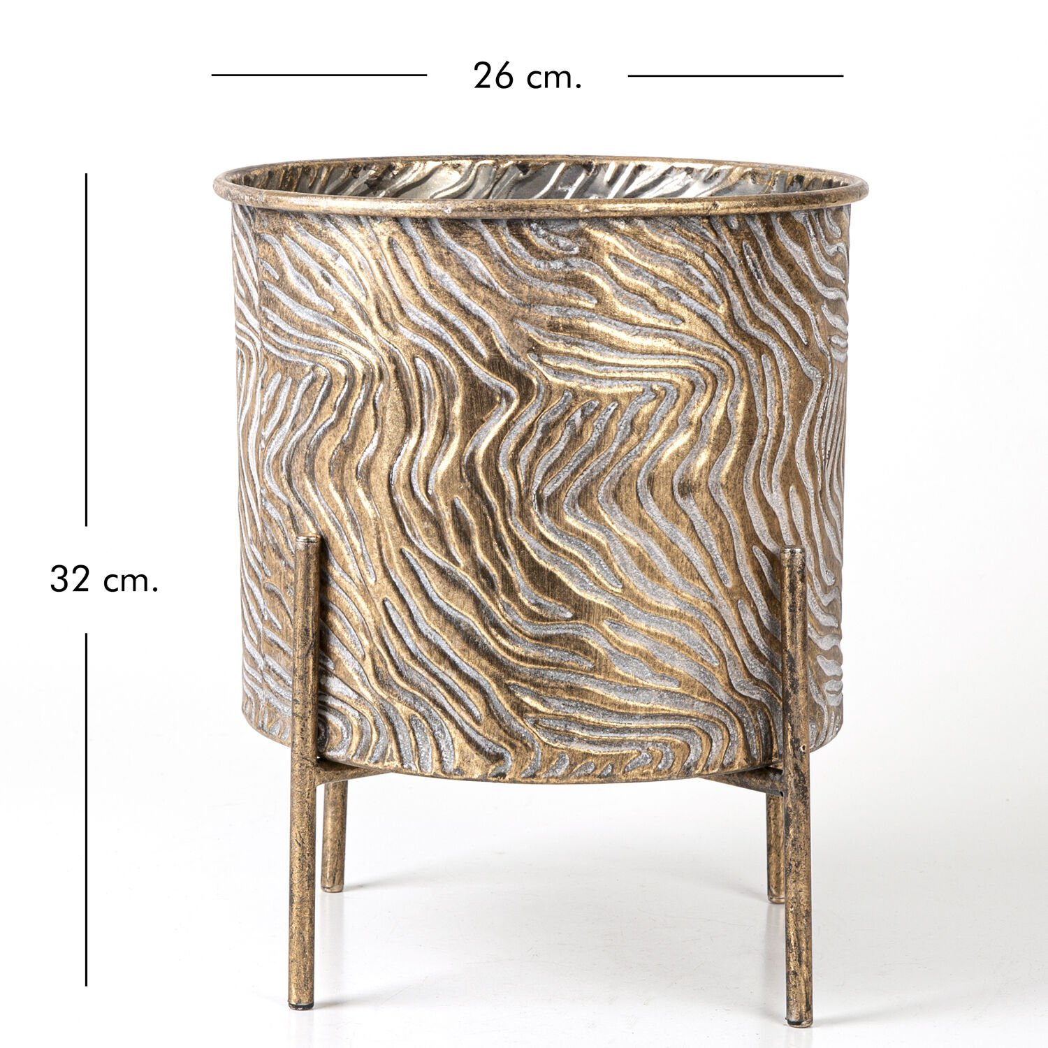 Dalga Desenli Ayaklı Silindir Metal Çiçeklik Altın Eskitme 26x32x26 Cm.