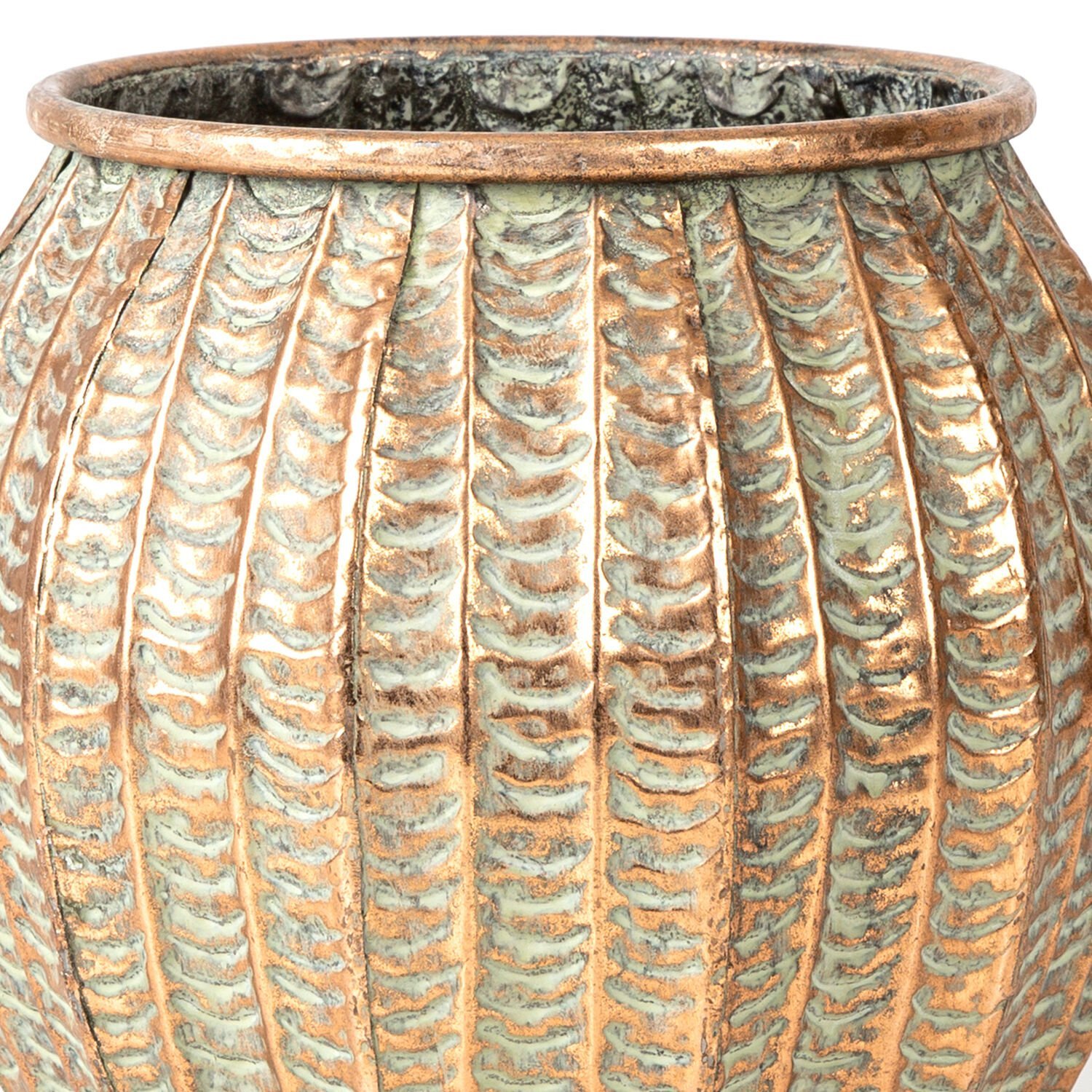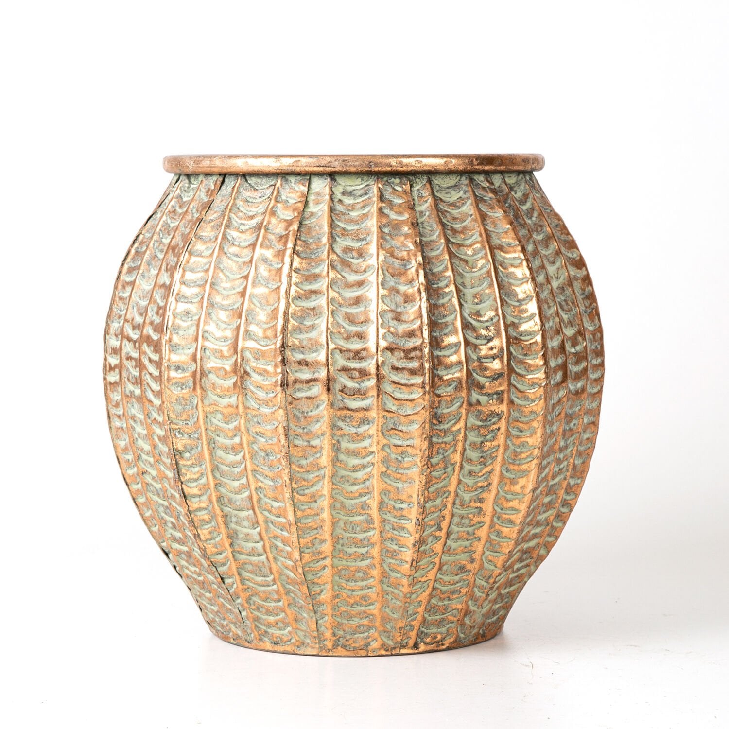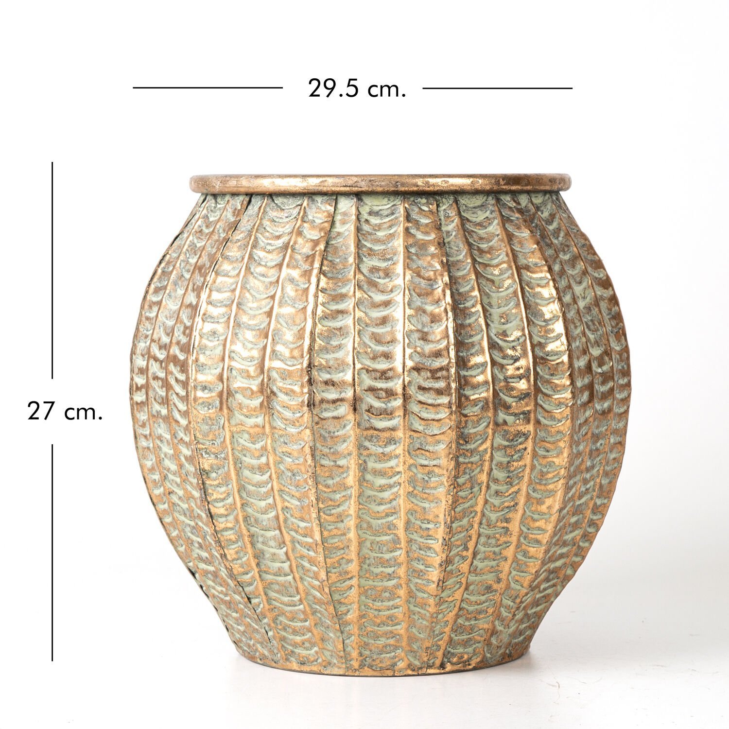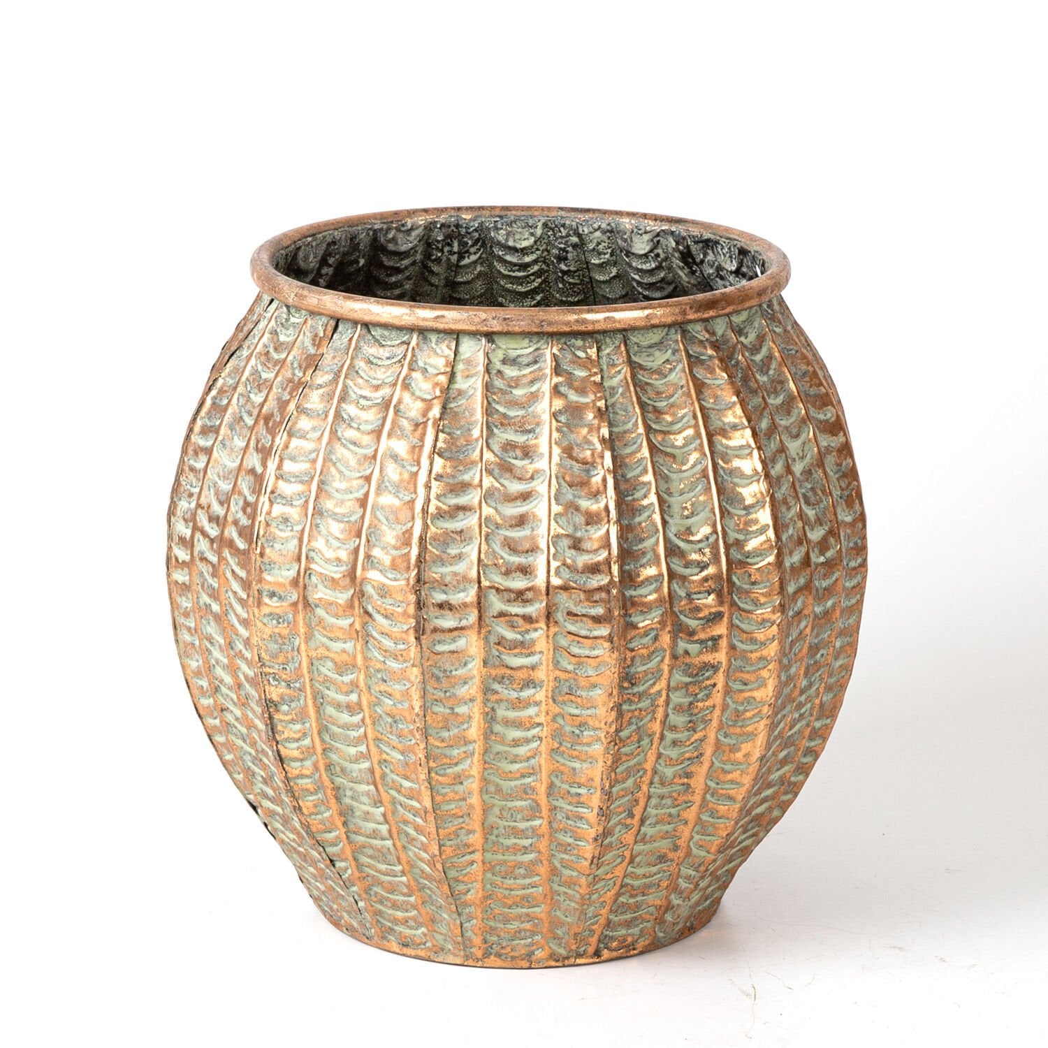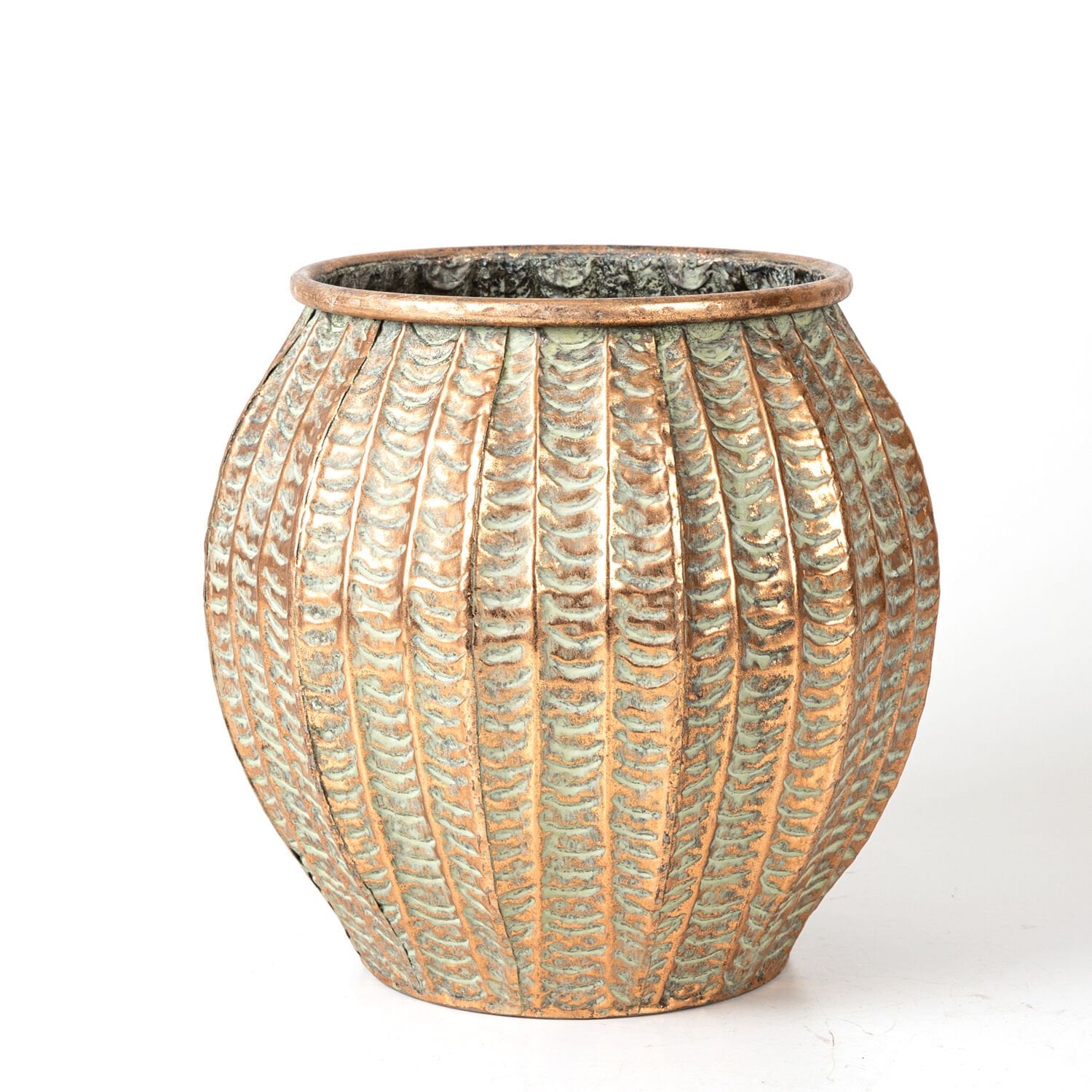 Metal Çiçeklik Saksı, Kabartma Çizgi Desenli, Bakır Eskitme - 29,5x27x29,5 cm
