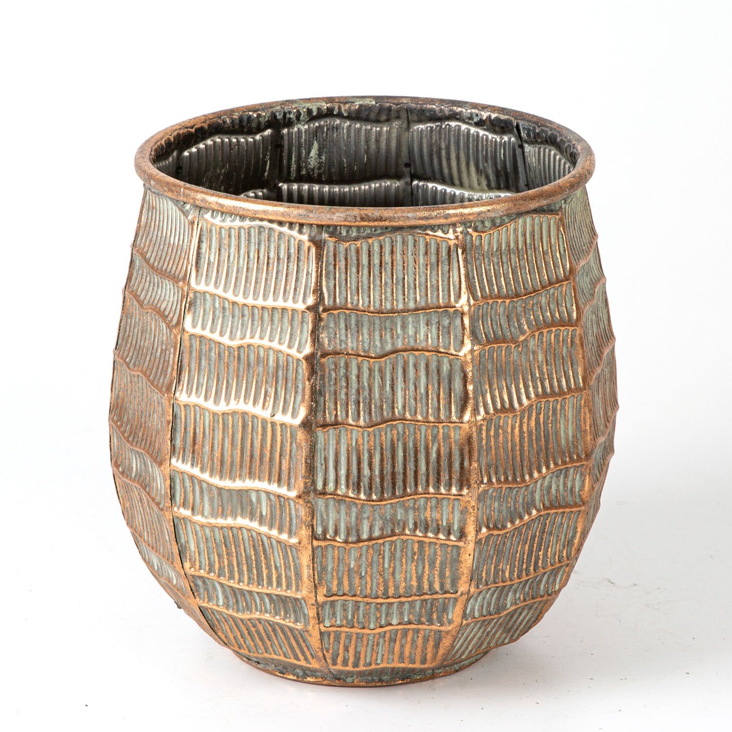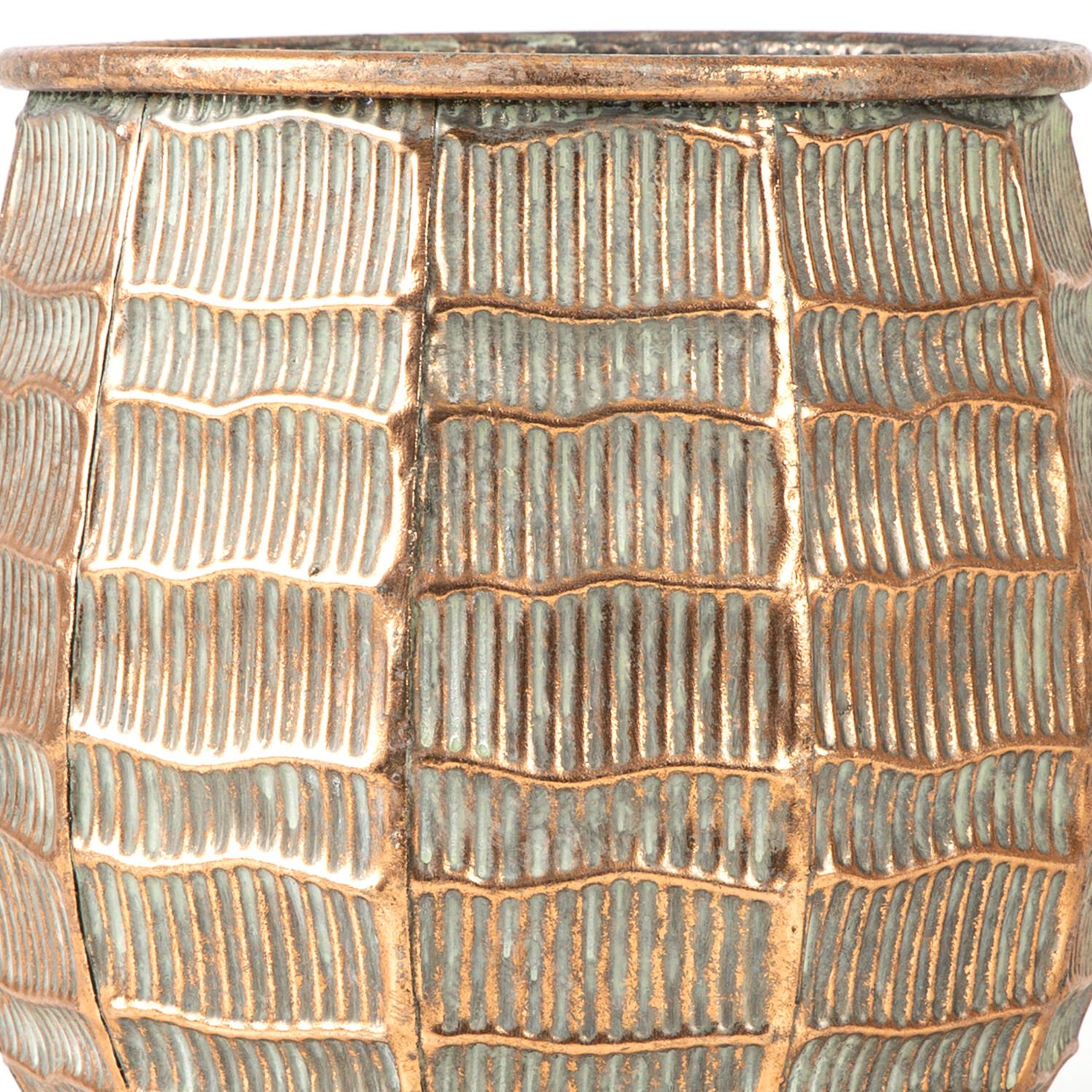 Metal Çiçeklik Saksı, Kabartma Çizgi Desenli, Bakır Eskitme-Gri - 24x23x24 cm