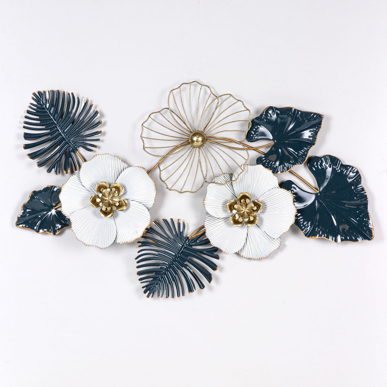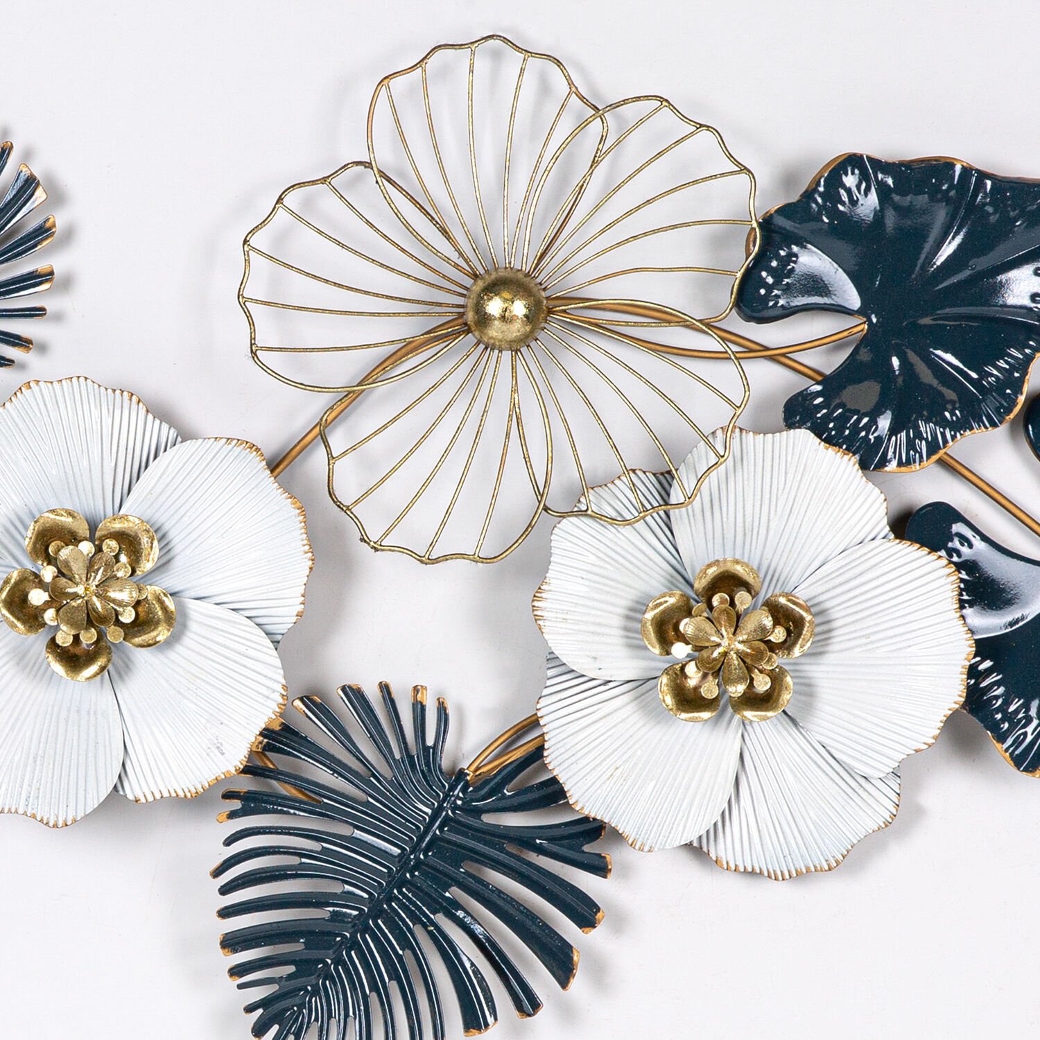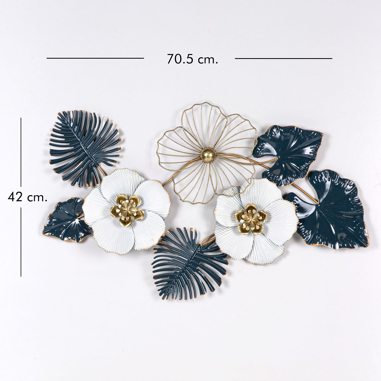 Dekoratif Çiçek Figürlü Metal Duvar Panosu Mavi-Beyaz 70x42x6 Cm.