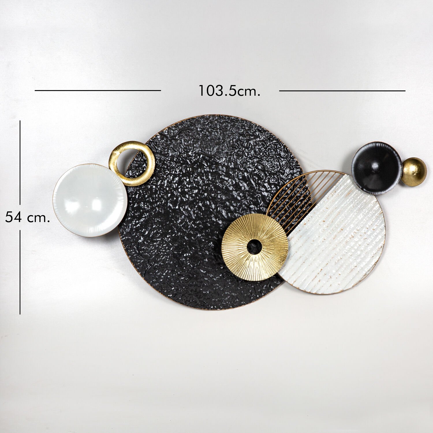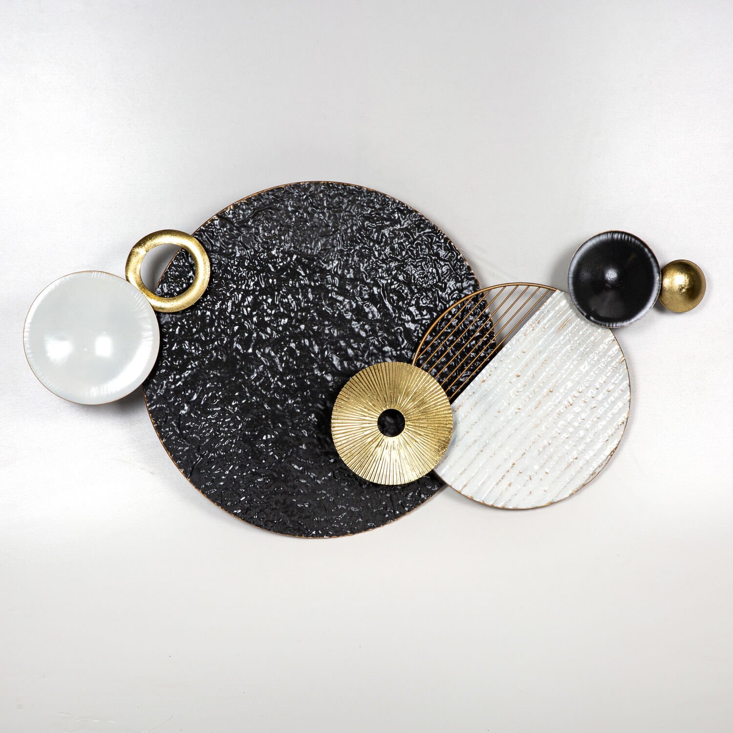 Metal Duvar Panosu, Daire Figürlü, Siyah-Beyaz-Gold - 103x54x6 cm