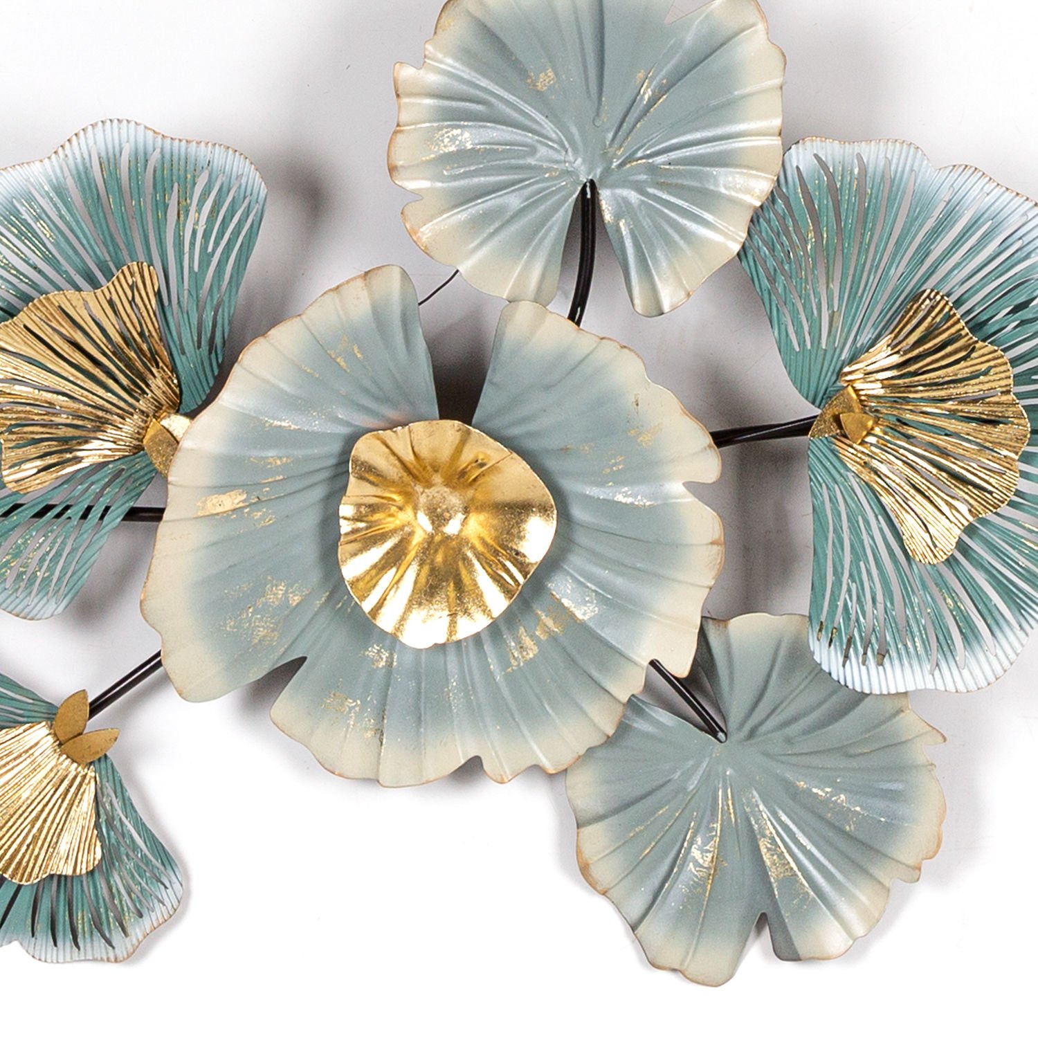 Metal Duvar Panosu, Yaprak Figürlü, Gold-Turkuaz - 92x49x7 cm