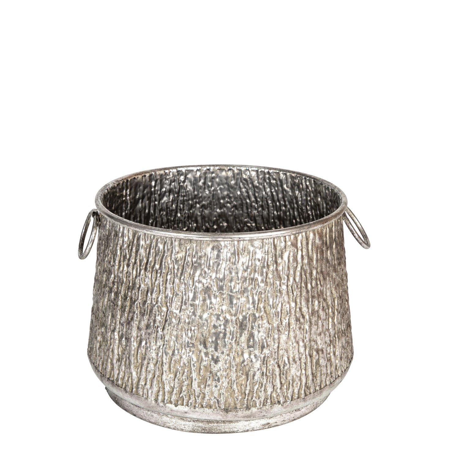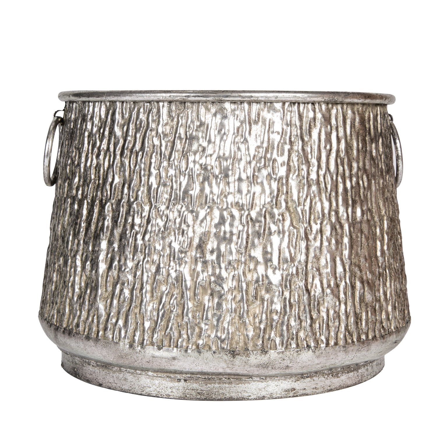 Metal Kazan Saksı, Kulplu, Kabartma Desenli, Gümüş Eskitme - 39,5x29 cm