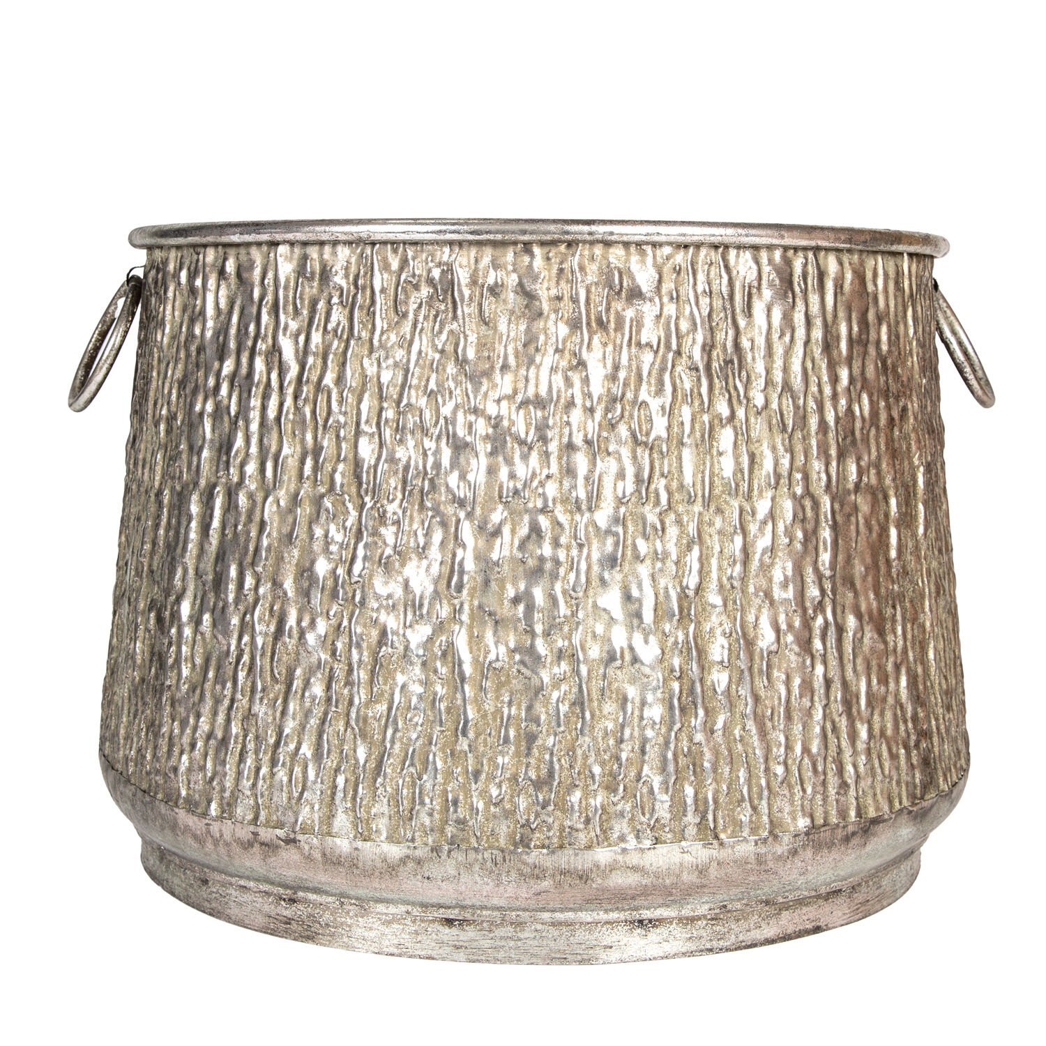 Metal Kazan Saksı, Kulplu, Kabartma Desenli, Gümüş Eskitme - 45x33 cm