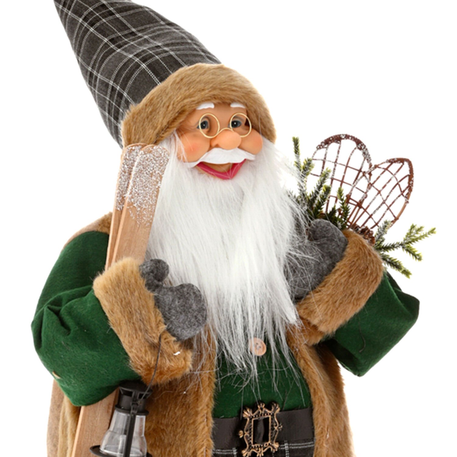 Noel Baba, Kadife Elbiseli, Yeşil - Sağ Elinde Kayak ve Fener Taşıyan, 40x60 cm