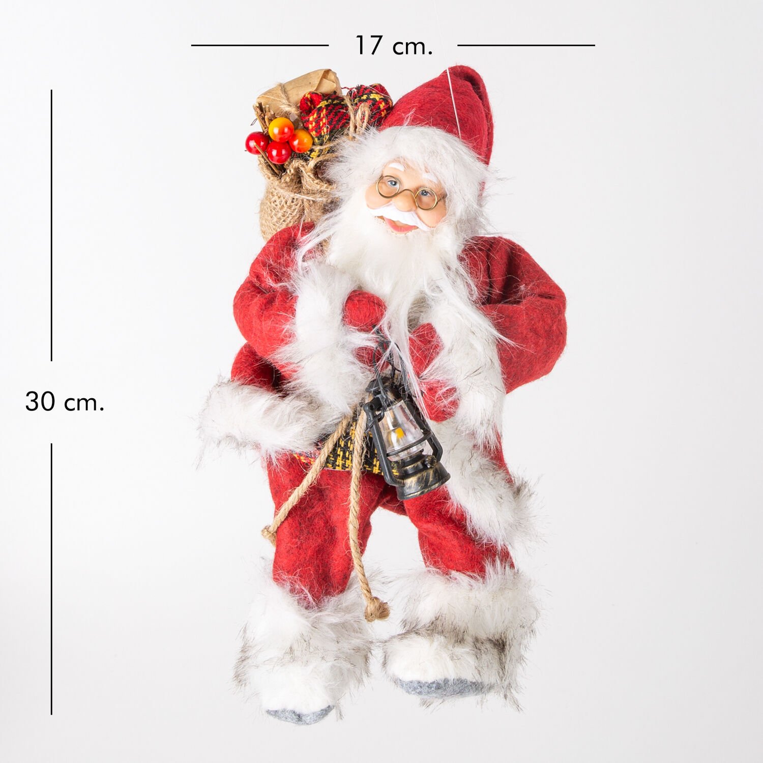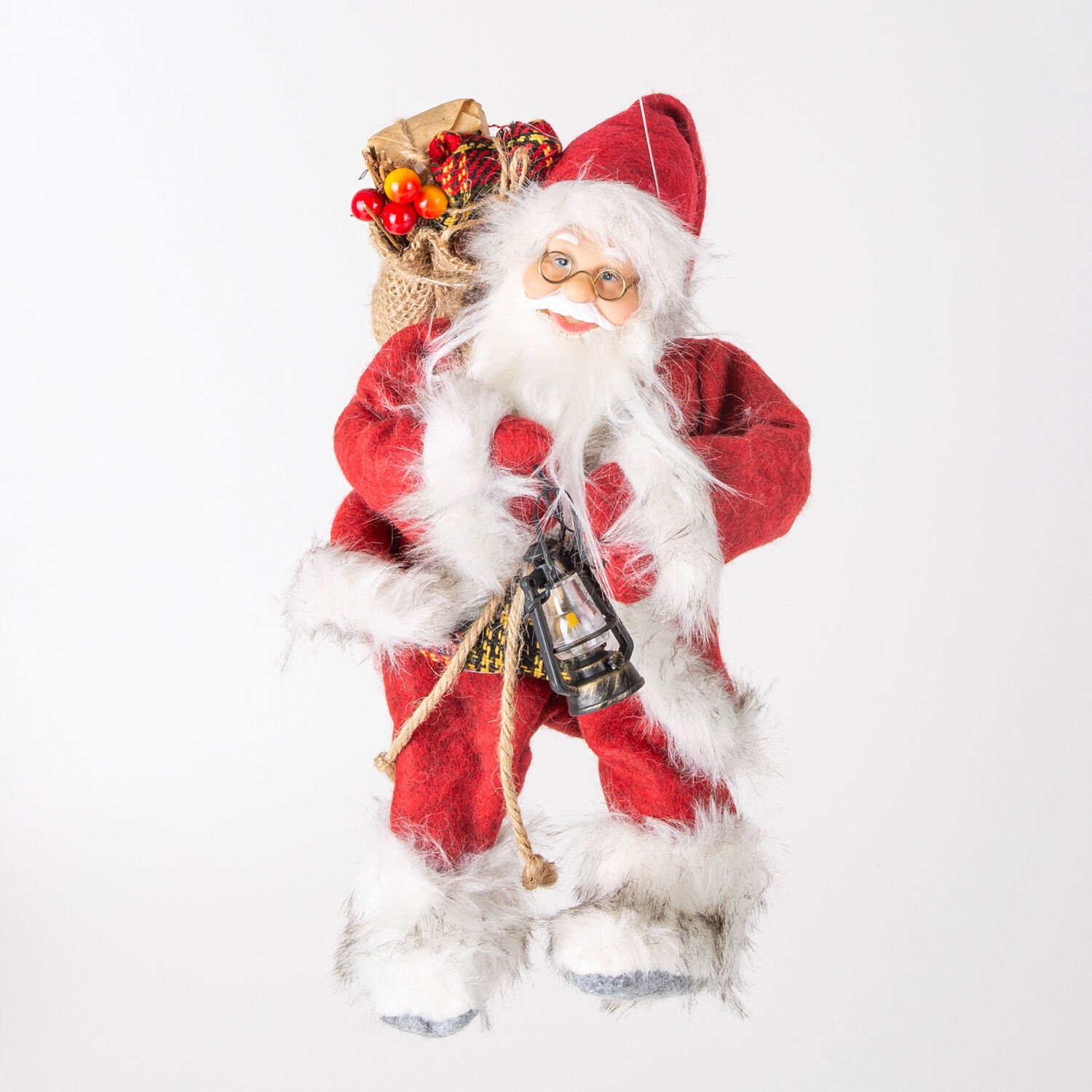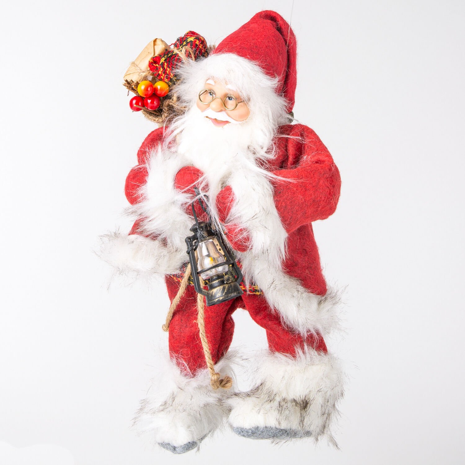 Noel Baba, Klasik, Kadife Elbiseli, Kırmızı - Hediye Paketi ve Fener Taşıyan, 17x30 cm