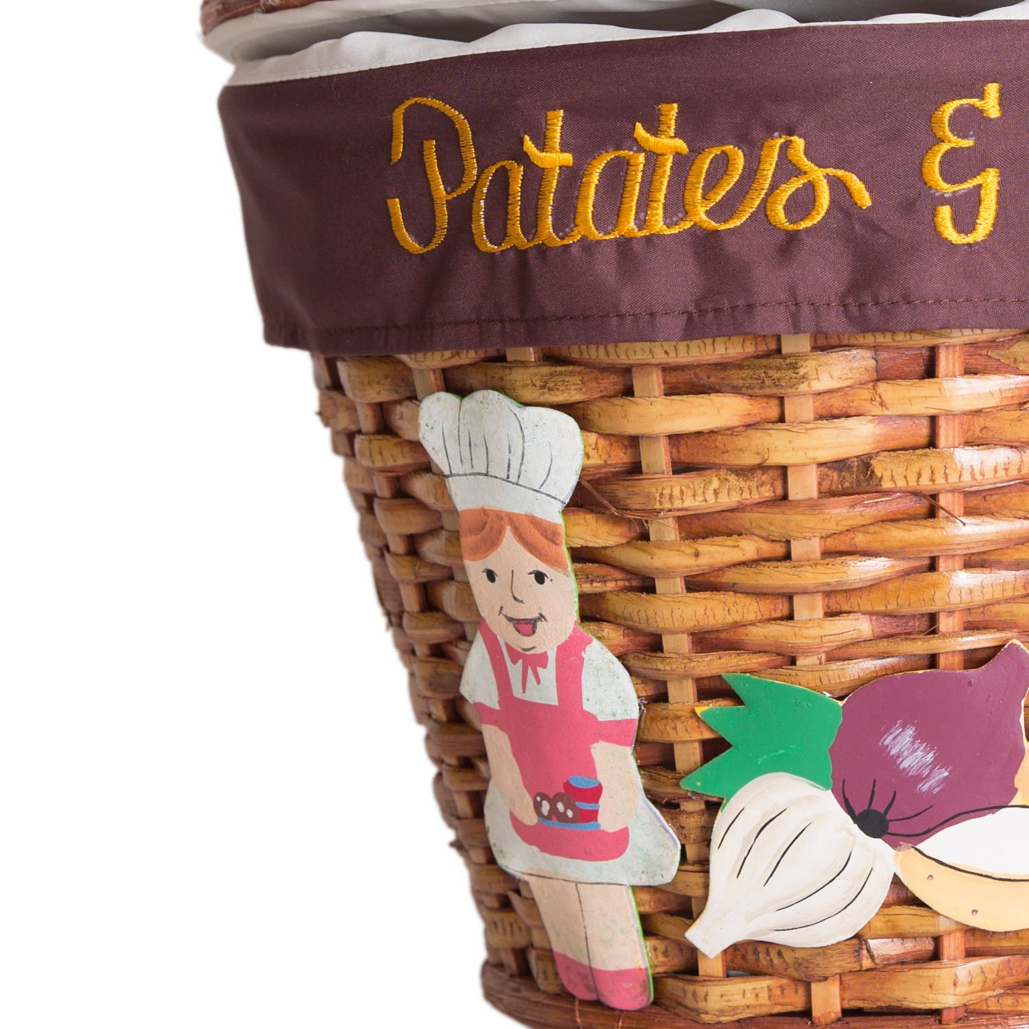 Patates Soğan Sepeti, Kapaklı, Bambu, Bayan Şef Figürlü, Koyu Kahve Kuşaklı, Kahverengi - Kumaş İçli, 28 x 23 cm