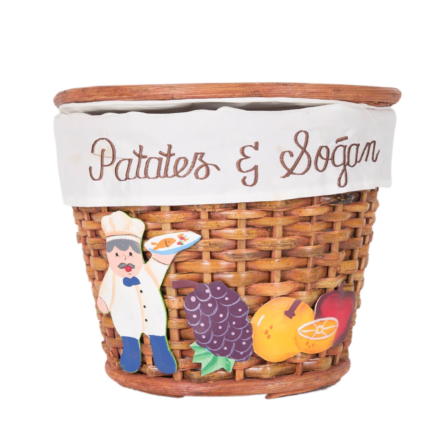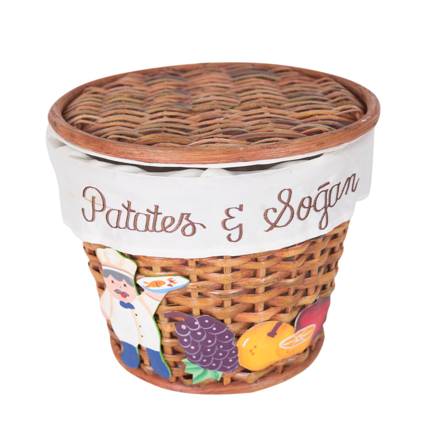 Kapaklı Bambu Patates Soğan Sepeti (Kumaş İçli) Erkek Şef Figürlü Beyaz Kuşaklı Kahverengi 32 X 25 Cm.