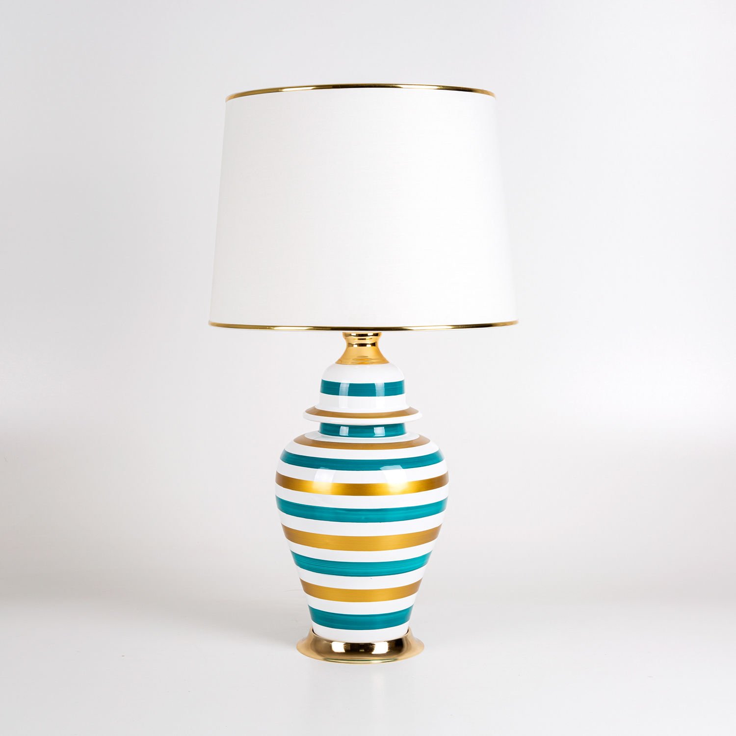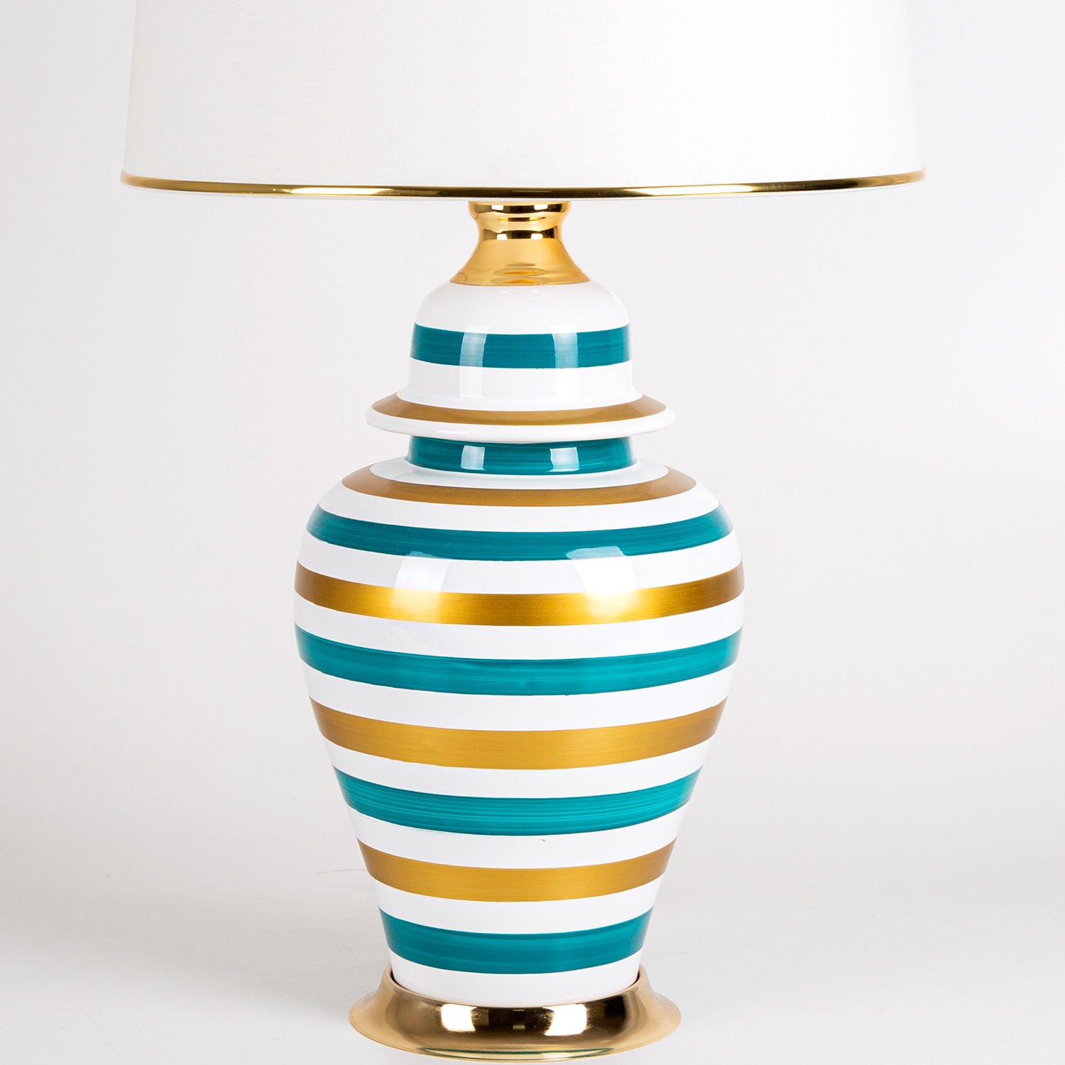Seramik Abajur, Klasik, Beyaz-Turkuaz-Altın - Seramik Gövdeli, Krem Şapkalı, Çizgi Desenli, Rainbow, 35 x 64 cm
