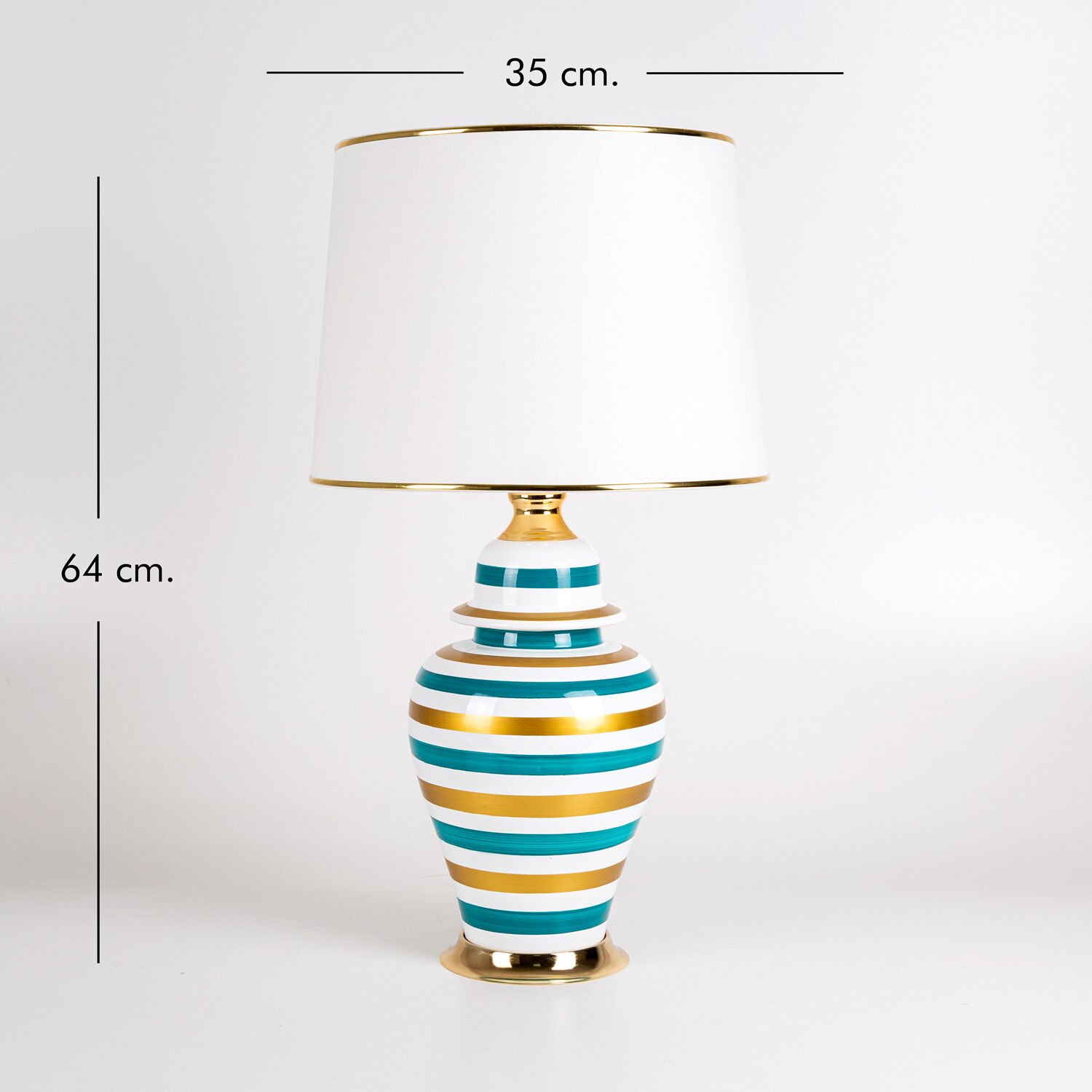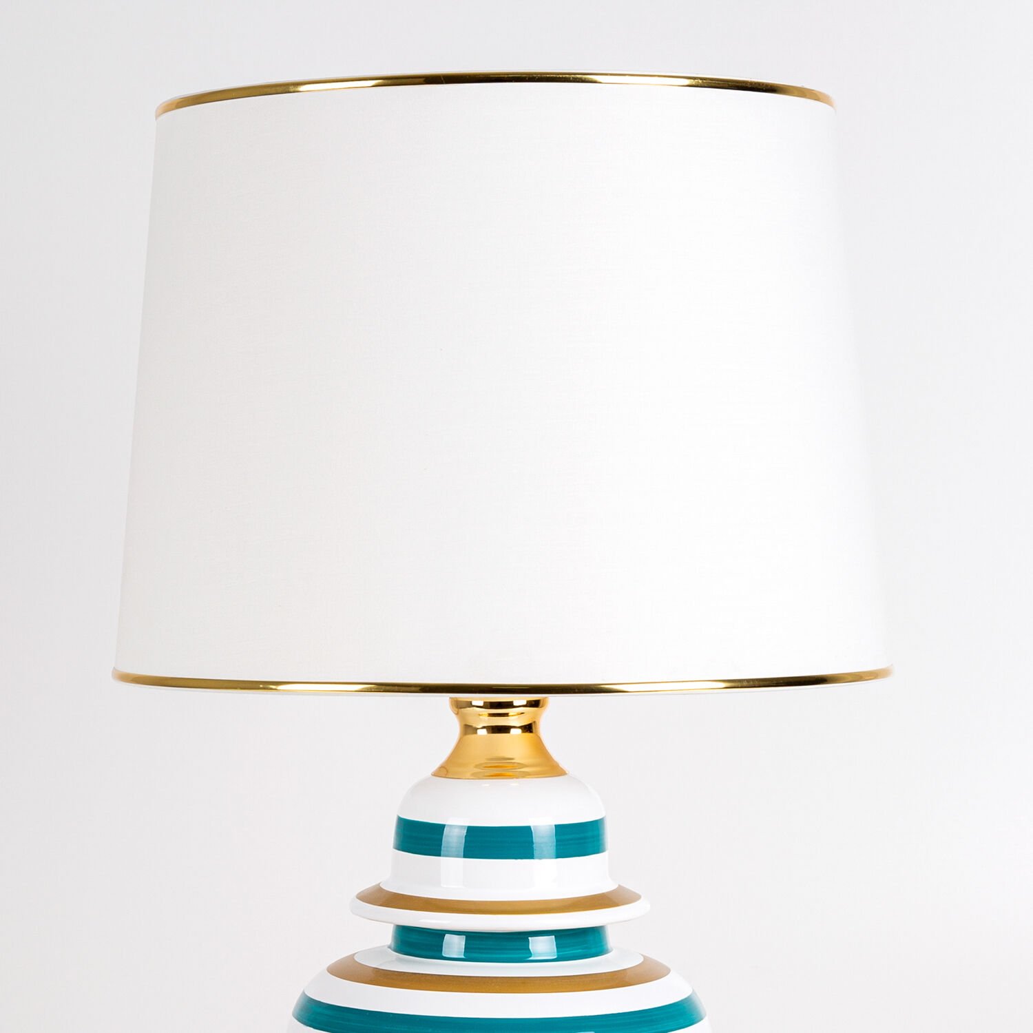 Seramik Gövdeli Krem Şapkalı Çizgi Desenli Rainbow Klasik Abajur Beyaz-Turkuaz-Altın 35 x 64 Cm.