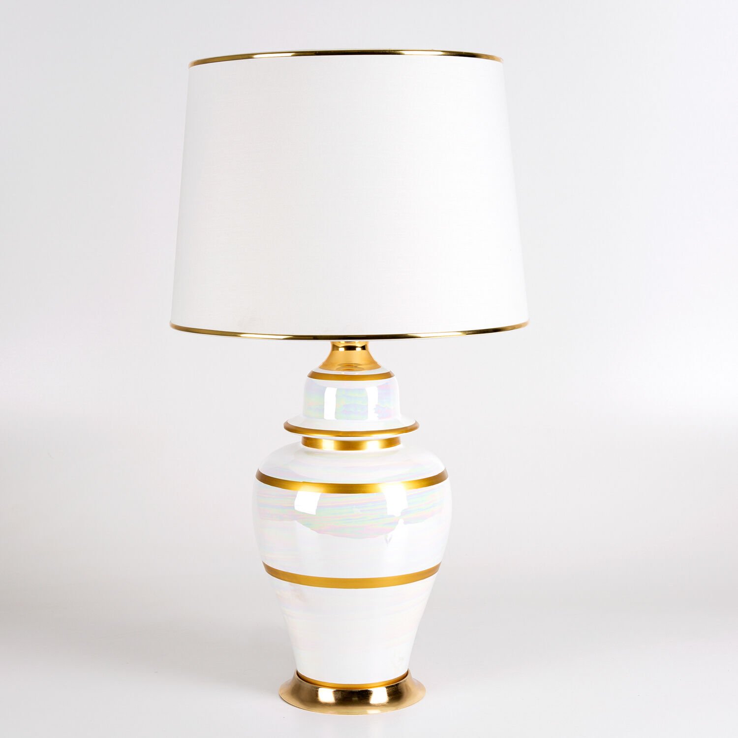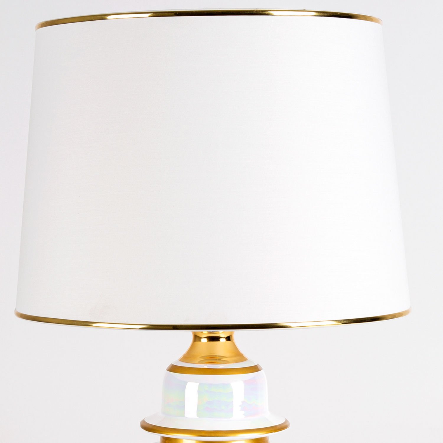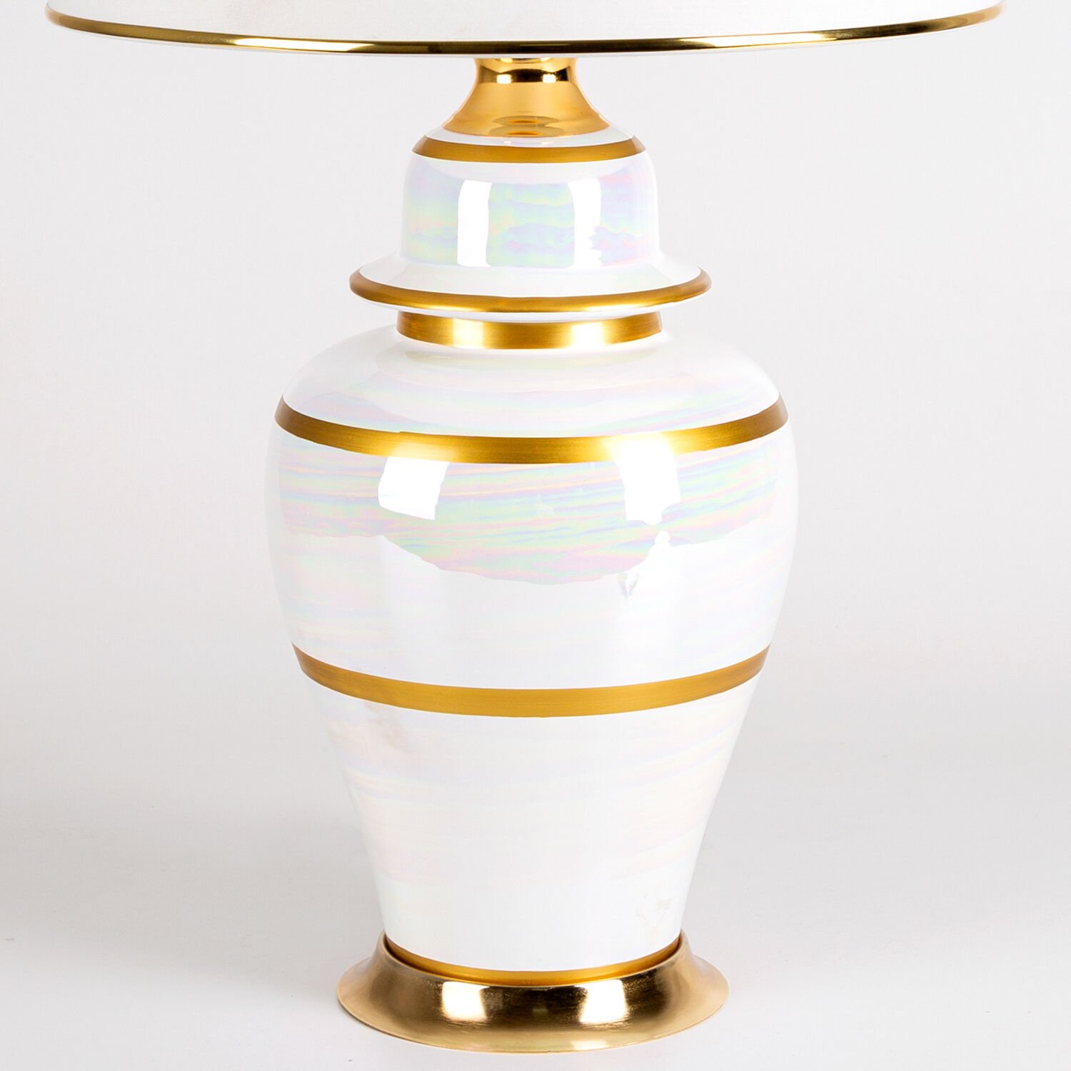 Seramik Abajur, Klasik, Krem-Altın - Seramik Gövdeli, Krem Şapkalı, Çizgi Desenli, İnci Alacalı, 35 x 64 cm