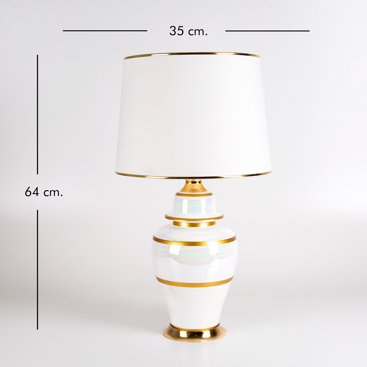 Seramik Gövdeli Krem Şapkalı Çizgi Desenli İnci Alacalı Klasik Abajur Krem-Altın 35 x 64 Cm.