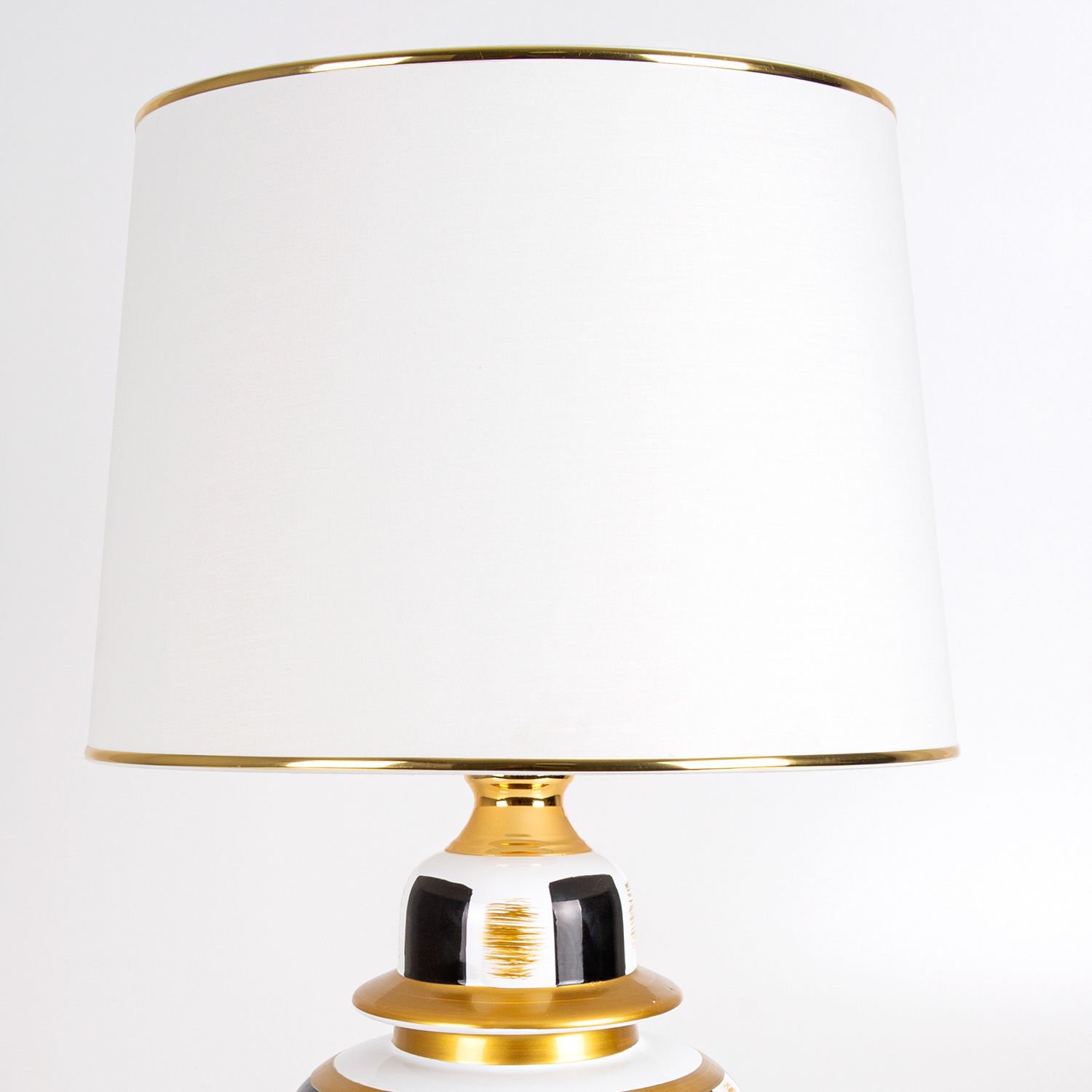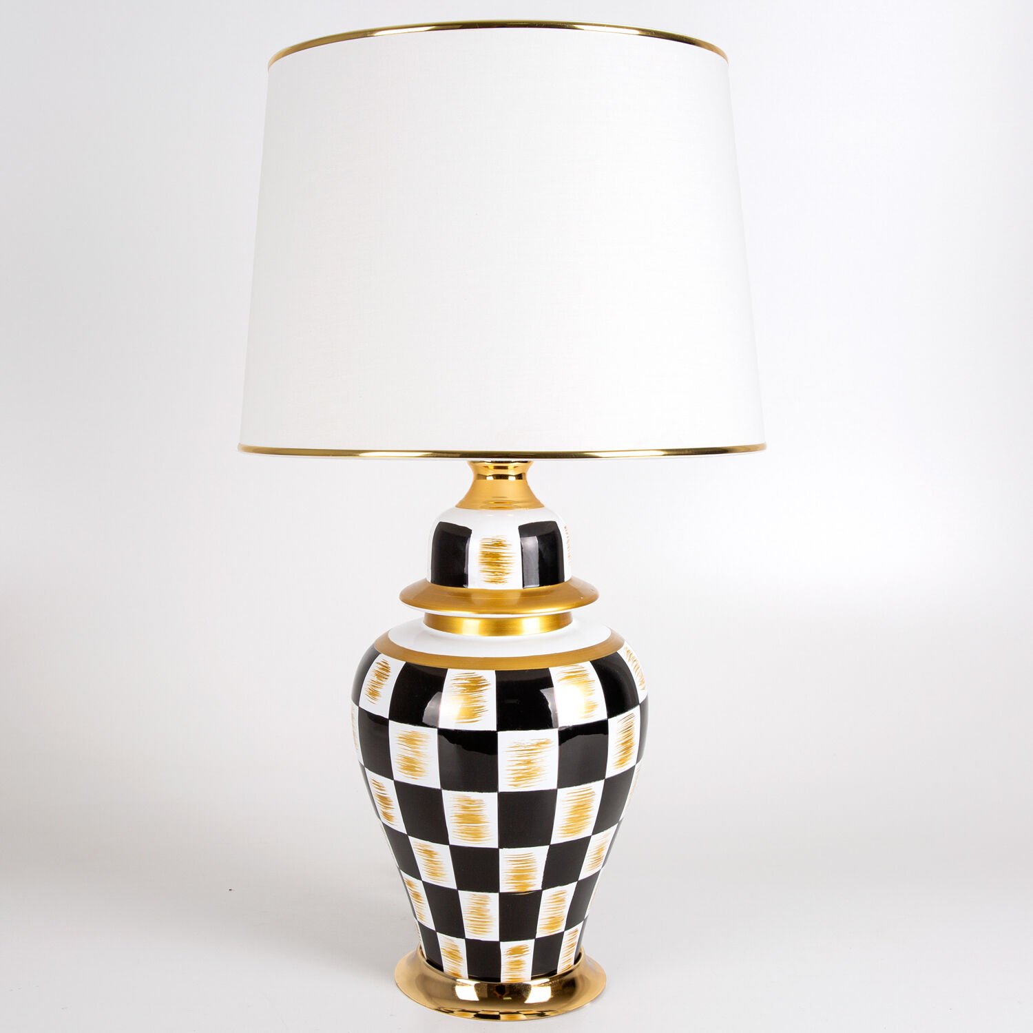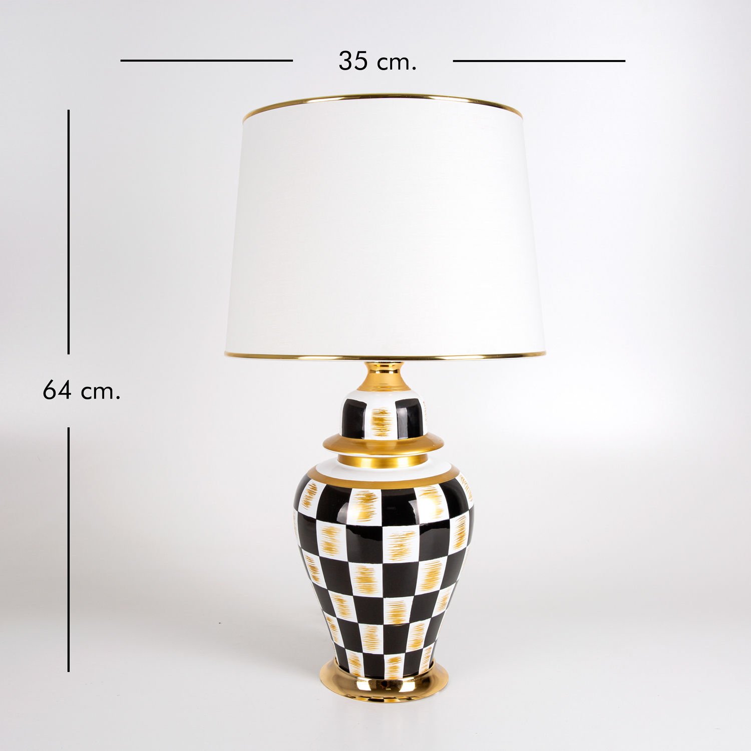 Seramik Gövdeli Krem Şapkalı Dama Desenli Klasik Abajur Siyah-Altın 35 x 64 Cm.