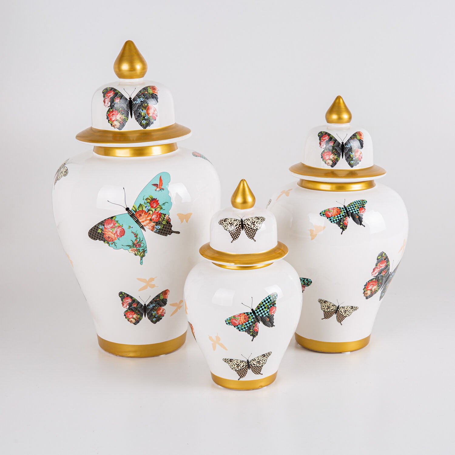 Seramik Küp Vazo, Klasik, Kelebek Desen - Kapaklı, 3'lü Set