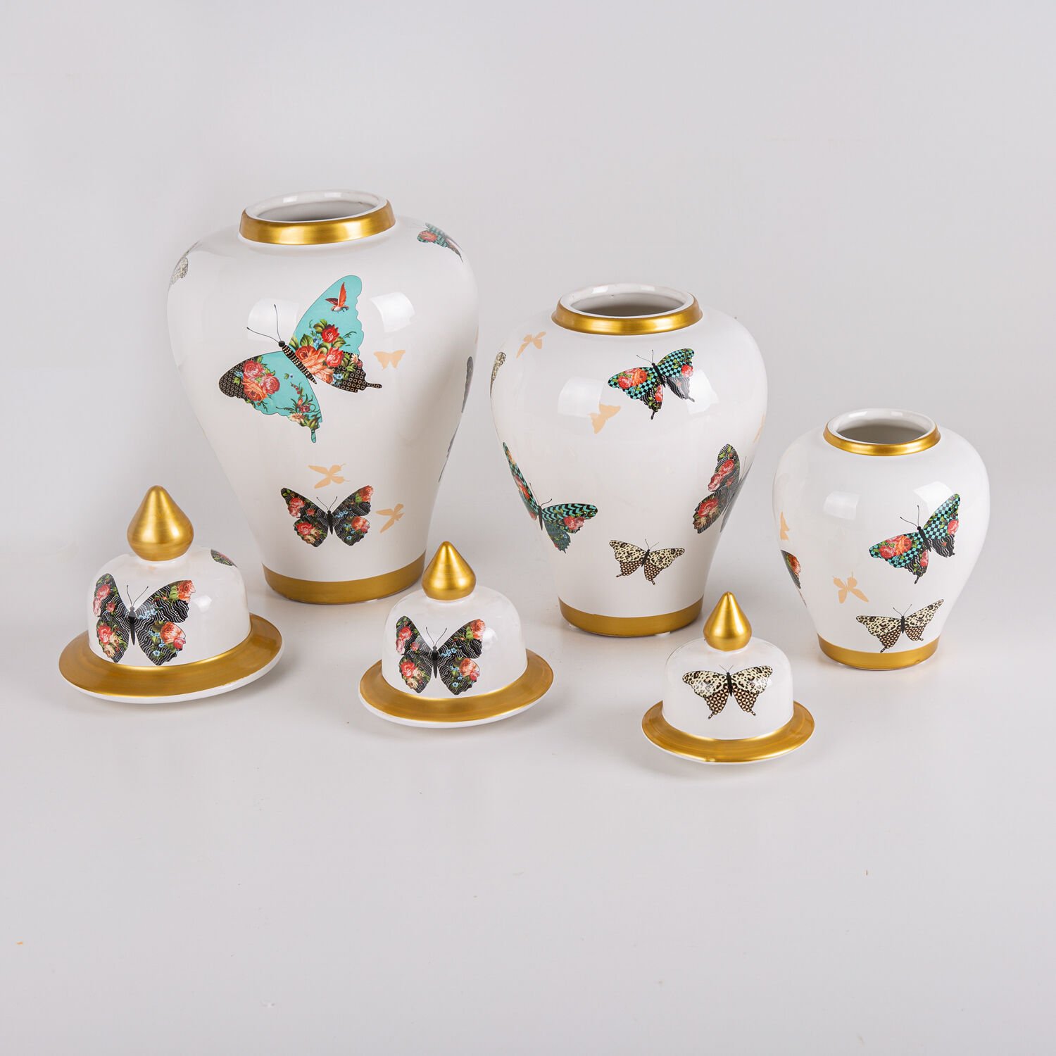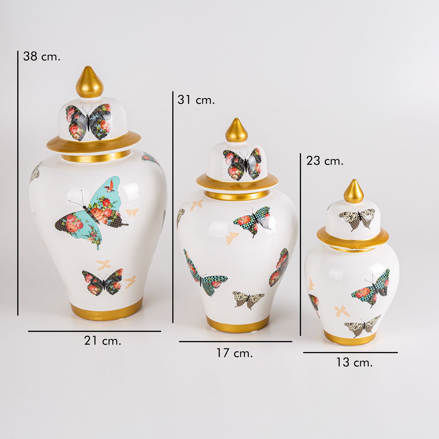 Seramik Kapaklı Klasik Küp Vazo 3'Lü Set - Kelebek Desen