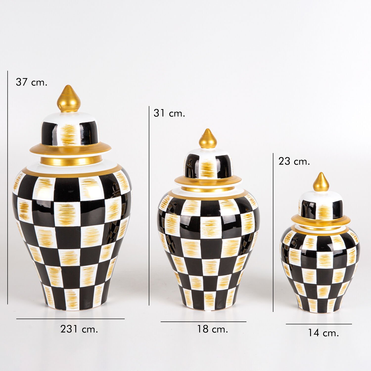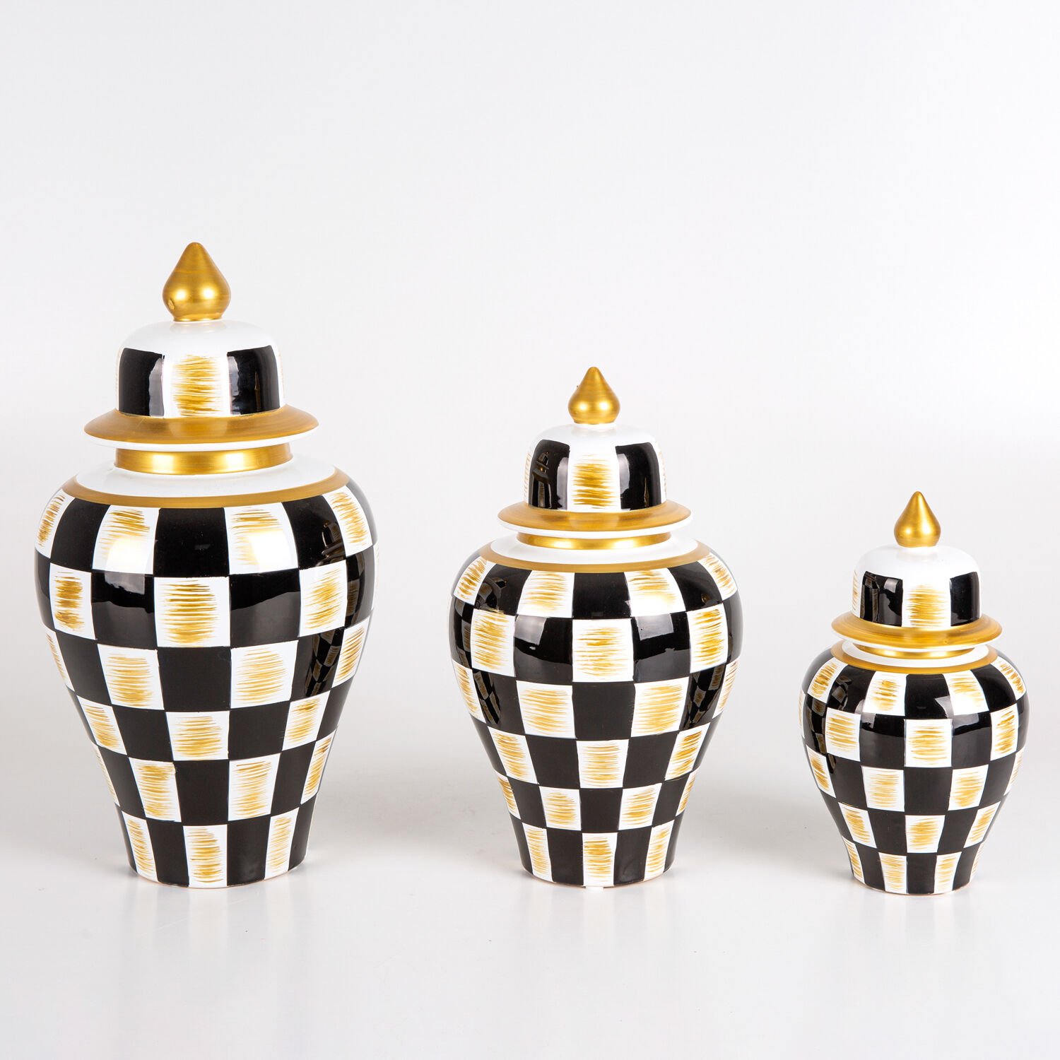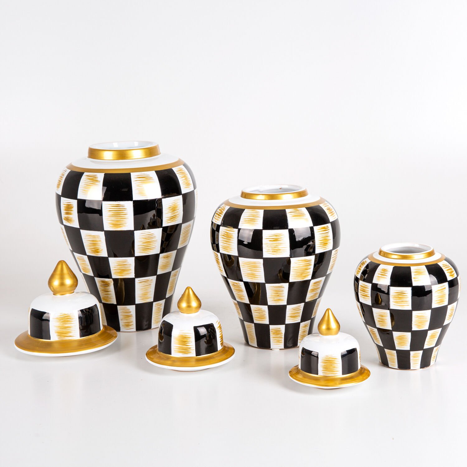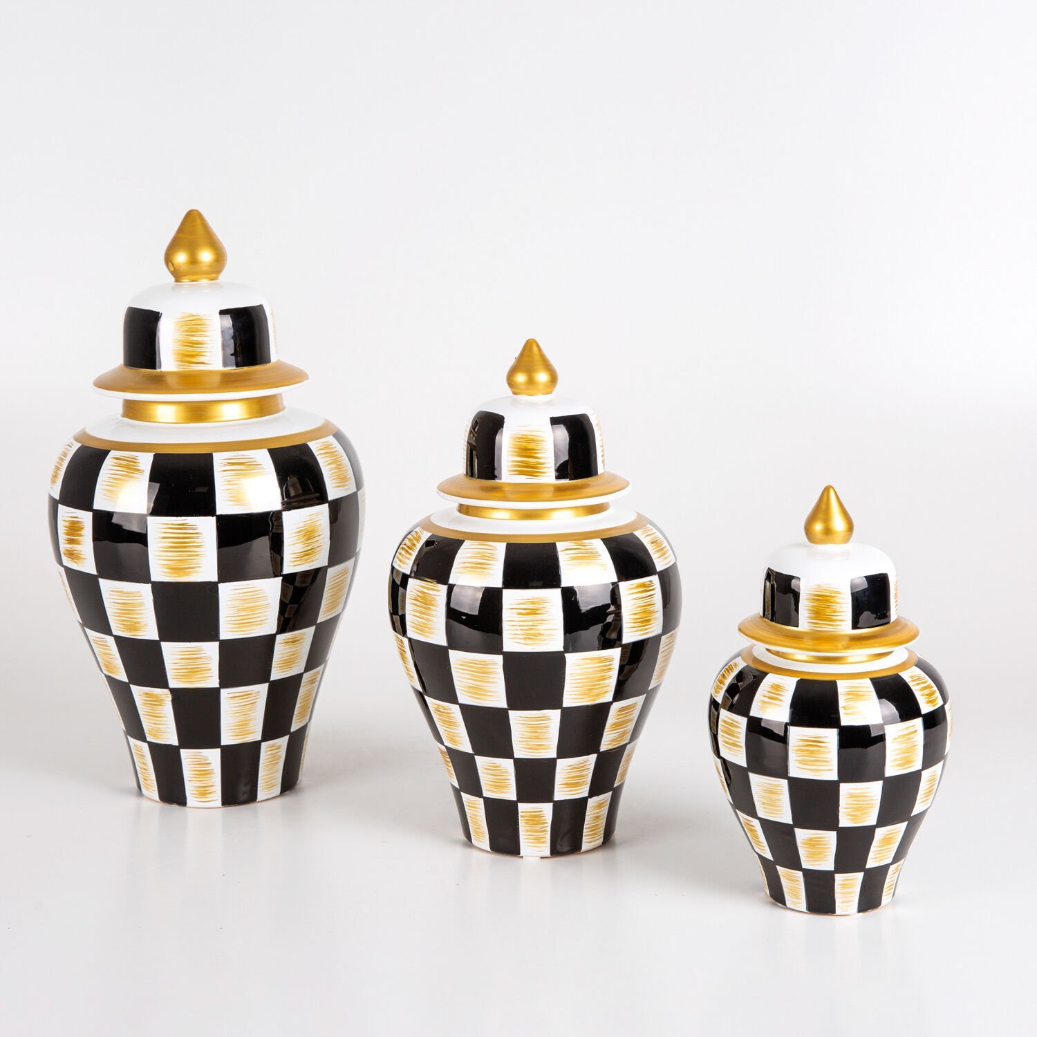 Seramik Küp Vazo, Klasik, Siyah-Beyaz-Altın - El Boyama, Kapaklı, Siyah Dama Motifli, 3'lü Set