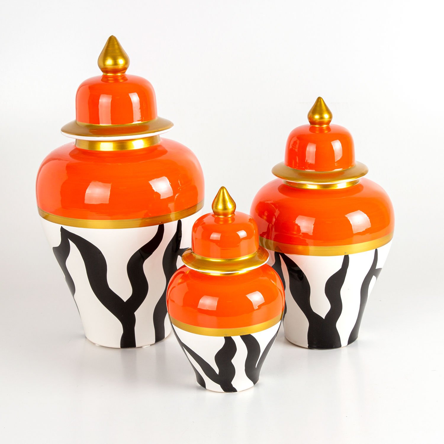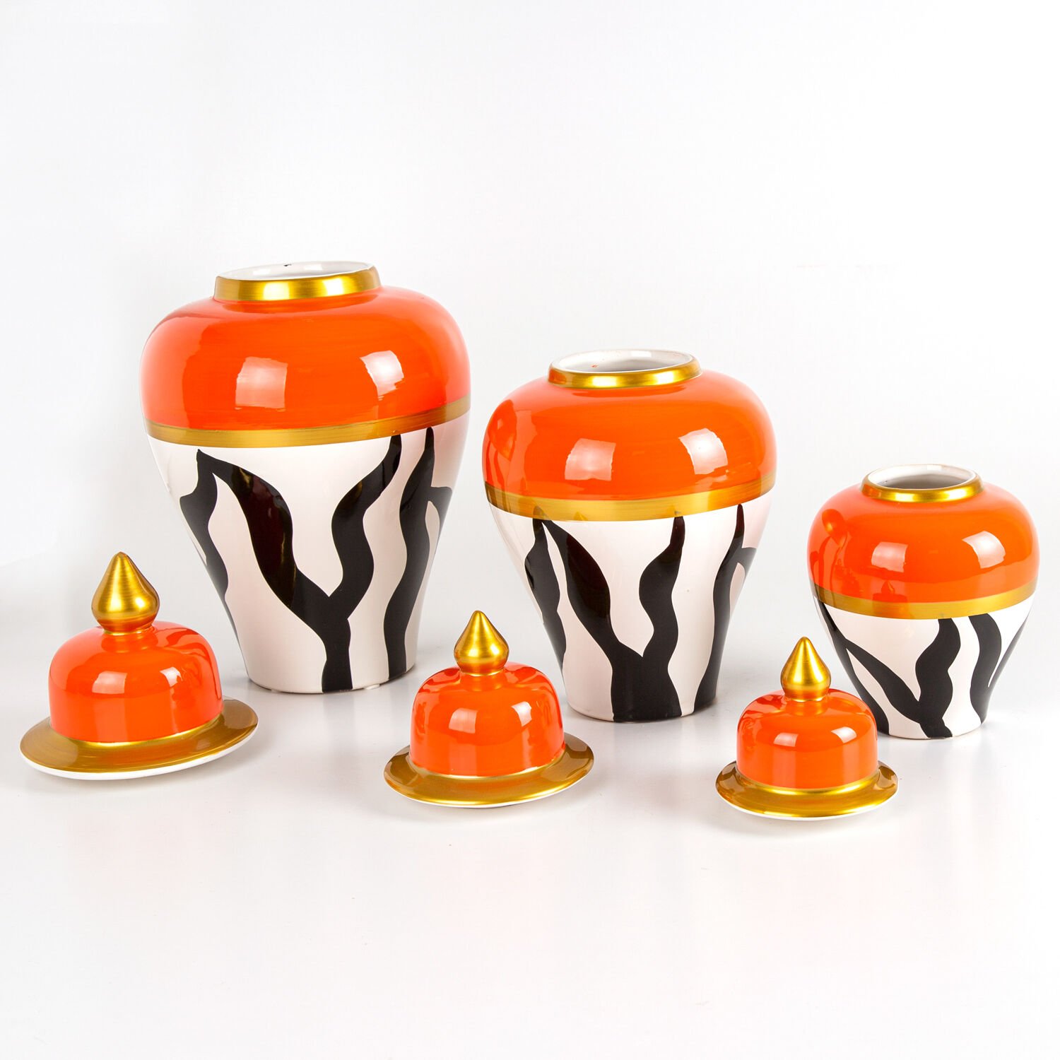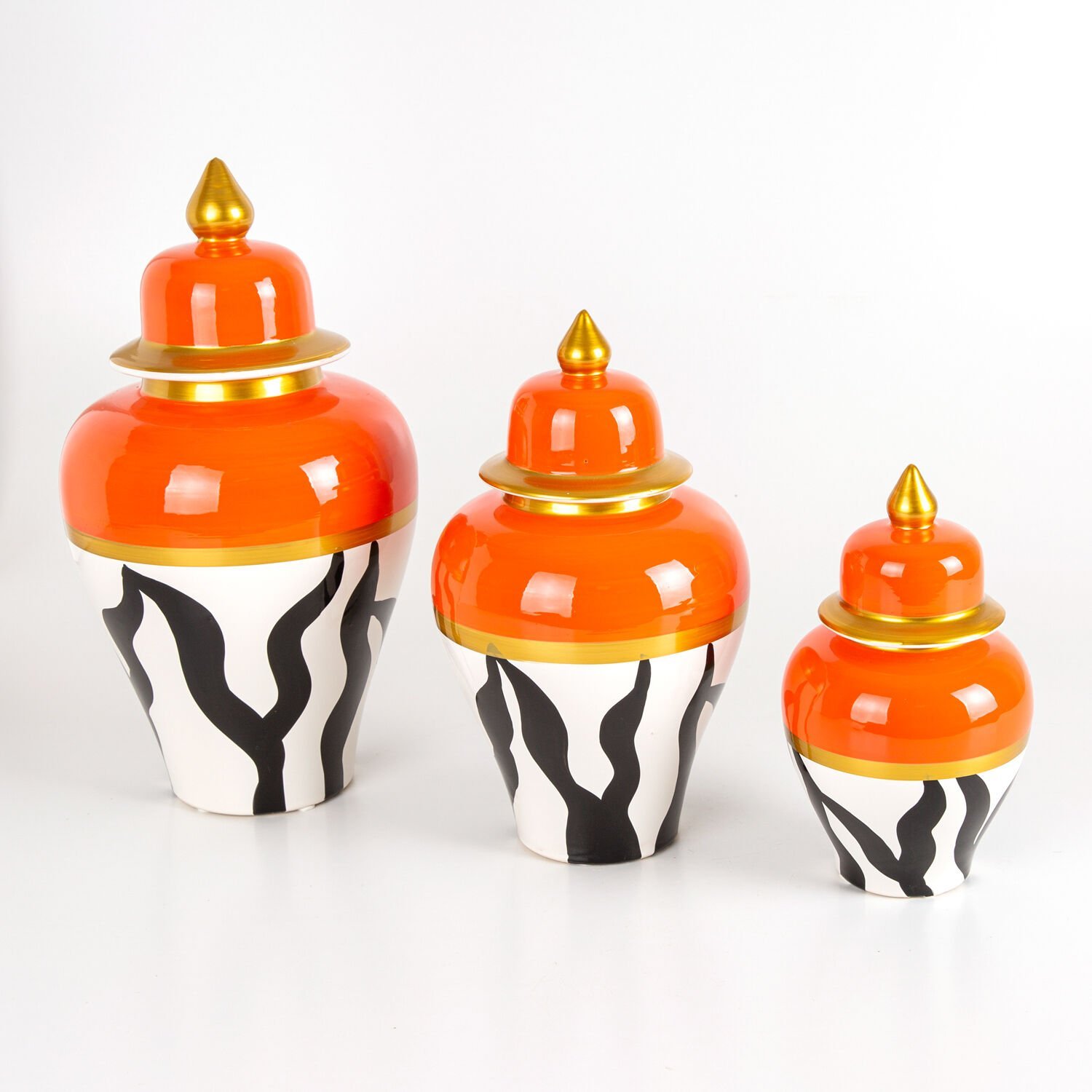 Seramik Kapaklı Klasik Küp Vazo 3'Lü Set - Turuncu El Boyama