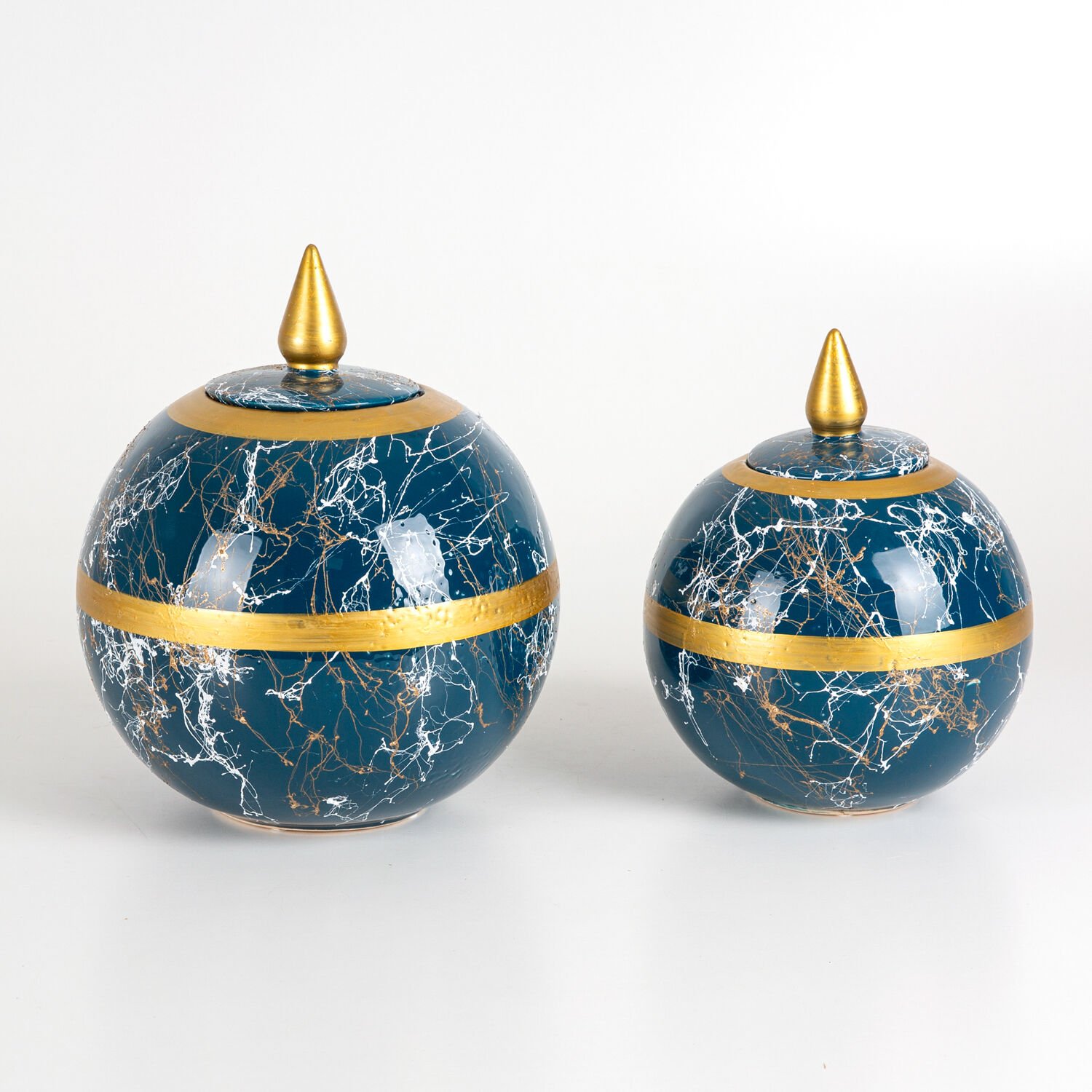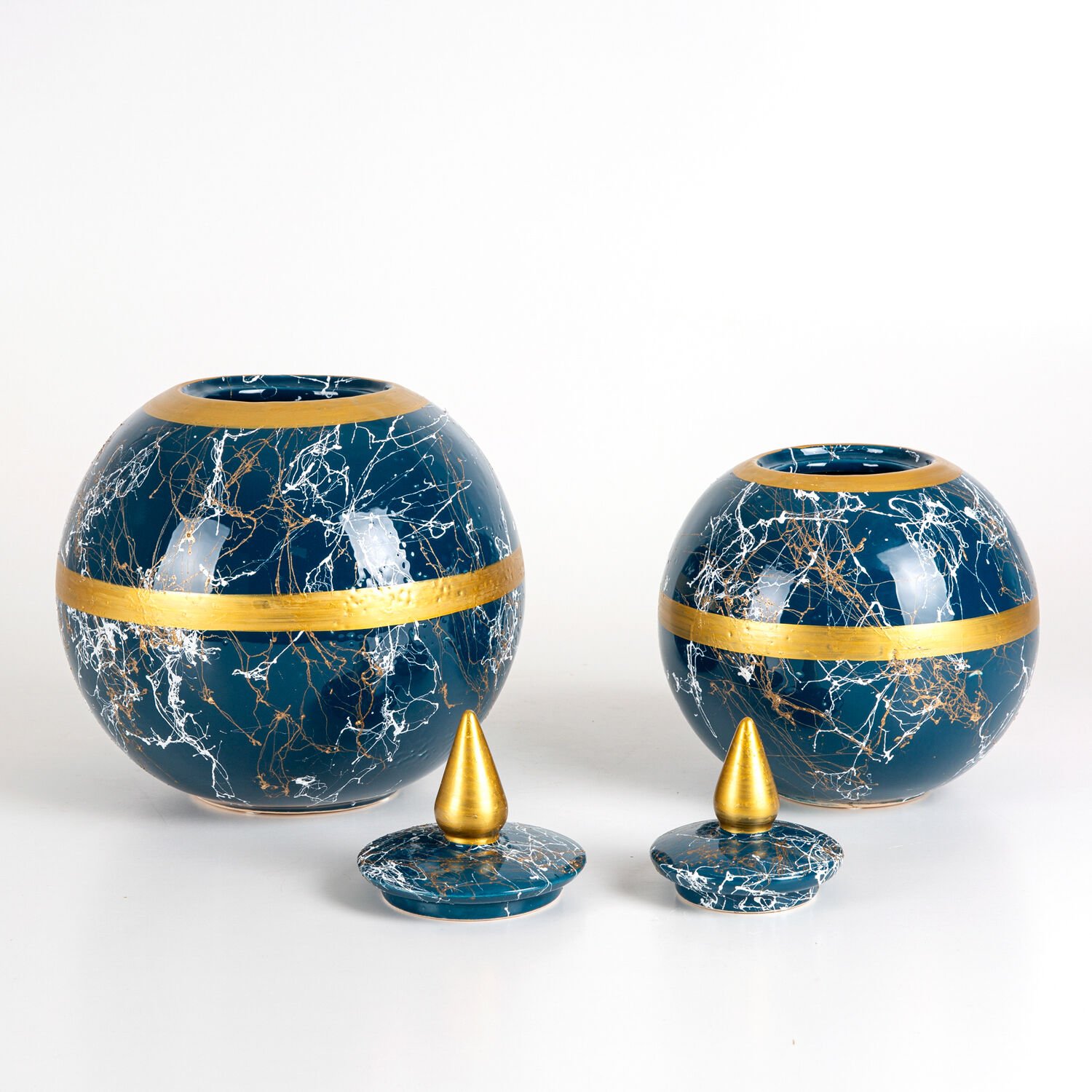 Seramik Kapaklı Küre Küp Vazo Mermer Görünümlü 2'li Set Gece Mavisi