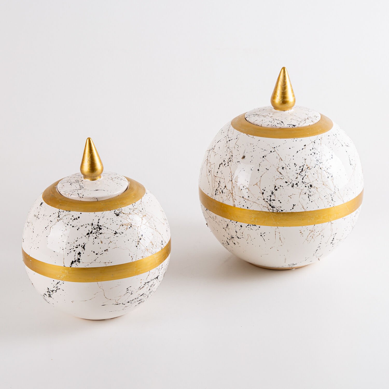 Seramik Kapaklı Küre Küp Vazo 2'Li Set Krem Mermer