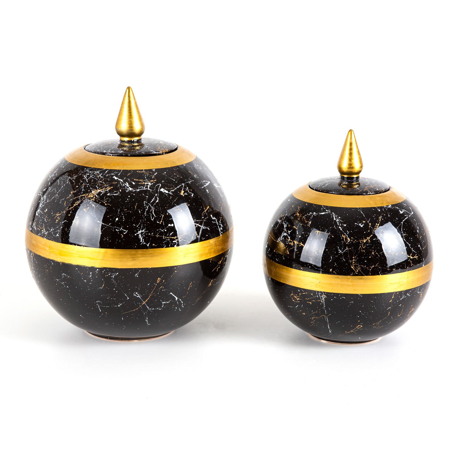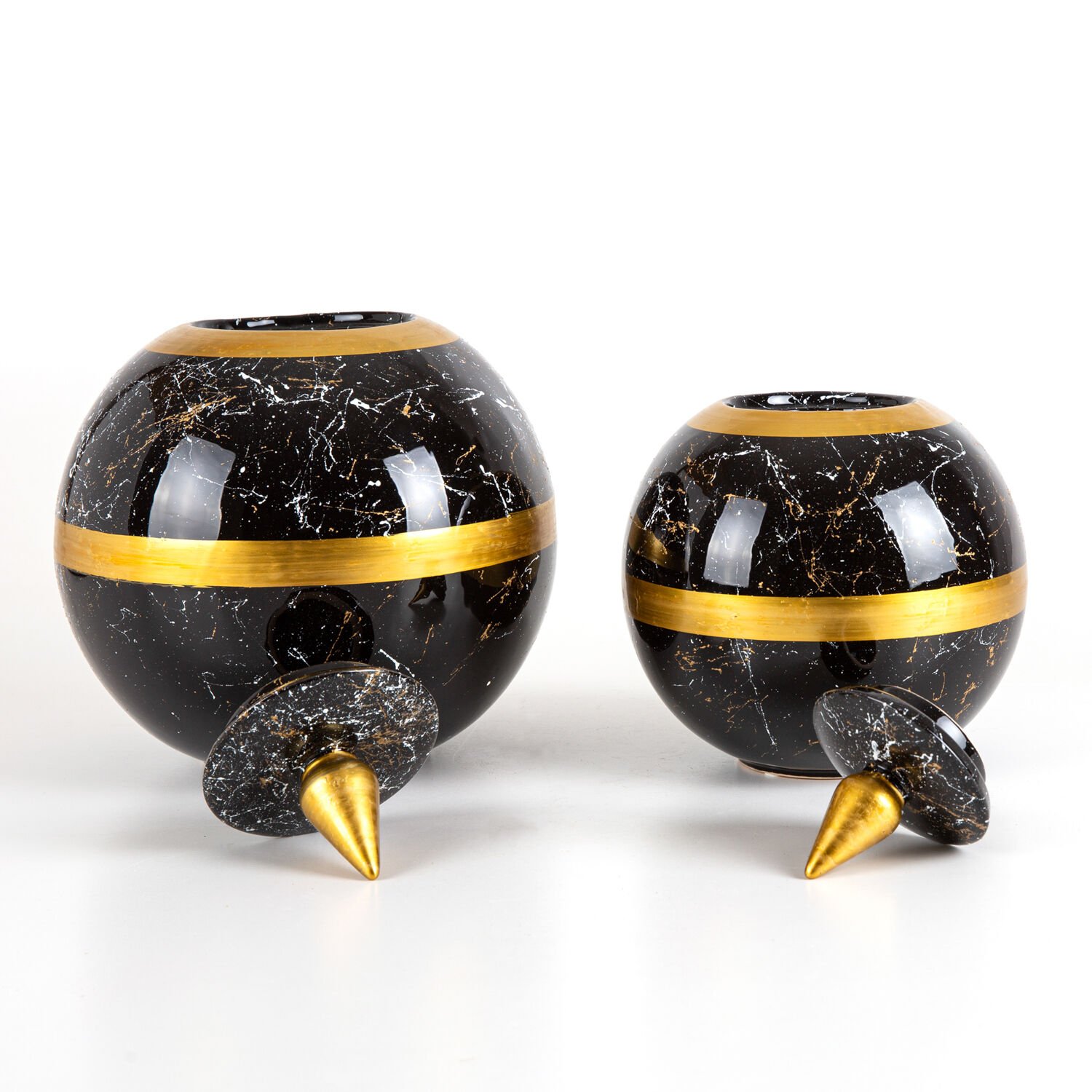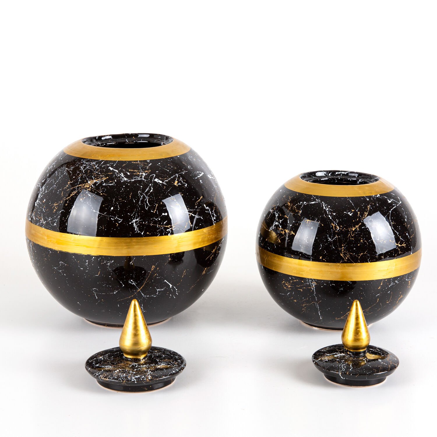 Seramik Kapaklı Küre Küp Vazo 2'Li Set - Siyah Mermer