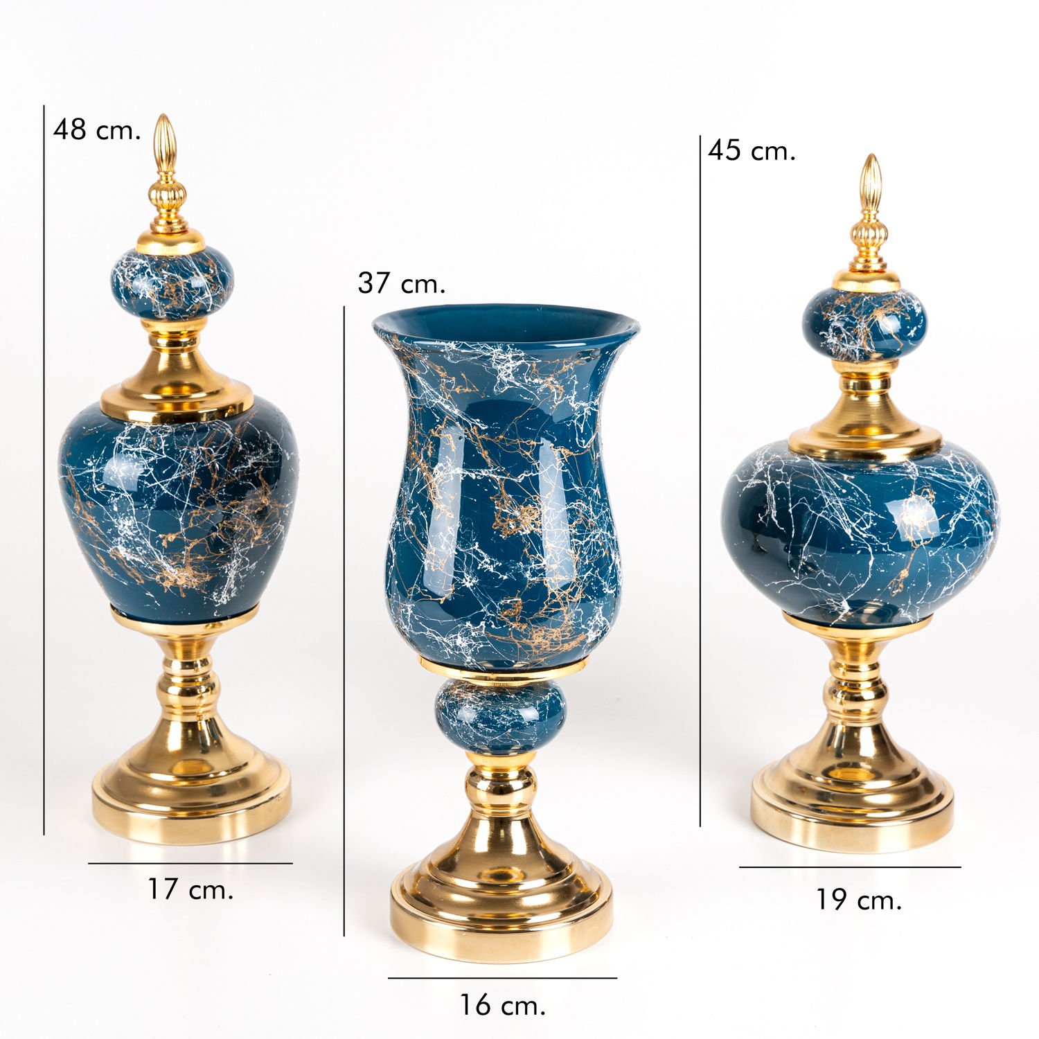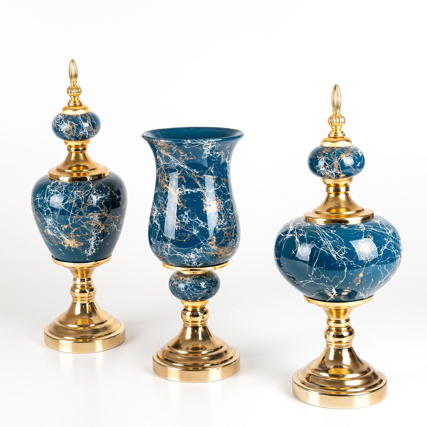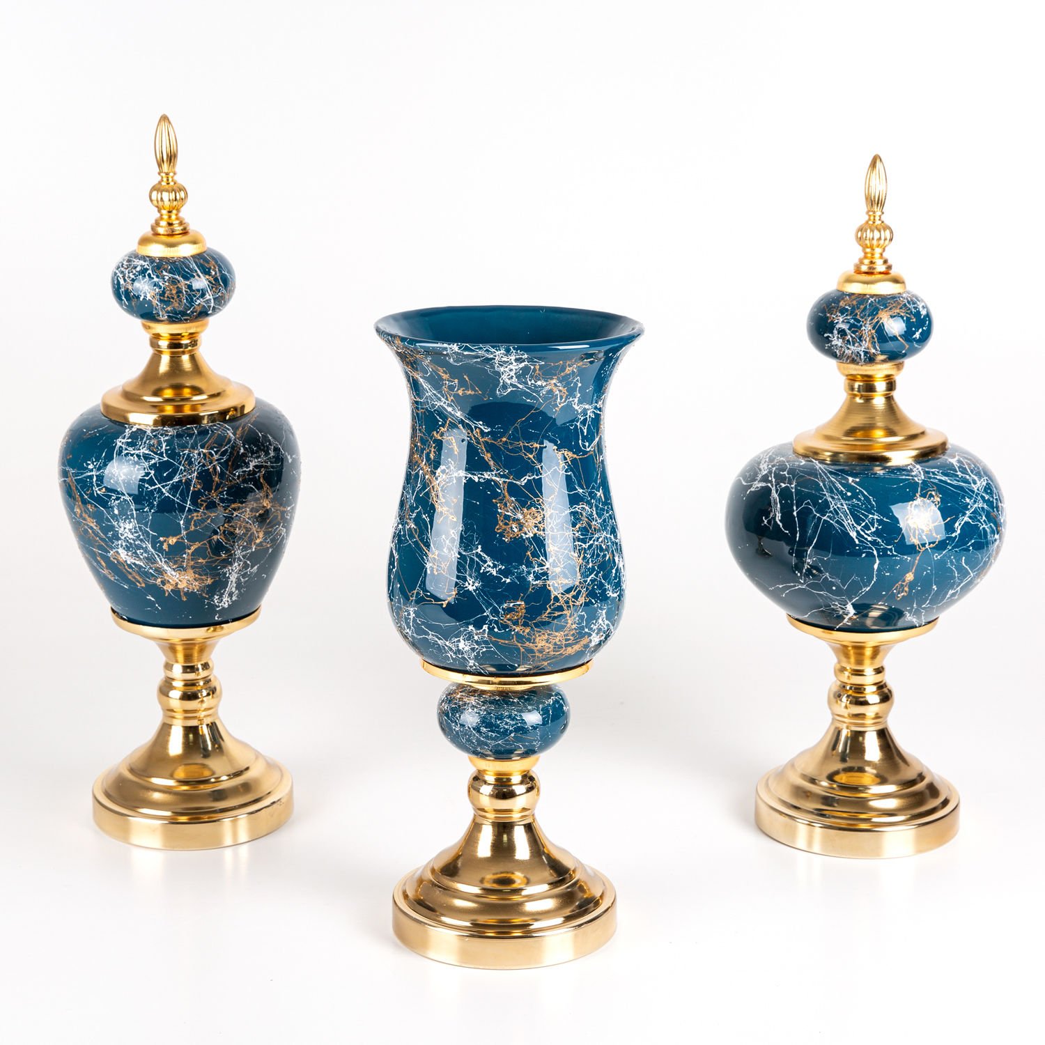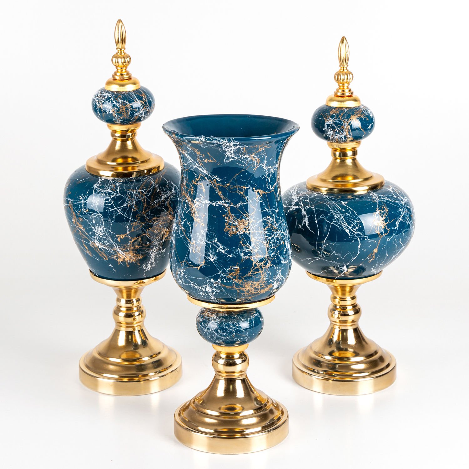 Seramik Prestij Küp Vazo Mermer Görünümlü 3'lü Set Gece Mavisi