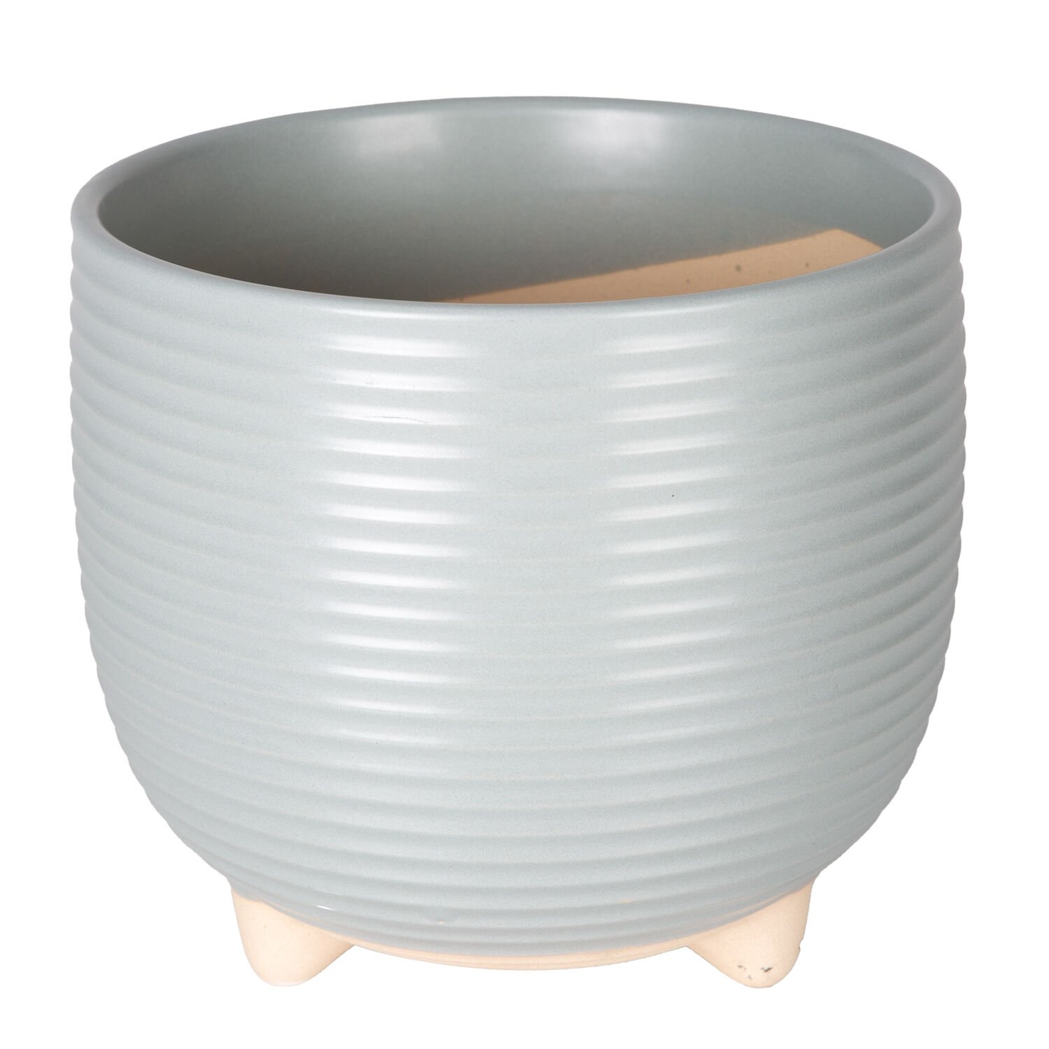 Seramik Saksı, Ayaklı, Yatay Kabartma Çizgili, Pudra Mavi - 21x18,5 cm