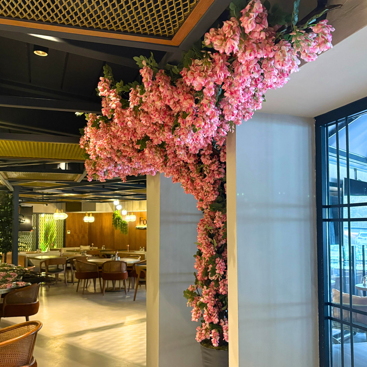 Tasarım ve Malzeme Seçimi: Mekanın ruhuna en uygun çiçek olarak, doğal ve akıcı bir sarkma efekti veren Visterya salkımlarını seçtik. Tasarımı dijital ortamda görselleştirerek müşterimizin onayına sunduk.